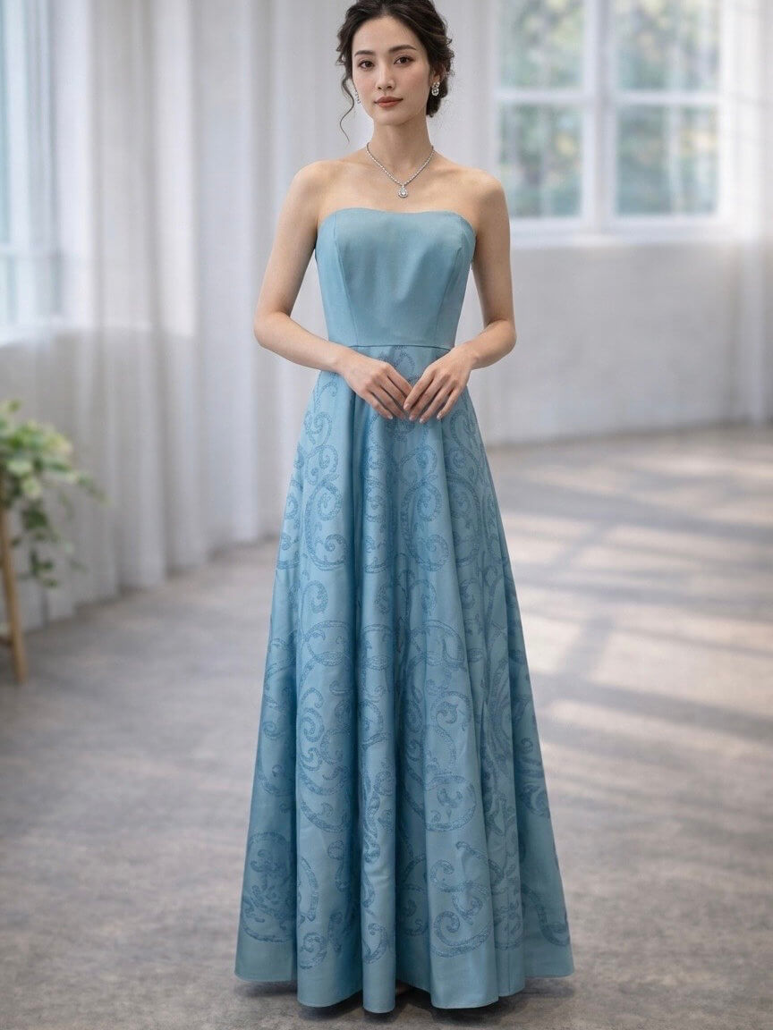 ◇商品について:まるでマーメイドのような鮮やかなターコイズブルーのベアロングドレス。ウエスト部分の内側にはずれ落ち防止に調整機能がついています。演奏会やご自身の二次会ドレス、前撮り、撮影、ステージ衣装に。
