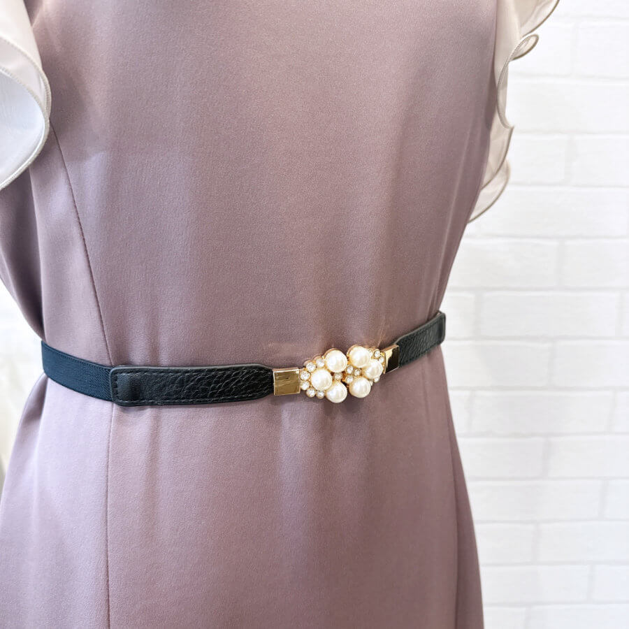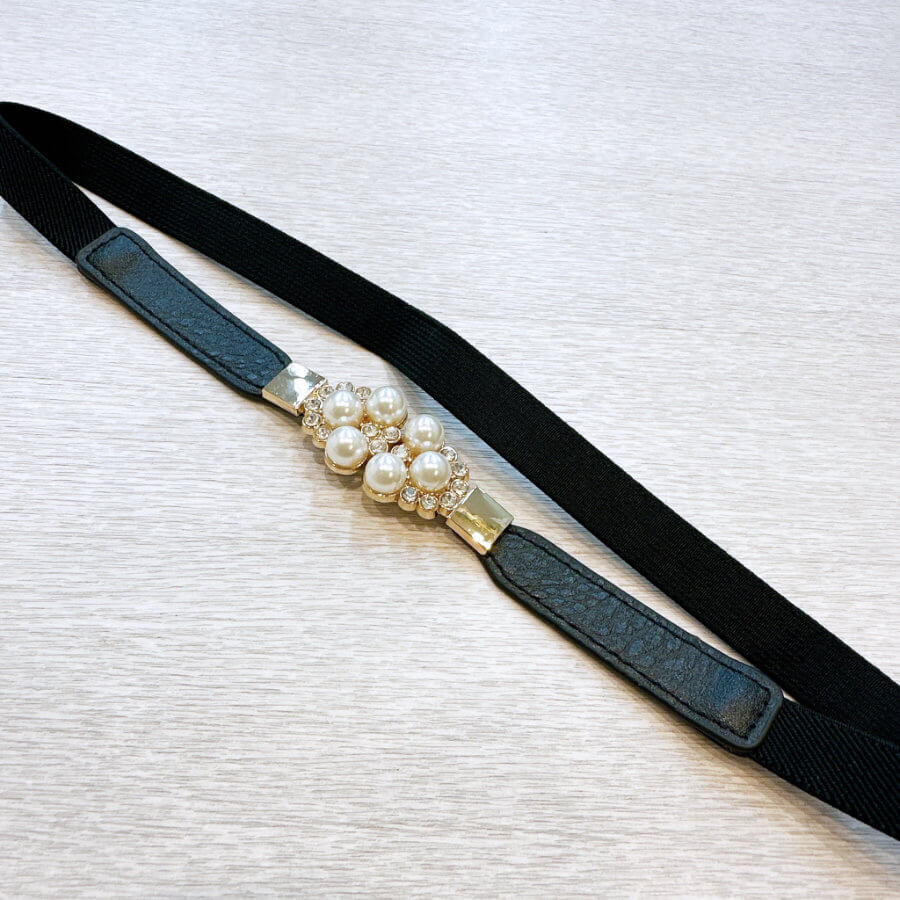 パール×ラインストーンバックルベルト ブラック ゴムなので伸縮性あり Mサイズ~2Lサイズ(66~110cm)まで対応します