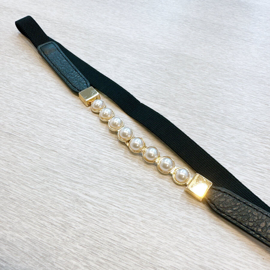 パール×ラインストーンバックルベルト ブラック ゴムなので伸縮性あり Mサイズ~2Lサイズ(66~110cm)まで対応します。