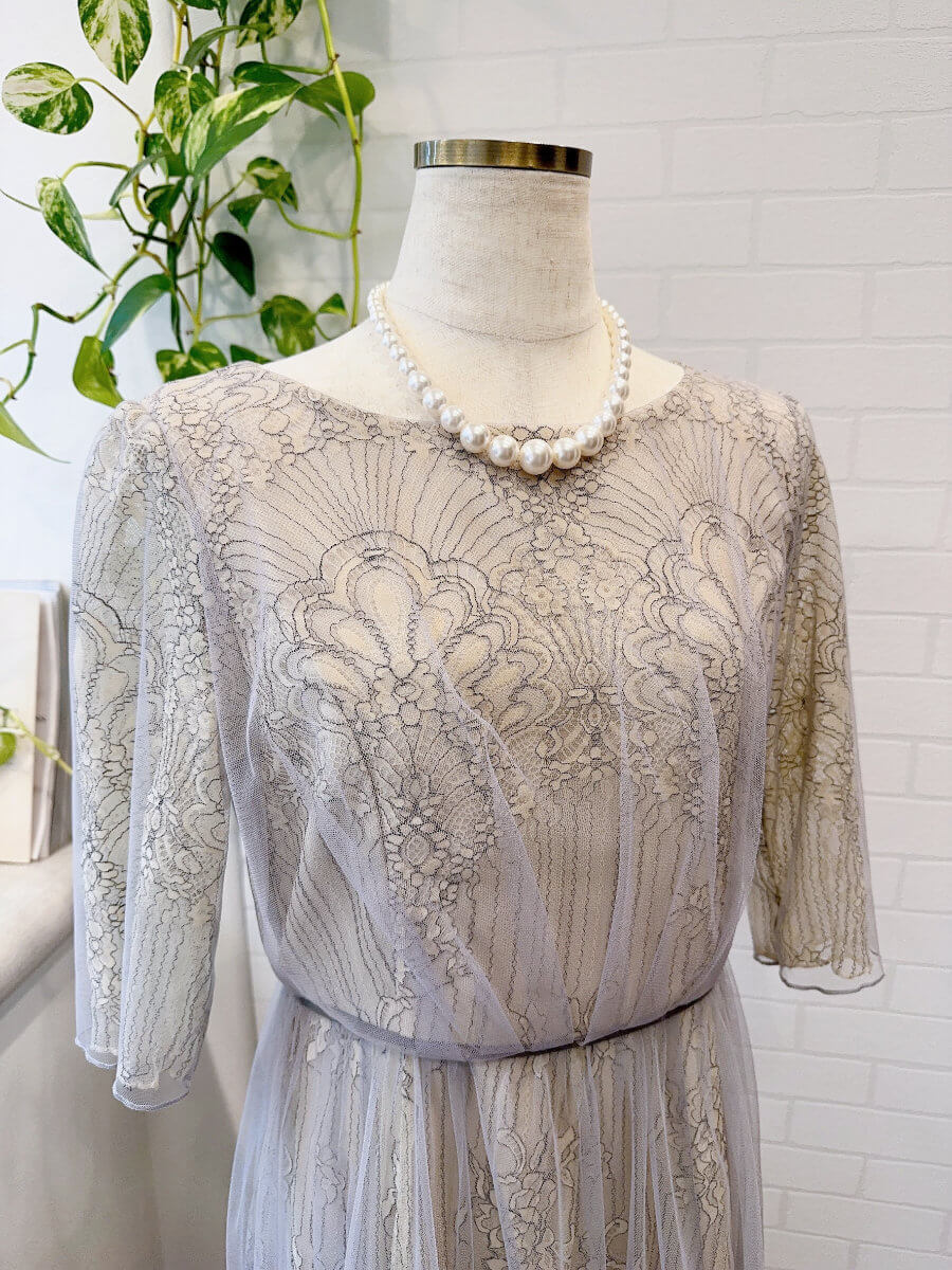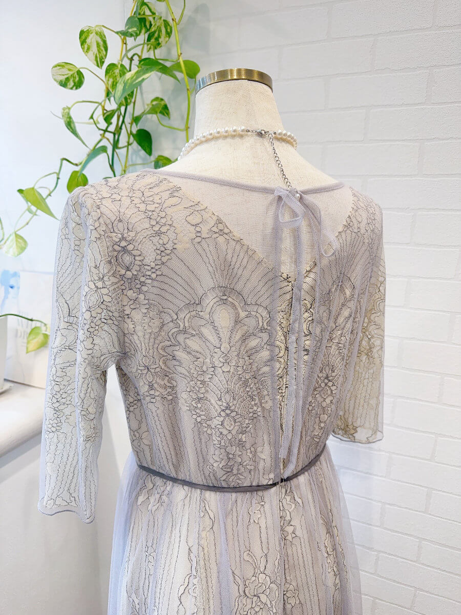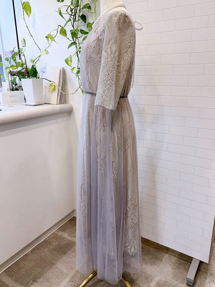 ◇商品について:ベージュのインナーにベージュのレースその上からグレーのチュールをレイヤードさせたドレスです。チュールの重なる部分で出る濃いめの色合いがメリハリのポイント。首元はチュール生地でリボンを結ぶデザインで大人可愛いドレスです。高身長の方も安心して着れる丈感です。ウエストサイズは調整が出来ない為大きい場合にはベルト合わせも可愛いです。