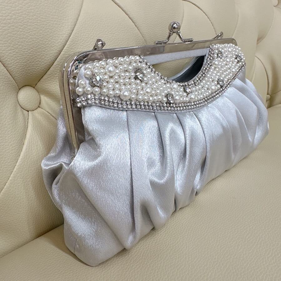 ◇商品について:光沢のある生地にパールとビジューがふんだんにデザインされています。内側のポケットは蓋つきなので鍵など大切なものを安心して収納できます。ベージュとネイビーはゴールドの金具とチェーン、シルバーのみシルバーの金具とチェーンが付属します。