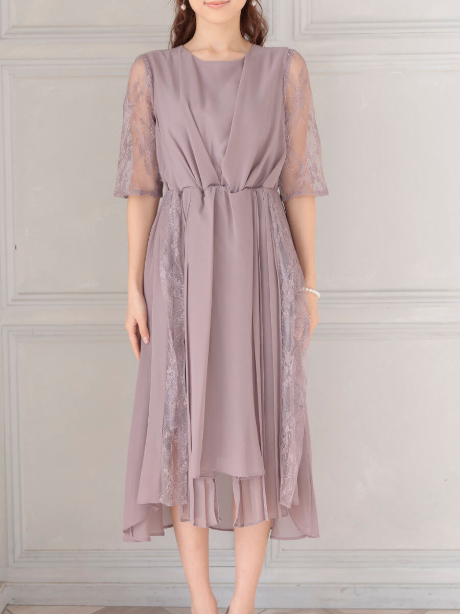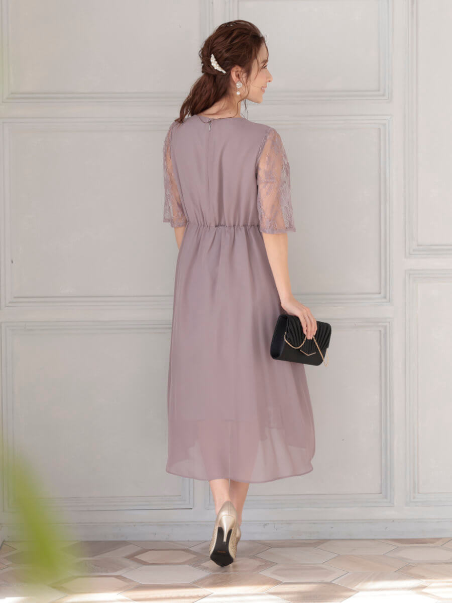 ◇商品について:フロントから後ろに掛けてスカートの裾がランダムに長くなるフィッシュテールドレス。トップスはウエストにかけてVラインのドレープを作っておりシャープに見えるようデザインされています。ウエストはゴムで伸縮性があり。裾に動きのあるスカートがかわいいドレスです。袖のレースはゆったりめで気になる二の腕もうまくカバーしてくれます。