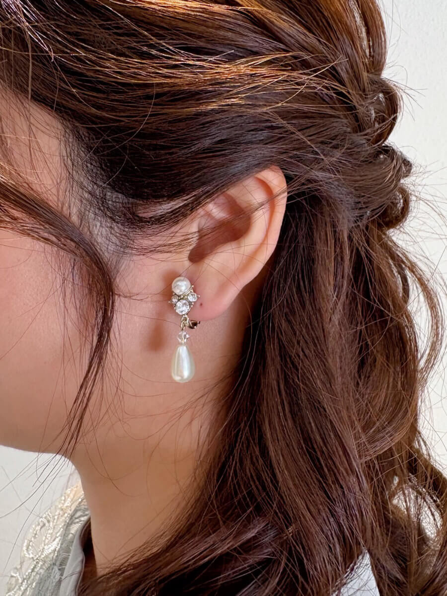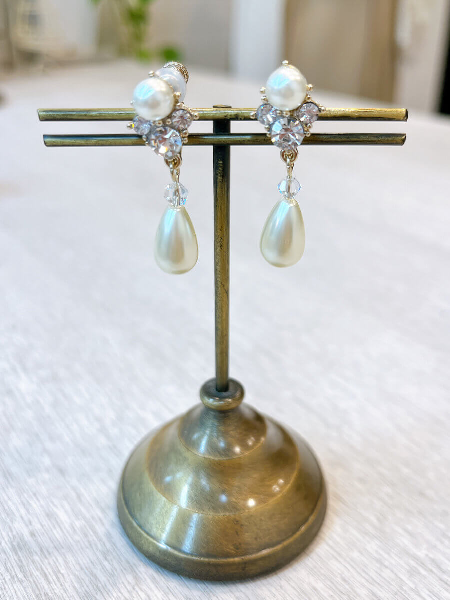 イヤリング パール×ラインストーン ドロップ型のパールチャームにビジューのデザイン