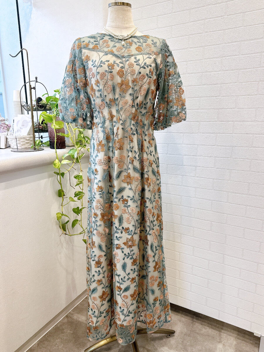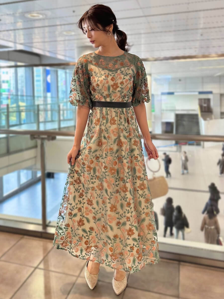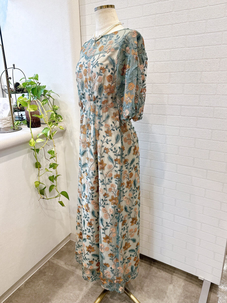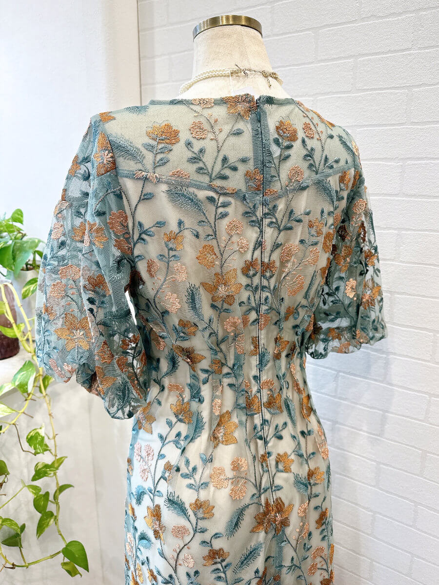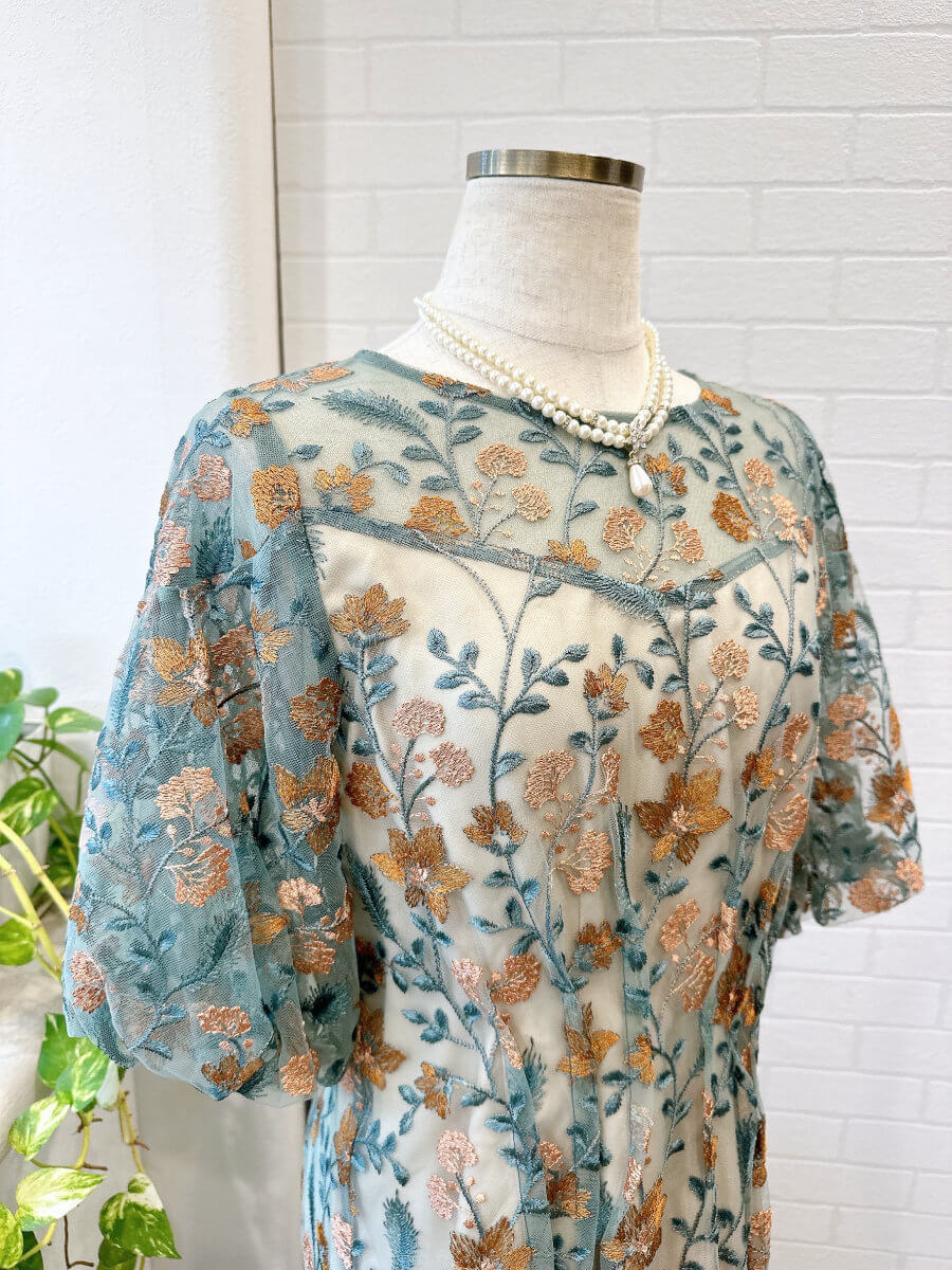 ◇商品について:シャンパンベージュのインナーにグリーンのチュールを重ねてその上からオレンジやグリーンで刺繍でデザインしたバルーン袖のドレスです。長めの袖が気になる二の腕をしっかりカバー。実はウエストに細かいタックが入っていて締めすぎてないのにすっきり足長効果のあるドレスです。