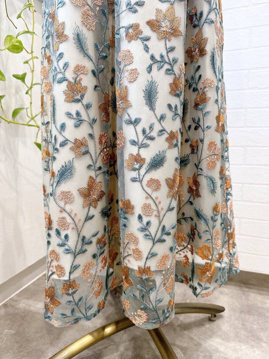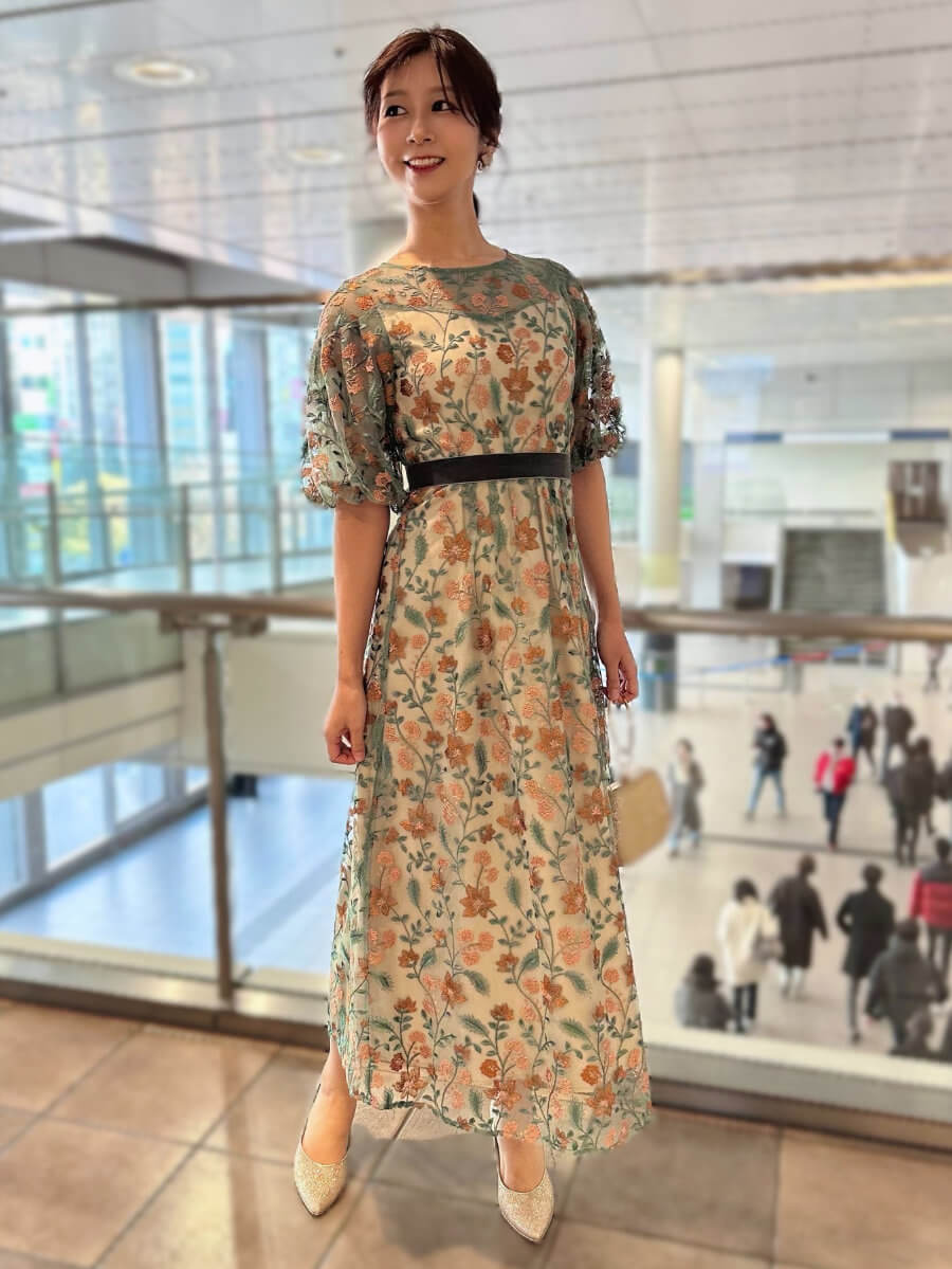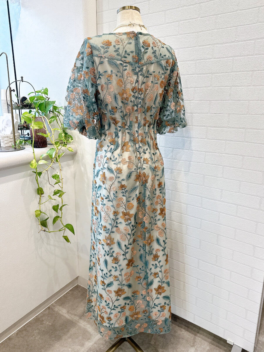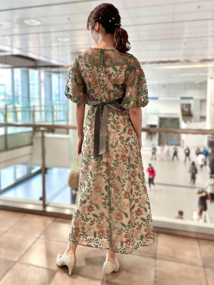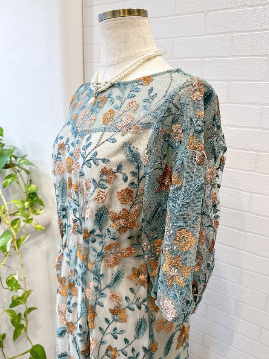 ◇商品について:シャンパンベージュのインナーにグリーンのチュールを重ねてその上からオレンジやグリーンで刺繍でデザインしたバルーン袖のドレスです。長めの袖が気になる二の腕をしっかりカバー。実はウエストに細かいタックが入っていて締めすぎてないのにすっきり足長効果のあるドレスです。