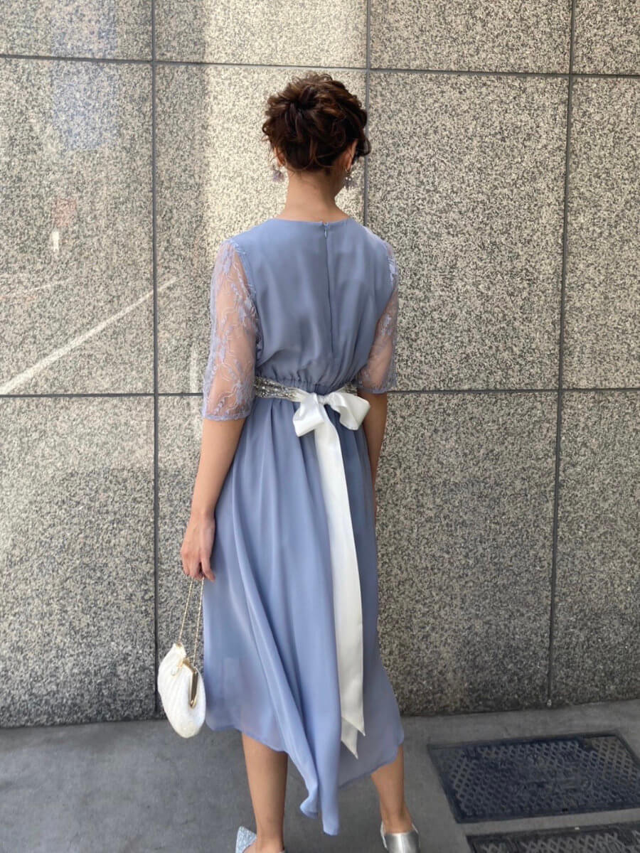 ◇商品について:フロントから後ろに掛けてスカートの裾がランダムに長くなるフィッシュテールドレス。トップスはウエストにかけてVラインのドレープを作っておりシャープに見えるようデザインされています。ウエストはゴムで伸縮性があり。裾に動きのあるスカートがかわいいドレスです。袖のレースはゆったりめで気になる二の腕もうまくカバーしてくれます。