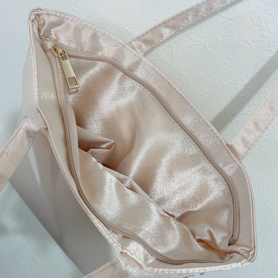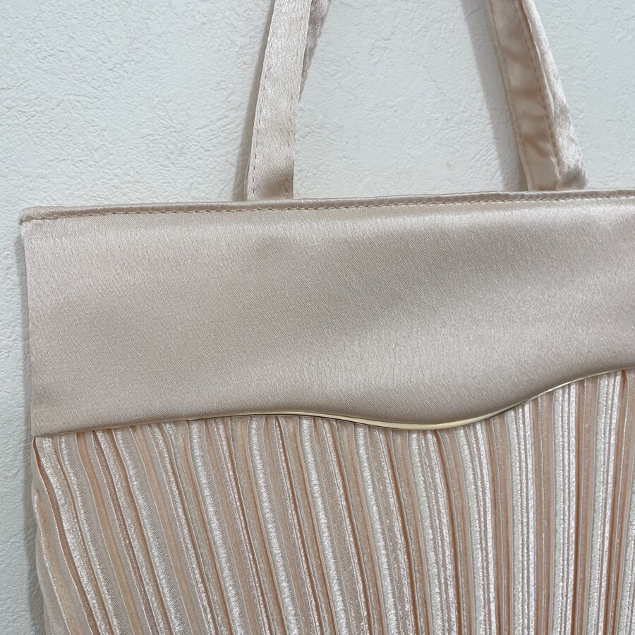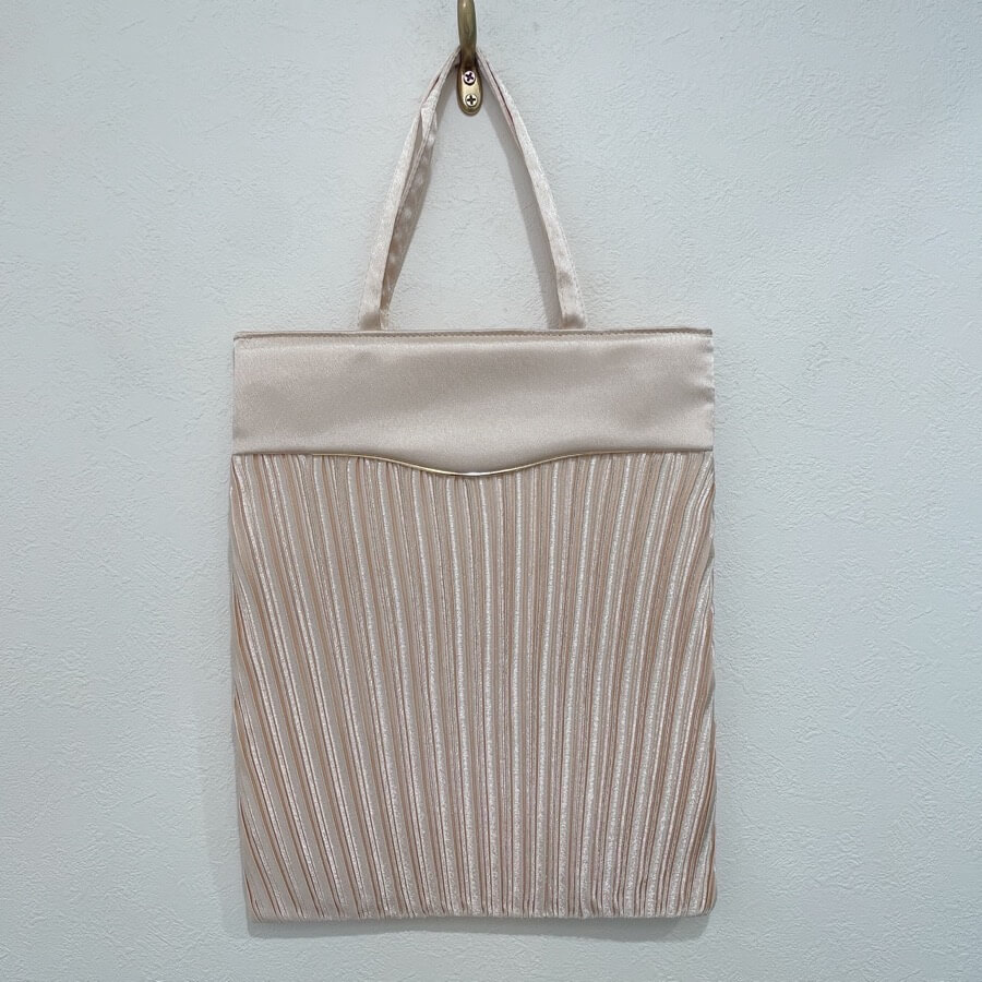 ◇商品について:大き目のサブバッグです。上部がチャックでしまるので、安心してご利用頂けます。色々お持ちになりたい方にどうぞ。プリーツ素材にゴールドの金具がデザインされています。光沢のある生地で上品なお品です。