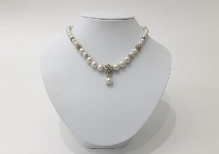 ◇カラー:パール×ゴールド ◇商品について:大小異なるパールが連なったゴージャスなネックレスです。ラインストーンとゴールドボール、ロンデルのデザインです。