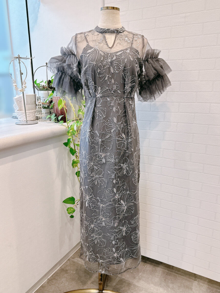 ◇商品について:大人シルエットのレースドレス。レース部分にはシルバーのスパンコールがデザインされていてさりげなく輝きます。袖のチュールも程よいボリューム感で着心地がよく、デコルテ部分の抜け感で首のつまり具合が苦手な方も着やすいドレスです。大人っぽいタイトシルエットもクールのおかげで体型を拾いにくいのが嬉しいドレスです。