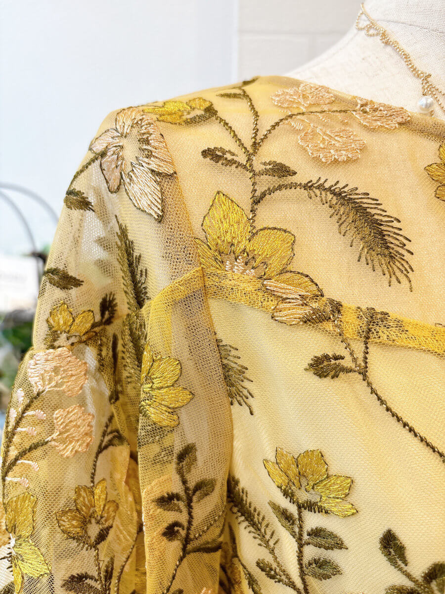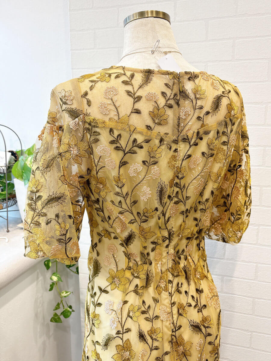 ◇商品について:シャンパンベージュのインナーにイエローのチュールを重ねてその上からマスタードやピンク、ブラウンの刺繍でデザインしたバルーン袖のドレスです。長めの袖が気になる二の腕をしっかりカバー。実はウエストに細かいタックが入っていて締めすぎてないのにすっきり足長効果のあるドレスです。