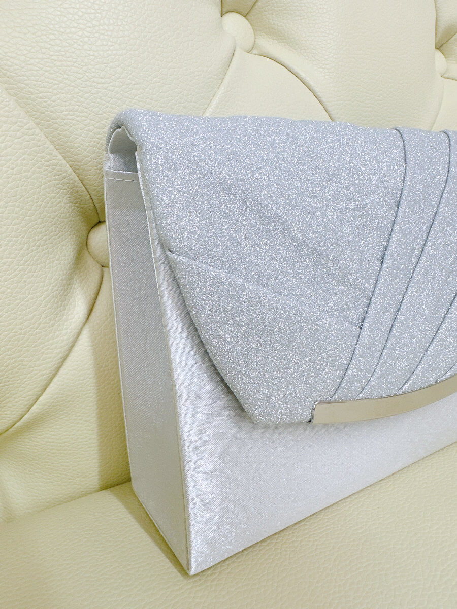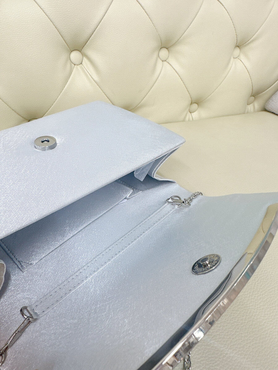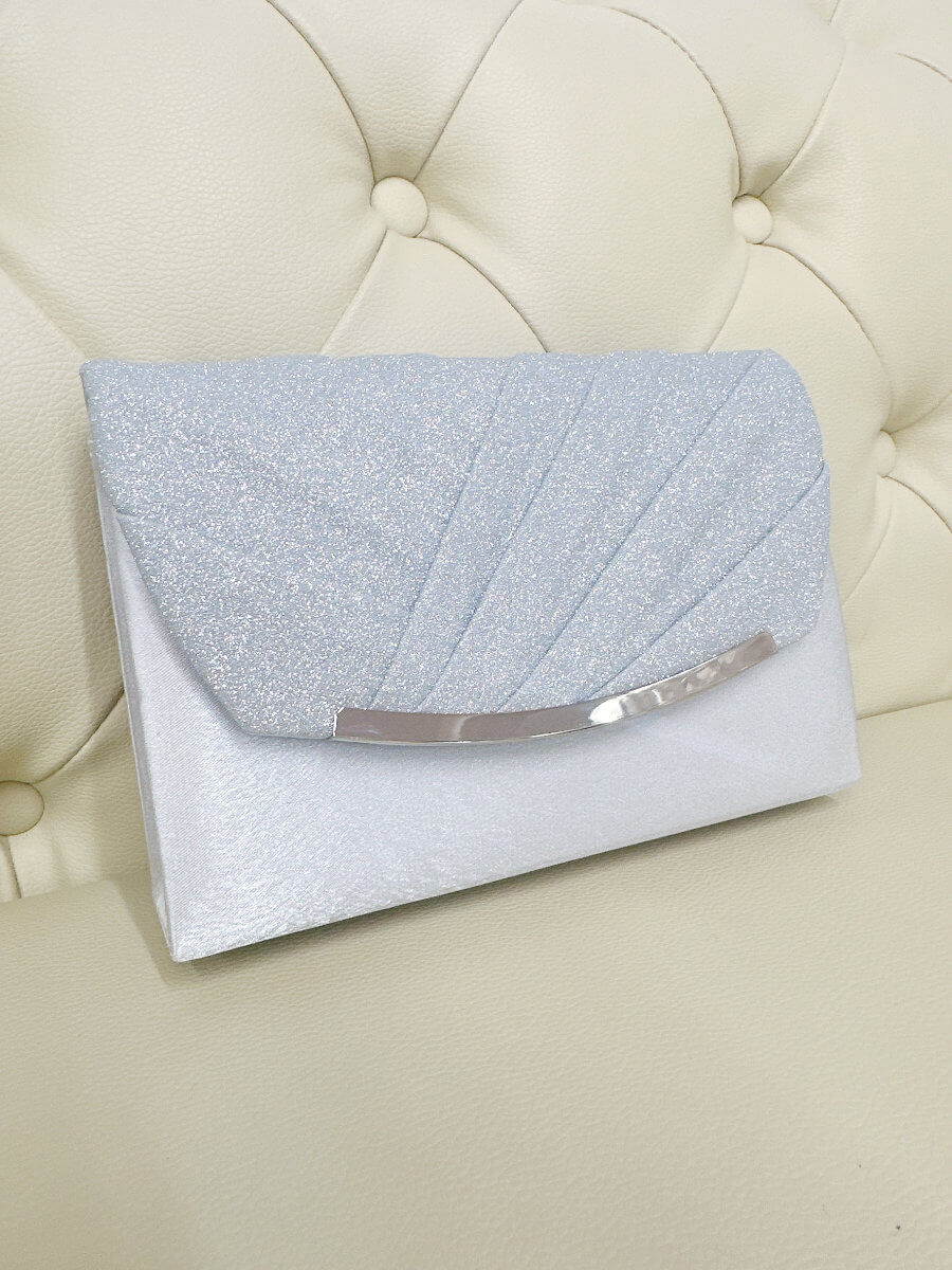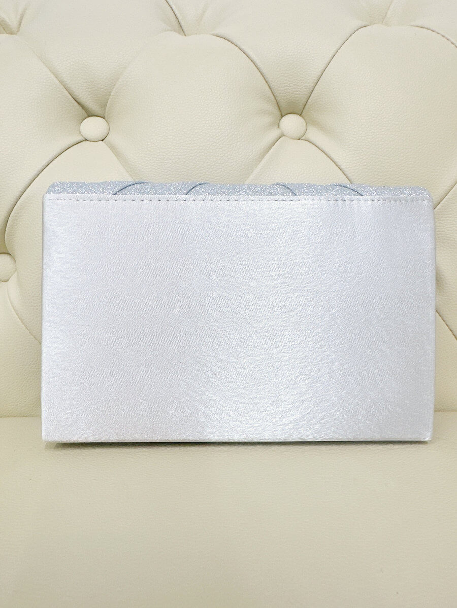 ◇カラー:シルバー ◇大きさ:横22cm 縦14.5cm マチ5.5cm ◇商品について:光沢のあるサテン生地にラメがデザインされています。シンプルな華やかさがあります。マチもしっかりしている為収納がたっぷりしやすいデザインです。