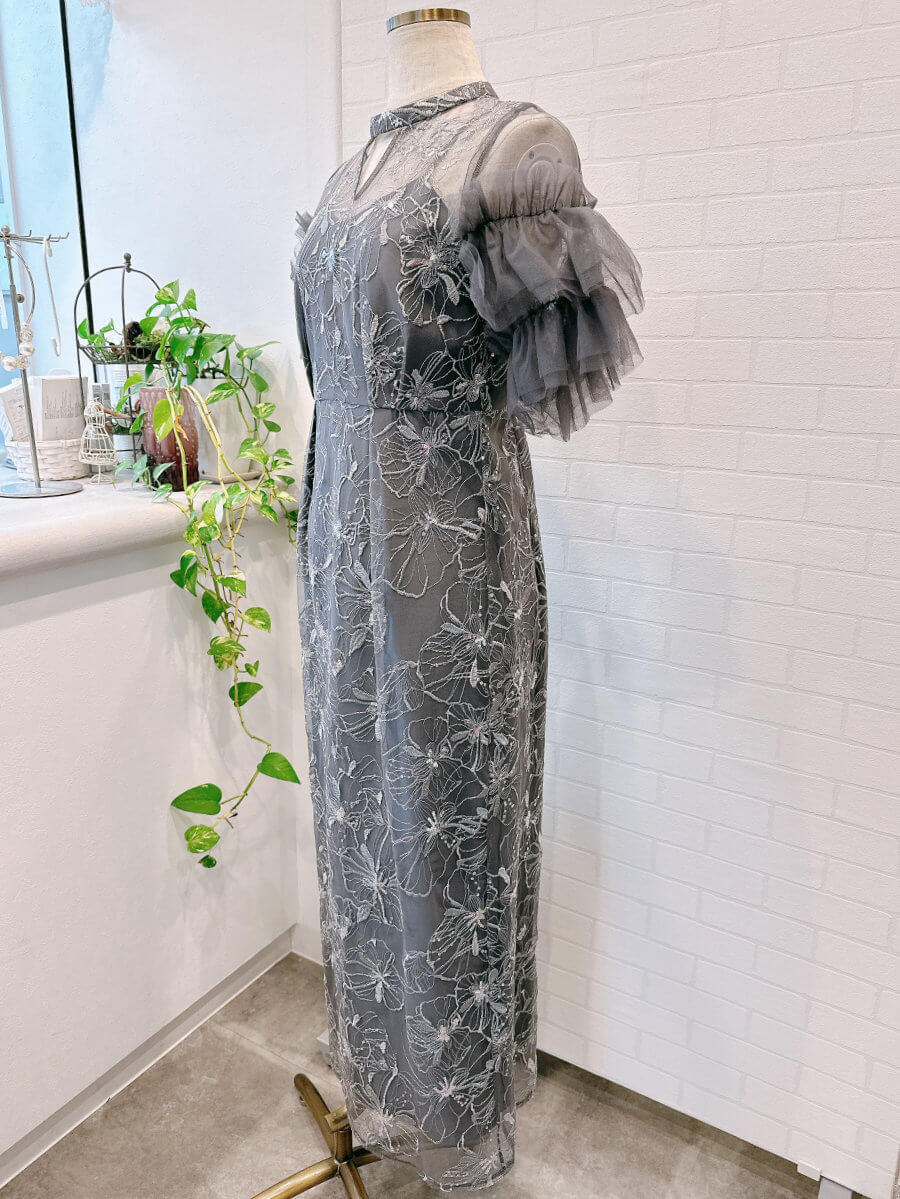 ◇商品について:大人シルエットのレースドレス。レース部分にはシルバーのスパンコールがデザインされていてさりげなく輝きます。袖のチュールも程よいボリューム感で着心地がよく、デコルテ部分の抜け感で首のつまり具合が苦手な方も着やすいドレスです。大人っぽいタイトシルエットもクールのおかげで体型を拾いにくいのが嬉しいドレスです。