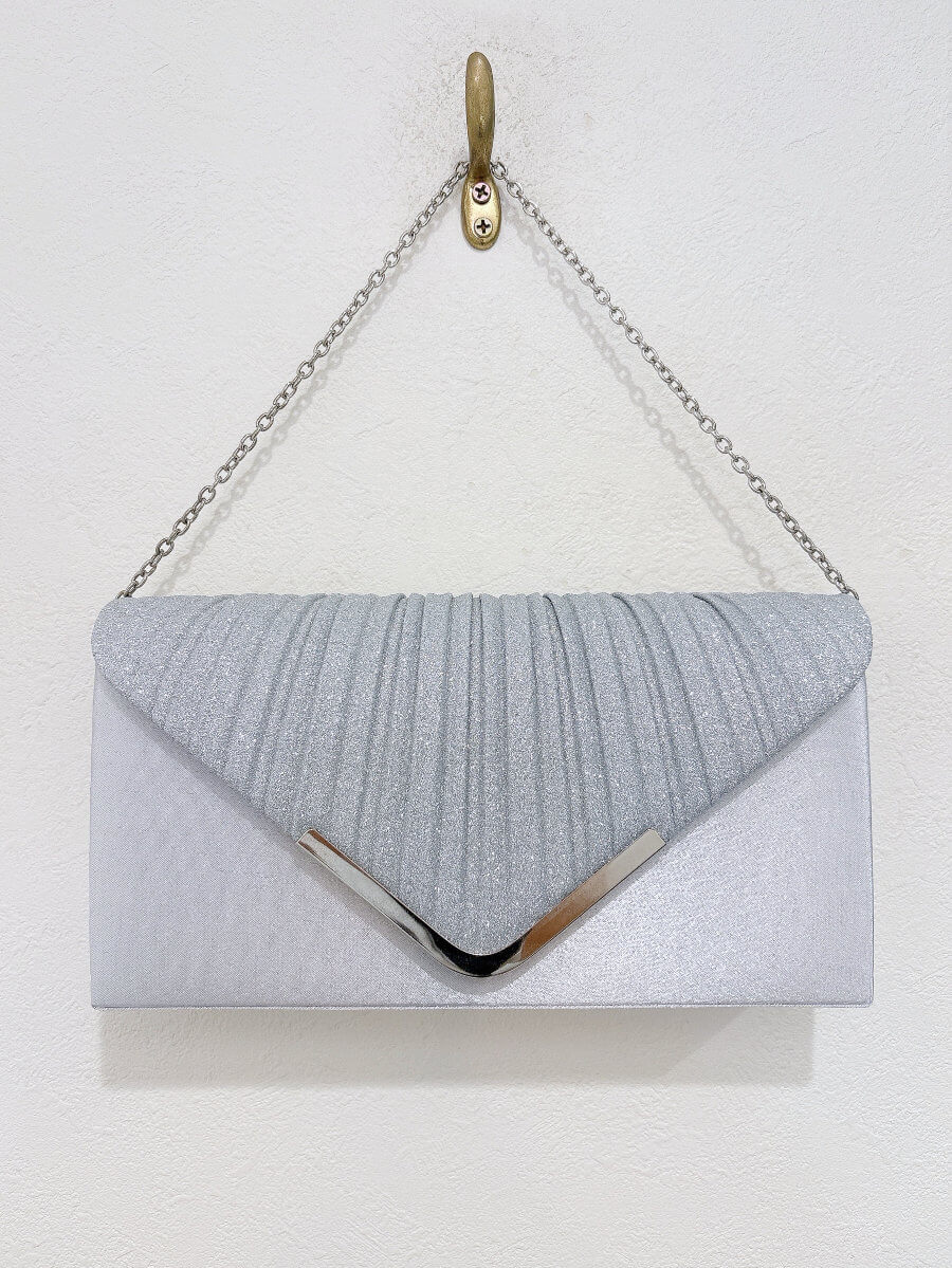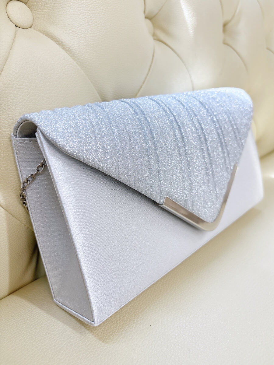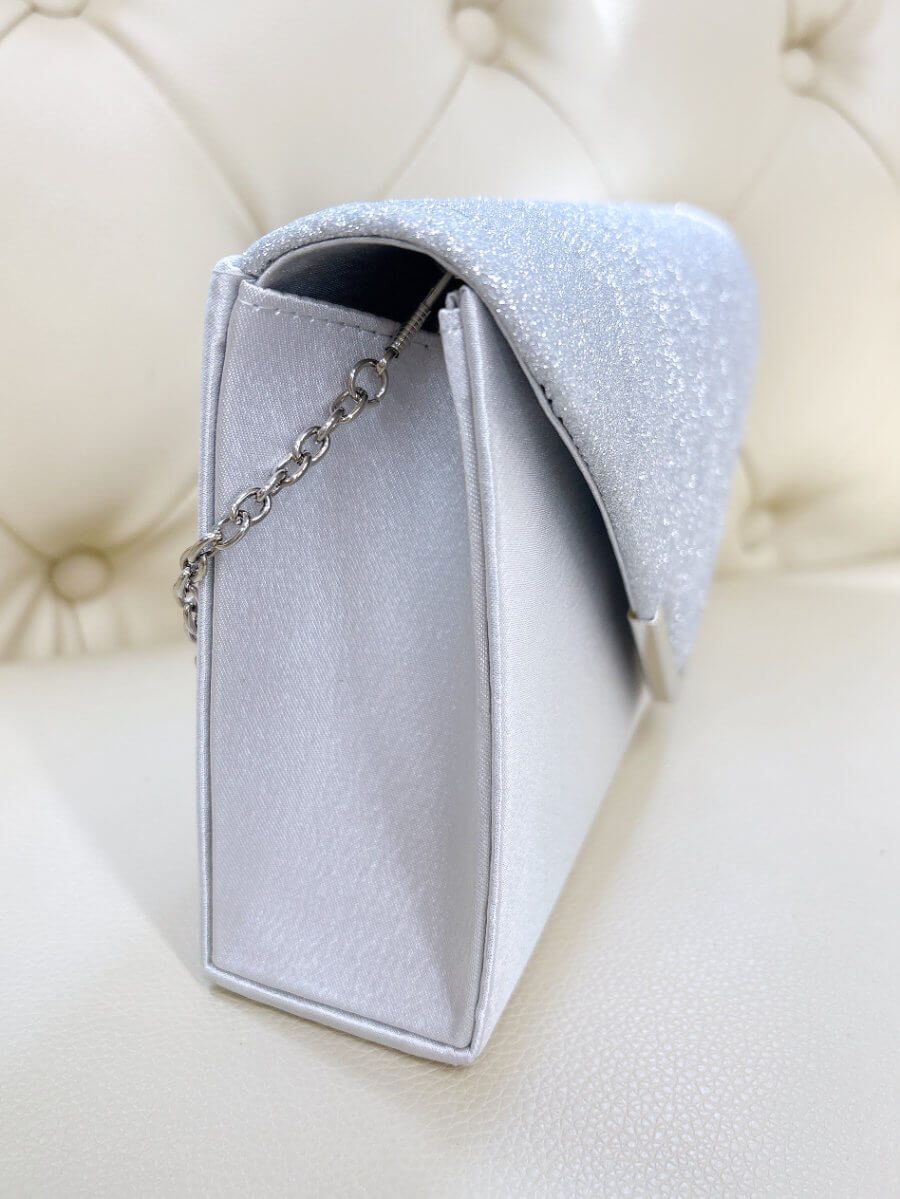 ◇カラー:シルバー×シルバーグリッター ◇大きさ:横26cm/縦13cm/マチ5cm ◇商品について:マチがあるのでしっかり収納ができます。生地もしっかりしており高級感のあるバッグです。封筒型のシルエットがスタイリッシュ。なんにでも合わせやすいシンプルさもあり使いやすいパーティバッグです。