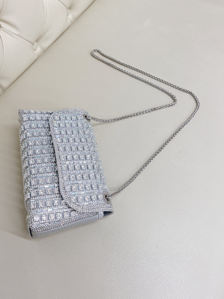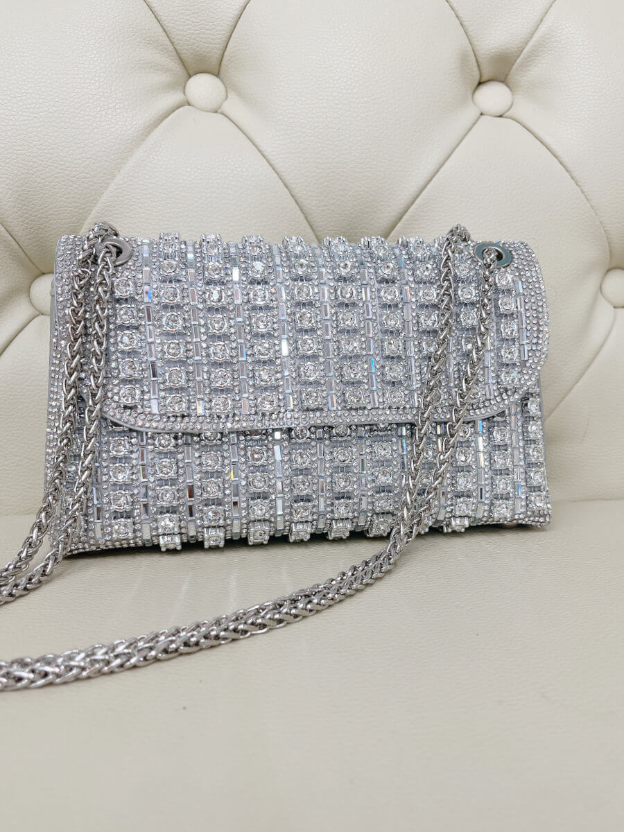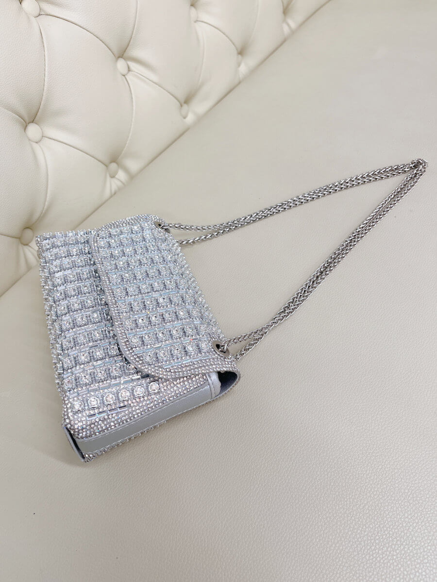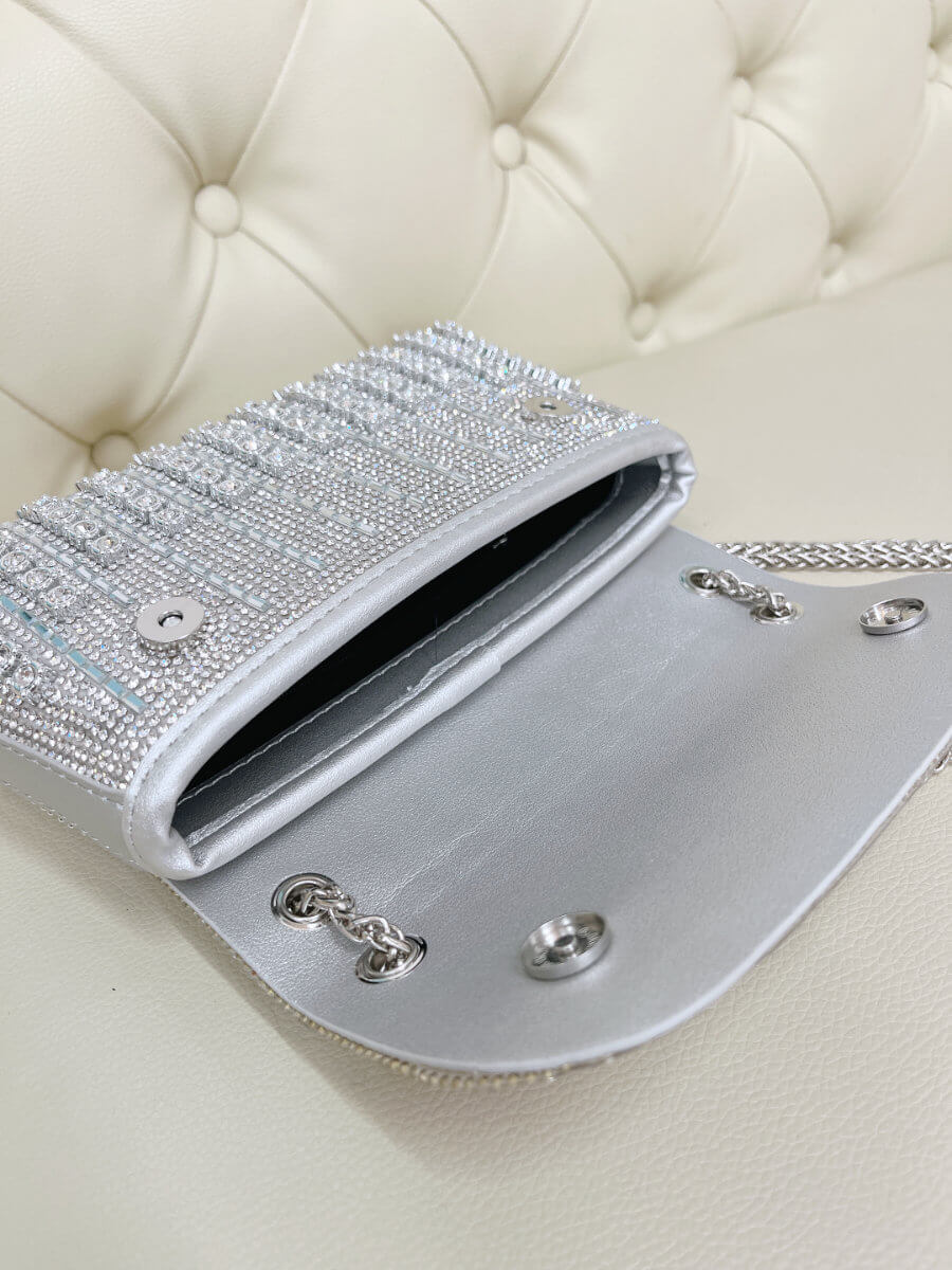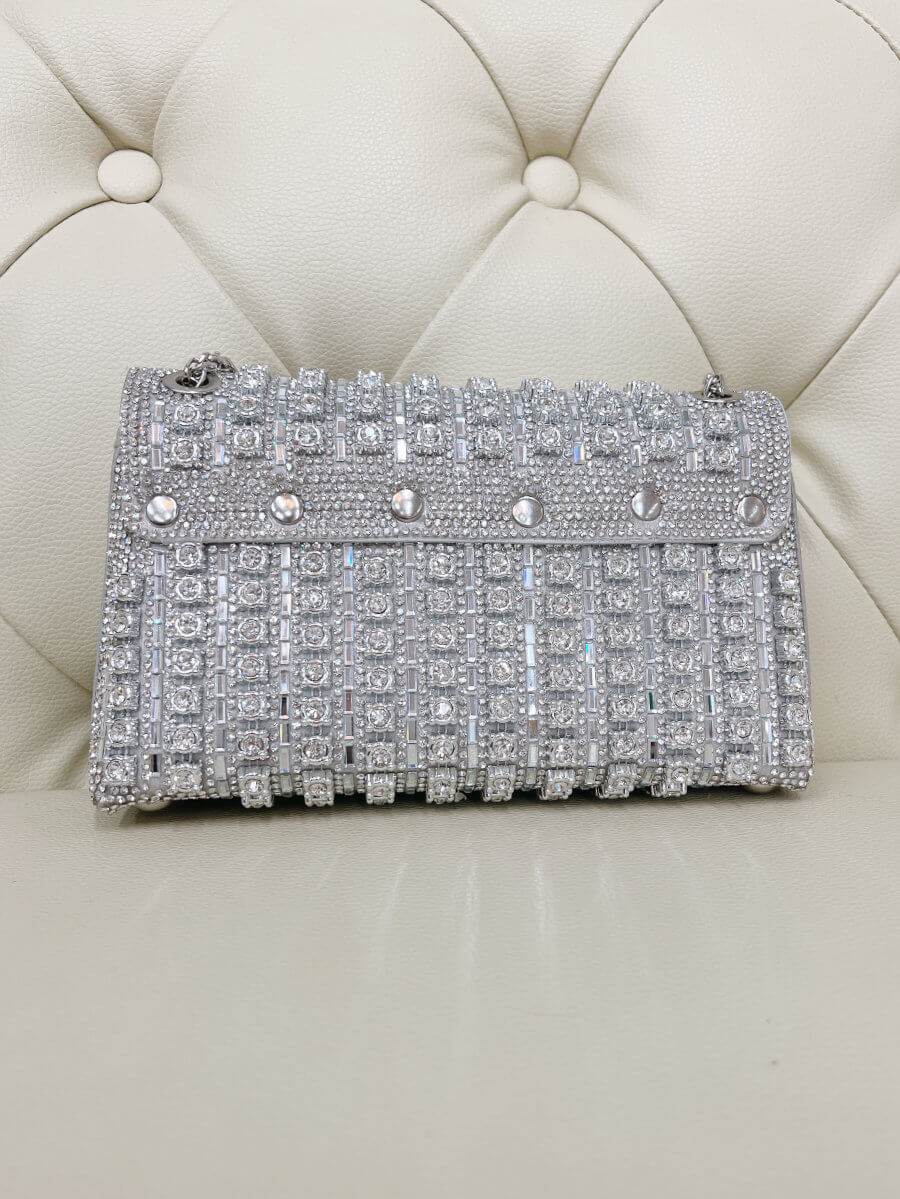 ◇カラー:シルバー ◇大きさ:横20cm. 縦11cm ◇商品について:ビジューがゴージャスで華やかなデザインです。サイドにはラインストーンでデザインが装飾されています。爪がないのでドレスに引っ掛かりにくくマチがある為取り扱いやすいパーティバッグです。 写真最後の2枚、モデルは色違いゴールドを持っています。