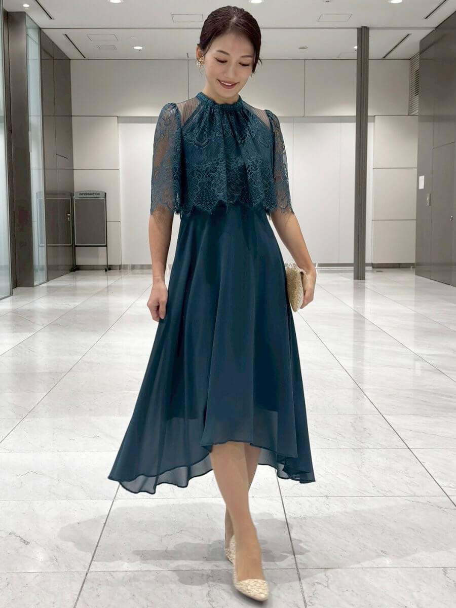◇商品について:スカラップレースとシフォン素材を組み合わせたエレガントなドレス。繊細なレースが上品で清楚系なイメージに。フィッシュテールドレスでフレアな裾に動きがでます。肩部分のレースに透け感がありハイネックのデザインにほどよい抜け感をプラスしています。