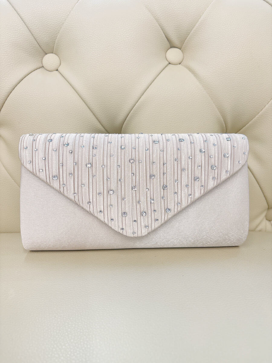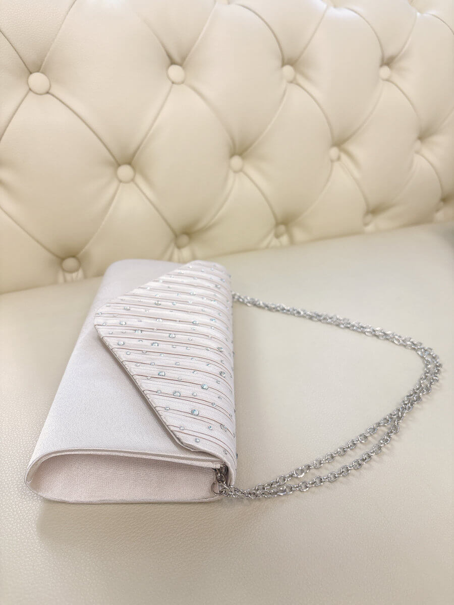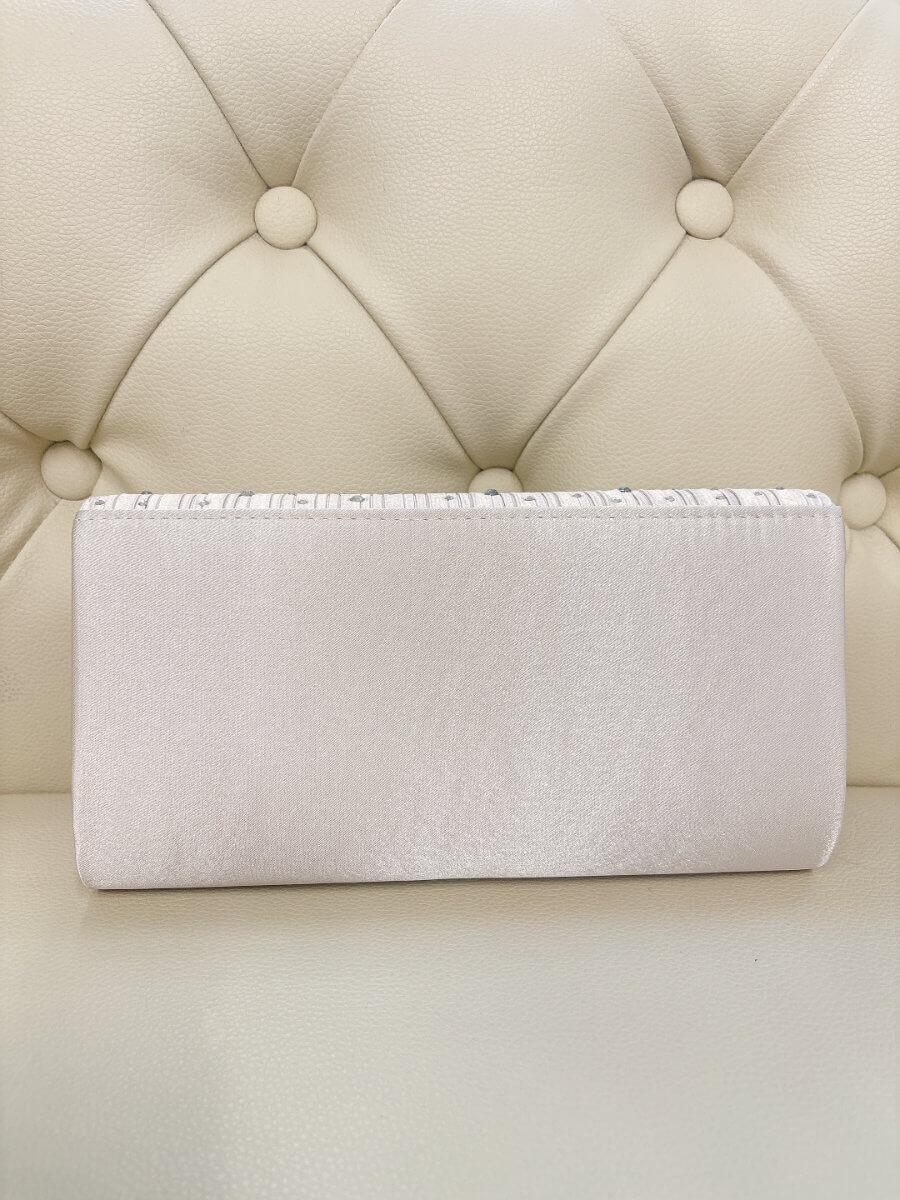 ◇カラー:ベージュ ◇大きさ:横22cm/縦12cm ◇商品について;シャンパンベージュにシルバーのラインストーンのデザインです。小ぶりで上品なパーティバッグです。