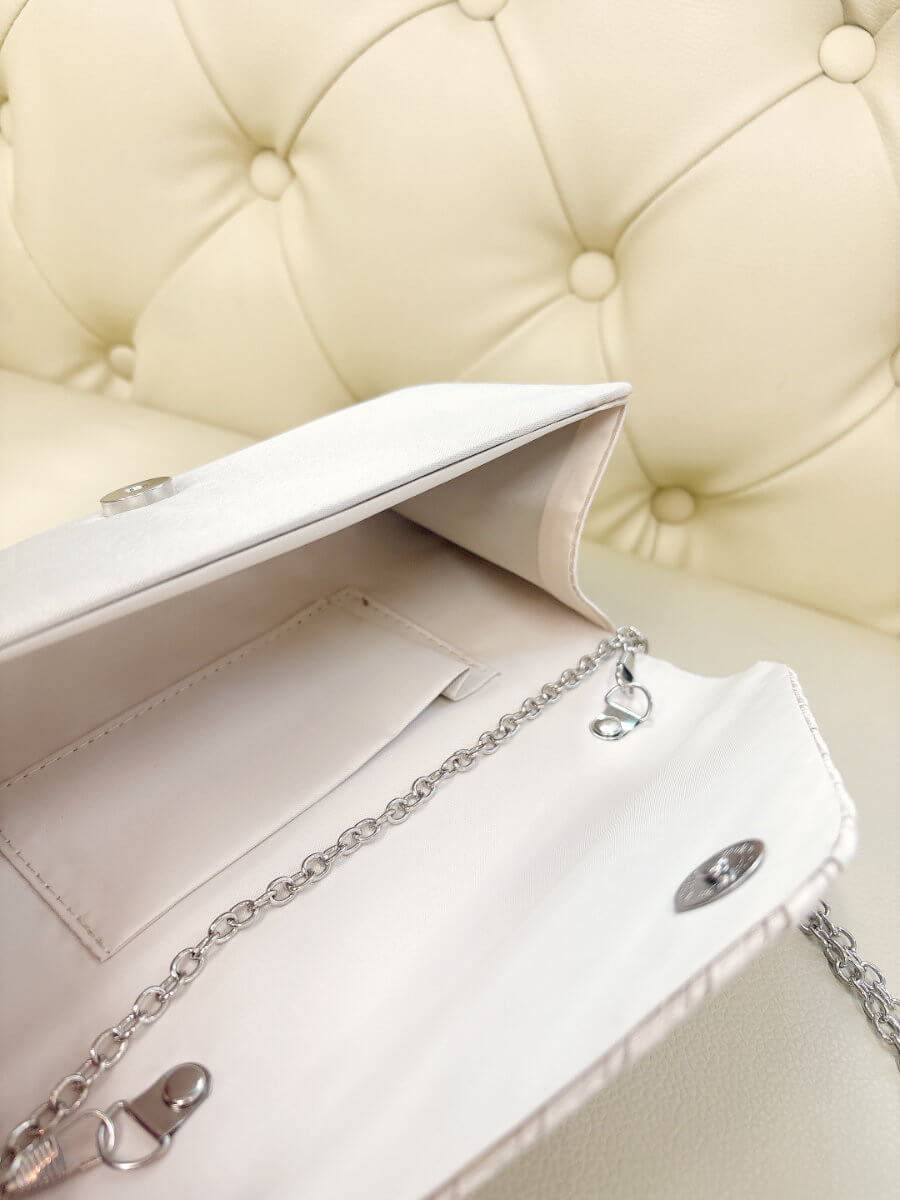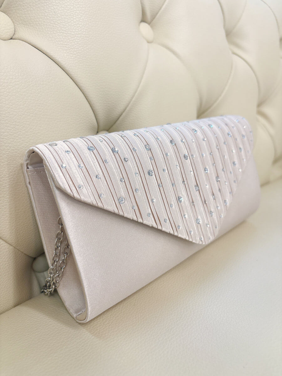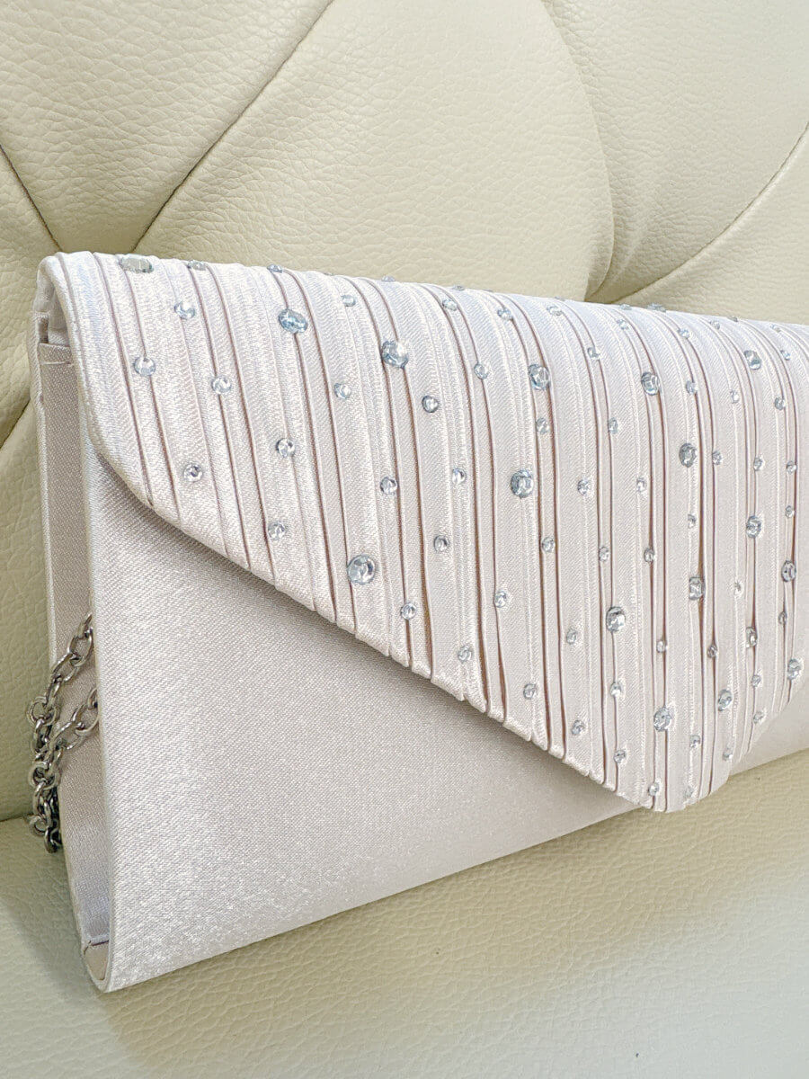 ◇カラー:ベージュ ◇大きさ:横22cm/縦12cm ◇商品について;シャンパンベージュにシルバーのラインストーンのデザインです。小ぶりで上品なパーティバッグです。