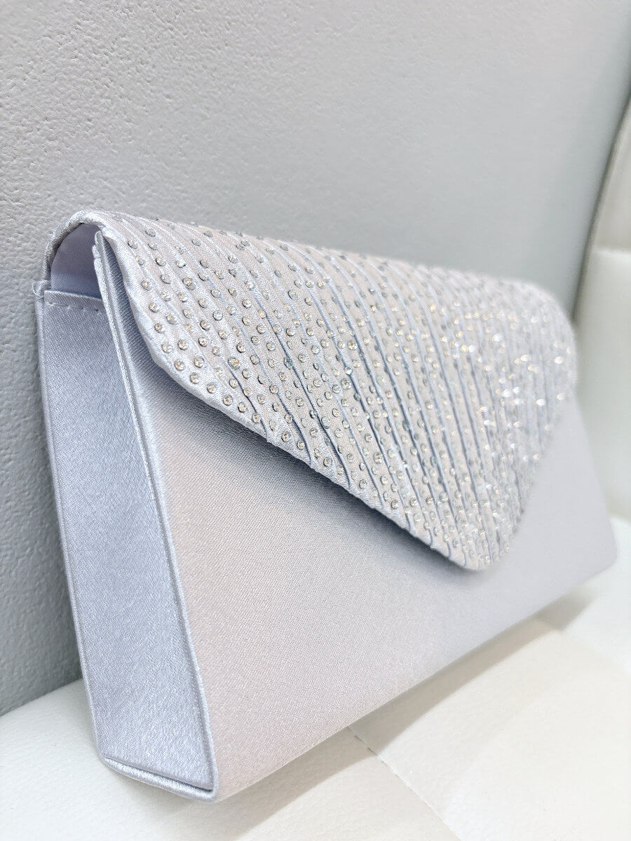◇カラー:シルバー ◇大きさ:横21cm 縦13cm ◇商品について:シンプルなシルバーのバッグです。オーロラシルバーのラインストーンが散りばめており華やかなバッグです。