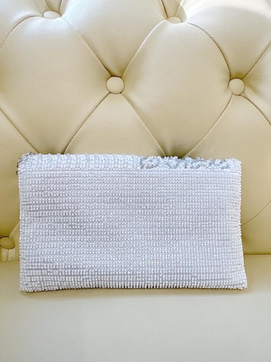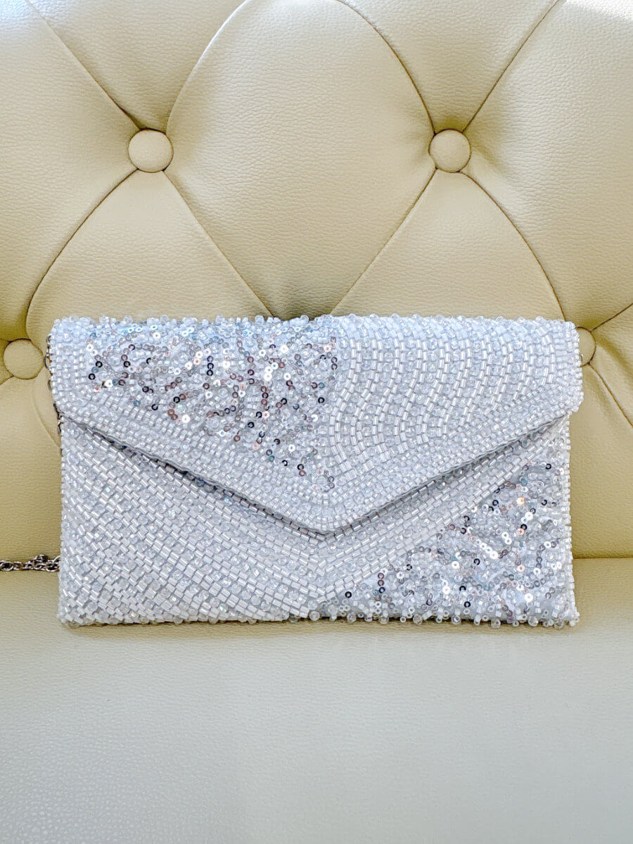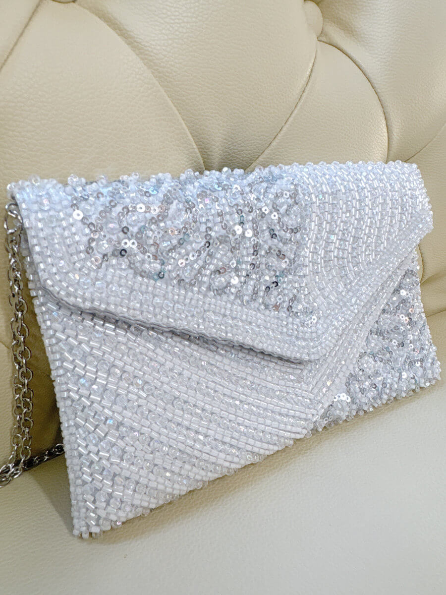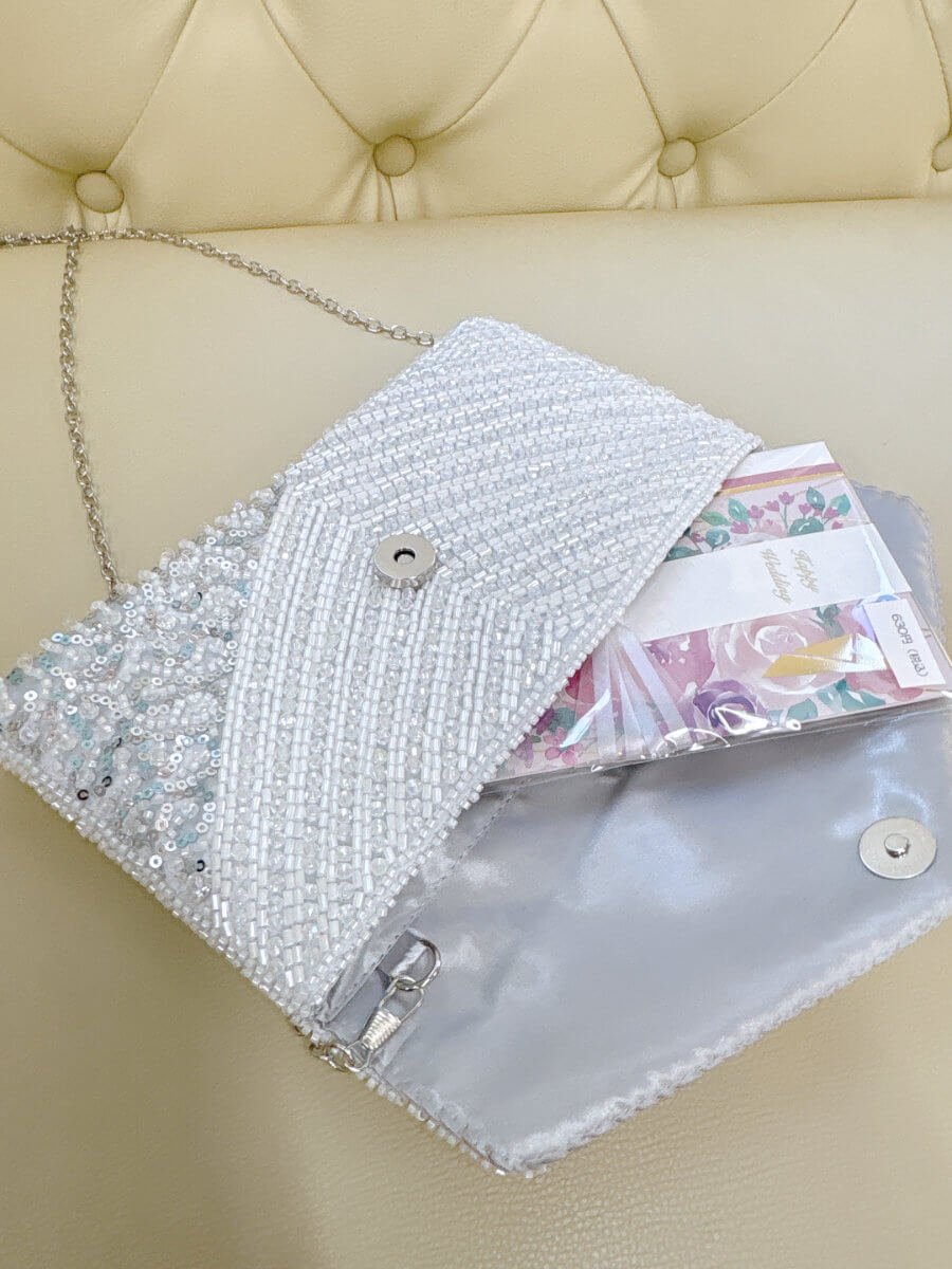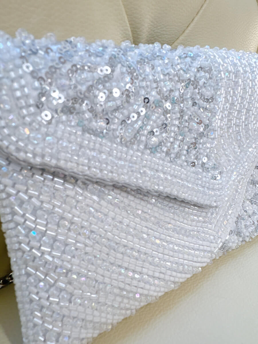◇カラー:ホワイトシルバー ◇サイズ:横23cm/縦14cm ◇商品について:ホワイトビーズとシルバースパンコールが華やかなクラッチバッグです。上品に輝きを放ちます。柔らかめの素材なので取り扱いしやすくビジューバッグ特有の重量感がありません。ご祝儀袋が収納できる大きさのパーティバッグです。シルバーのチェーンが付属します。