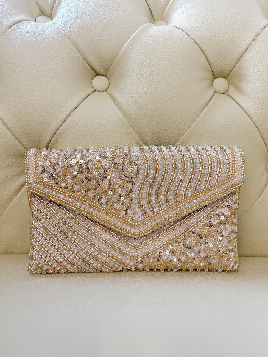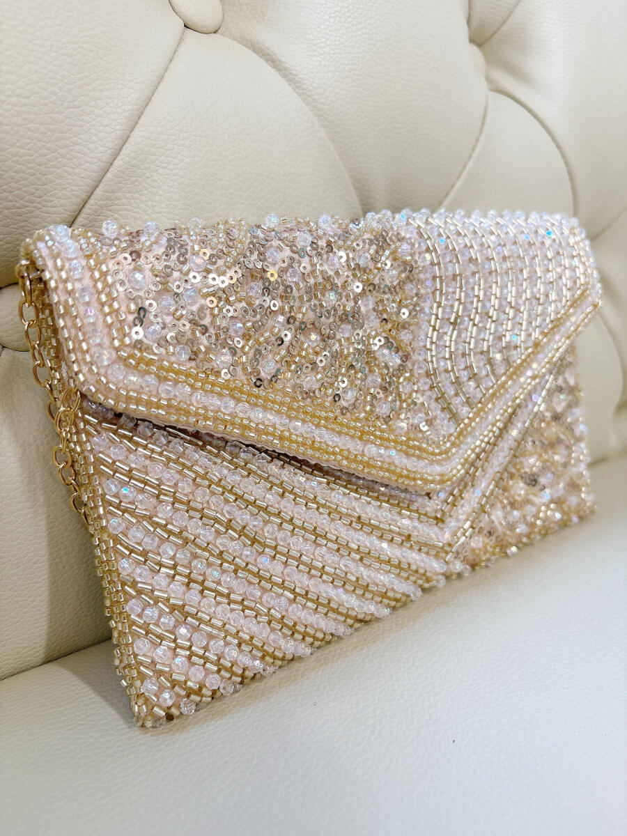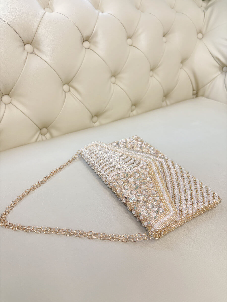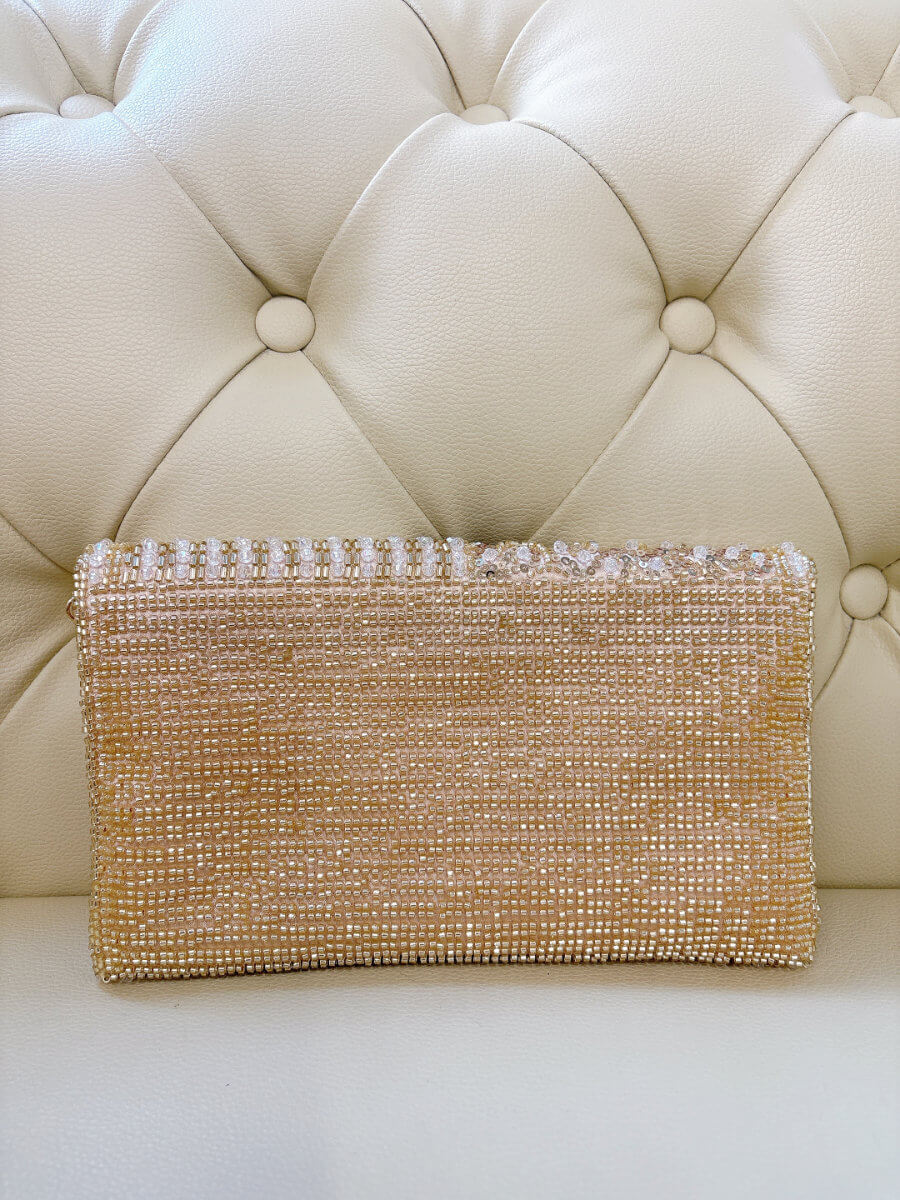 ◇カラー:イエローゴールド ◇サイズ:横23cm/縦14cm ◇商品について:ゴールド系ビーズとゴールドのスパンコールが華やかなクラッチバッグです。上品に輝きを放ちます。柔らかめの素材なので取り扱いしやすくビジューバッグ特有の重量感がありません。ご祝儀袋が収納できる大きさのパーティバッグです。ゴールドのチェーンが付属します。