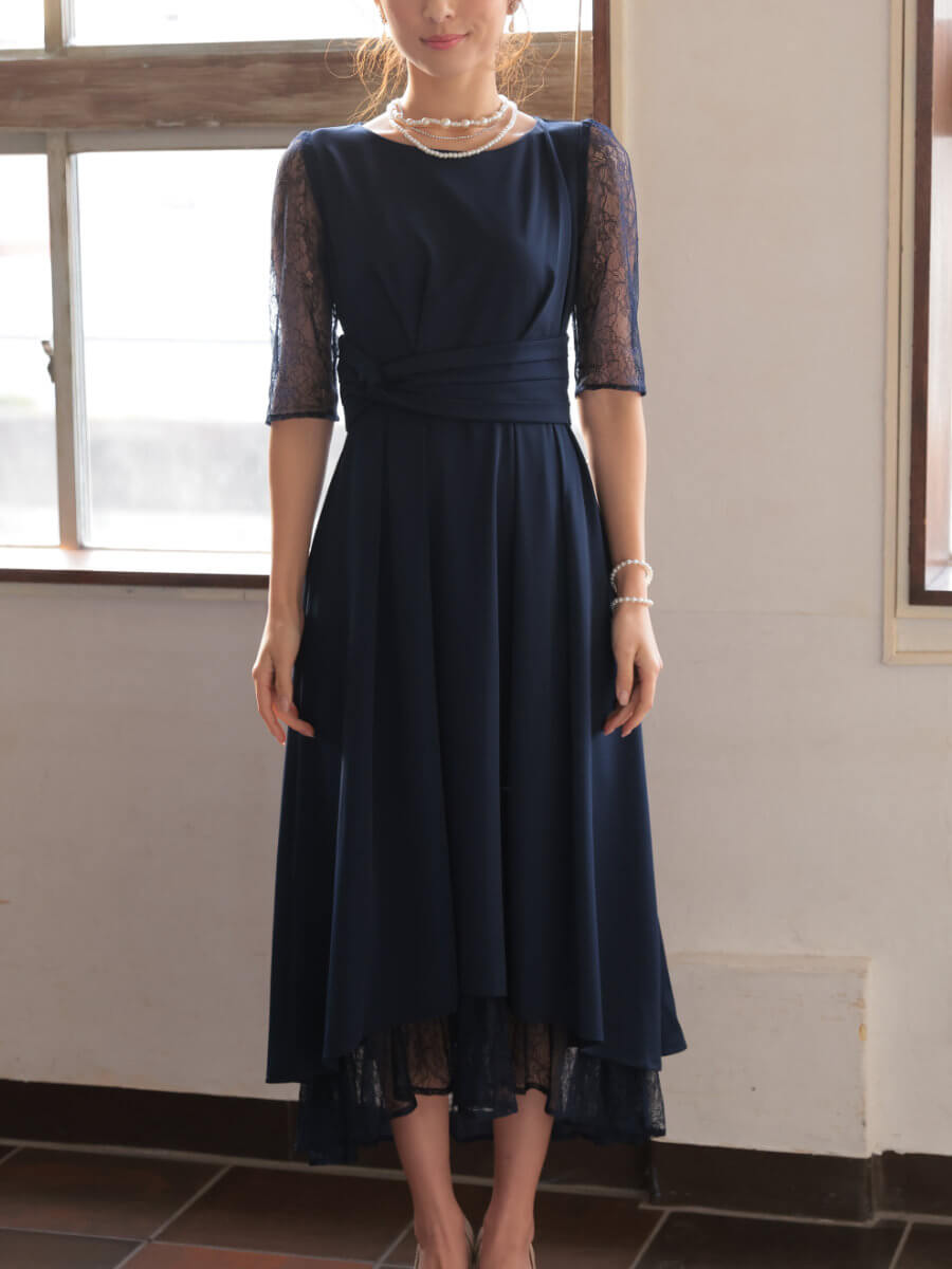 ◇商品について:光沢感のある生地にレースのインナーがレイヤード。フィッシュテールのデザインで横からの姿も美しいドレスです。ウエストは太目のラインで絞られておりレースアップドレスなのでおサイズ調整もできるため、ご自身の体型に合わせて着れるドレスです。定番ドレスとして様々なシーンでご着用できます。