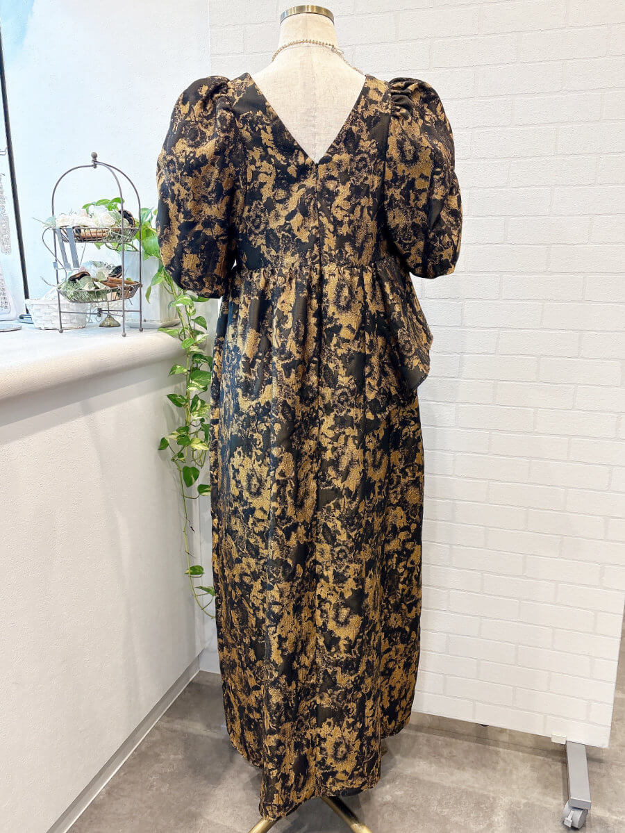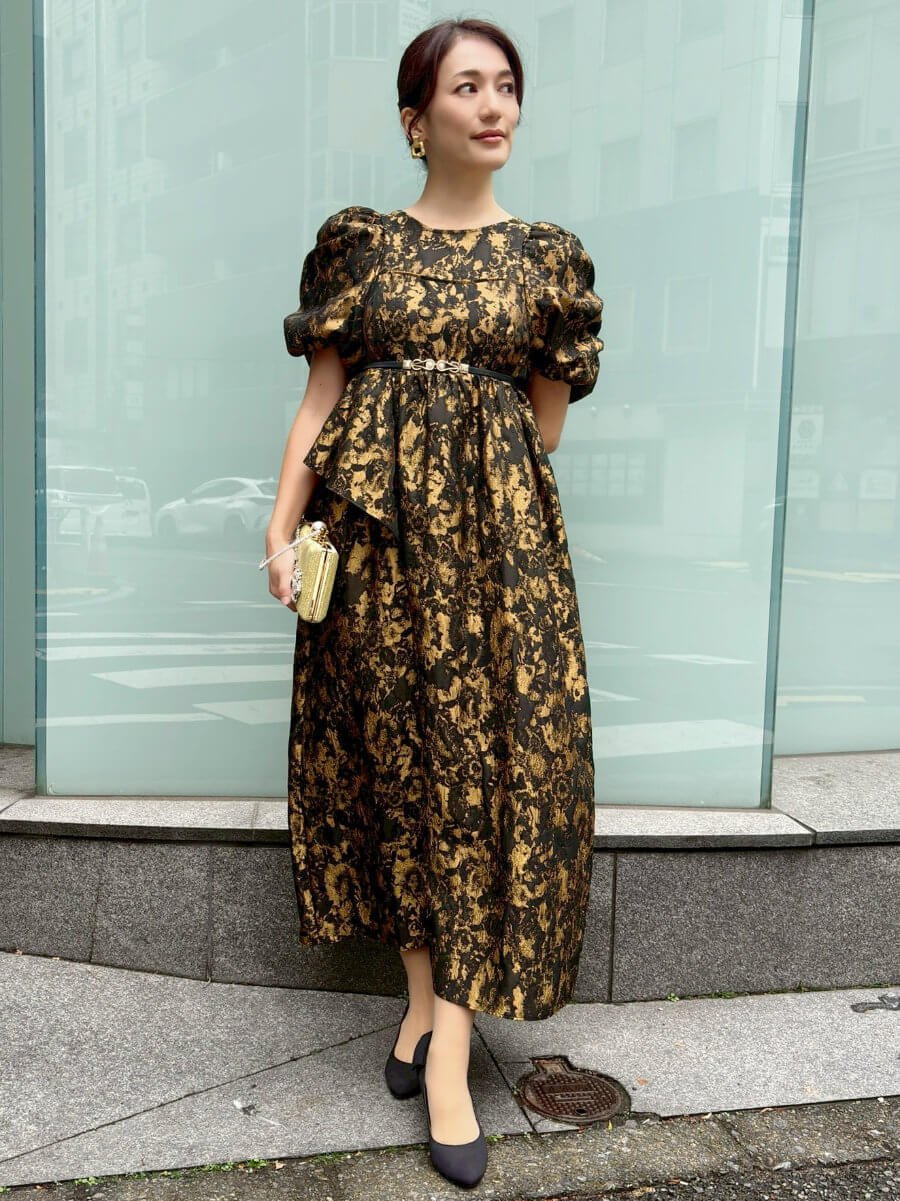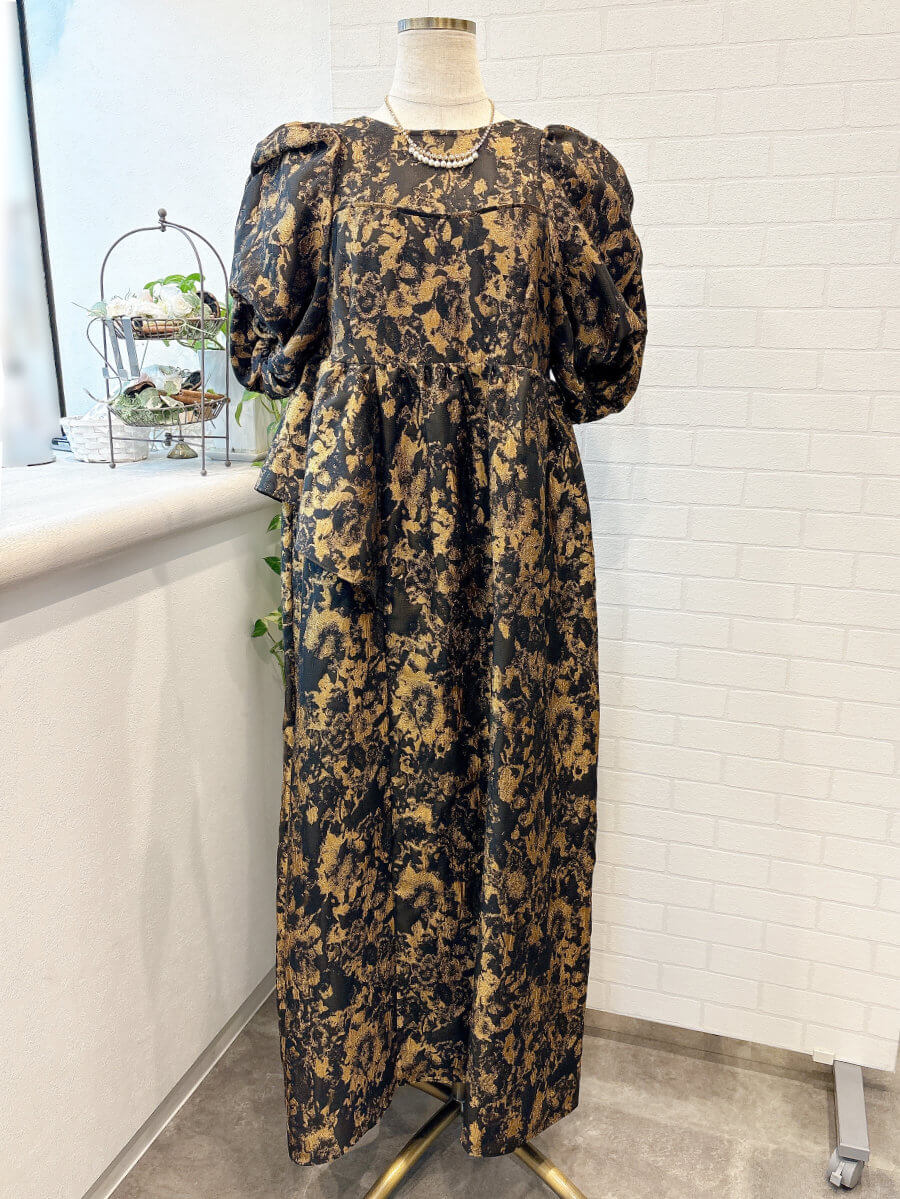 ◇商品について:ジャガード素材を利用した立体感のある個性的なドレスです。ギャザーをたっぷり寄せてつくったパフスリーブや、アシンメトリーなフリルがキャッチ―なドレス。ゴージャスに着こなせます。オーバーシルエットのトレンドのデザインでゆったりシルエットでも大きく見えないデザイン性抜群のドレス。マタニティの方もご着用可能です。