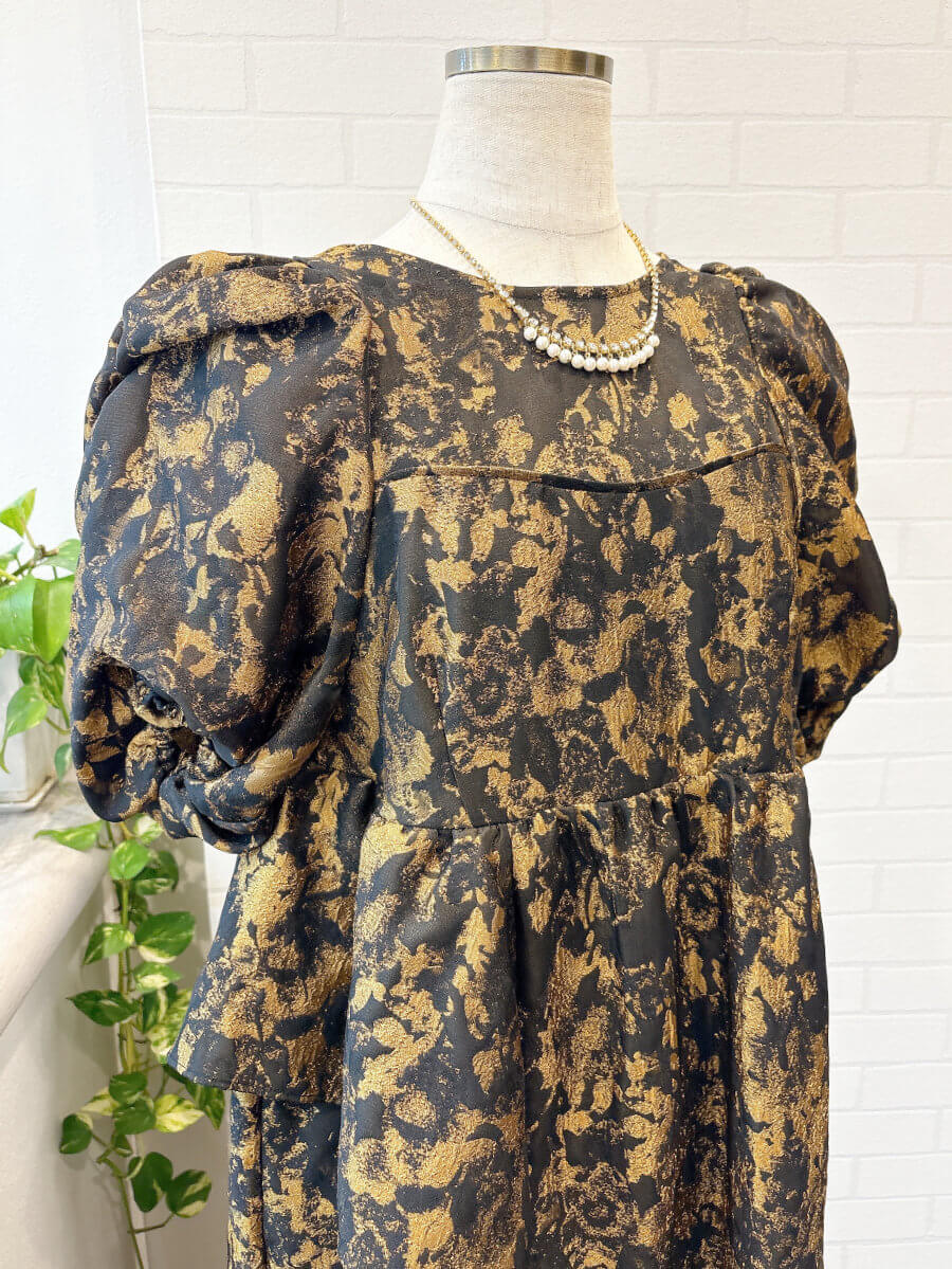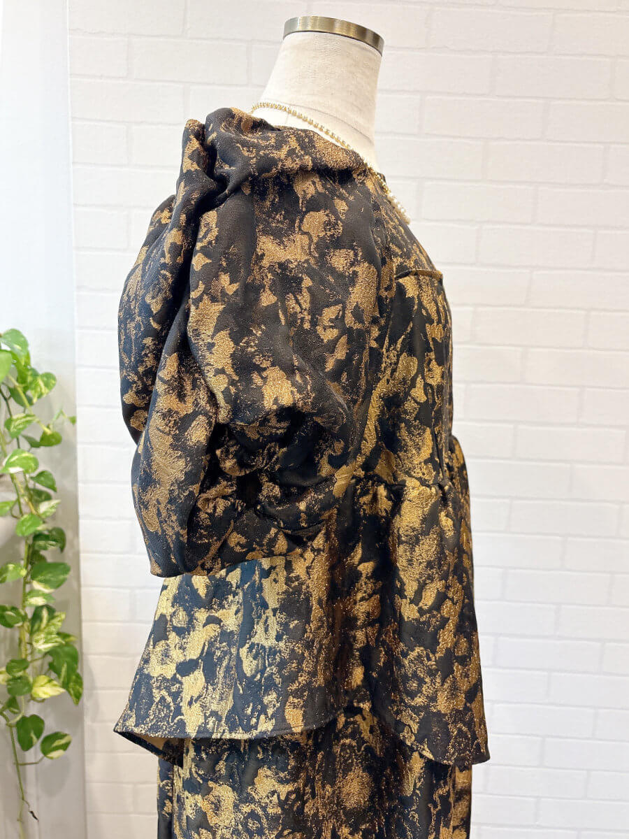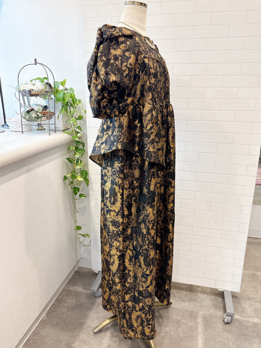 ◇商品について:ジャガード素材を利用した立体感のある個性的なドレスです。ギャザーをたっぷり寄せてつくったパフスリーブや、アシンメトリーなフリルがキャッチ―なドレス。ゴージャスに着こなせます。オーバーシルエットのトレンドのデザインでゆったりシルエットでも大きく見えないデザイン性抜群のドレス。マタニティの方もご着用可能です。