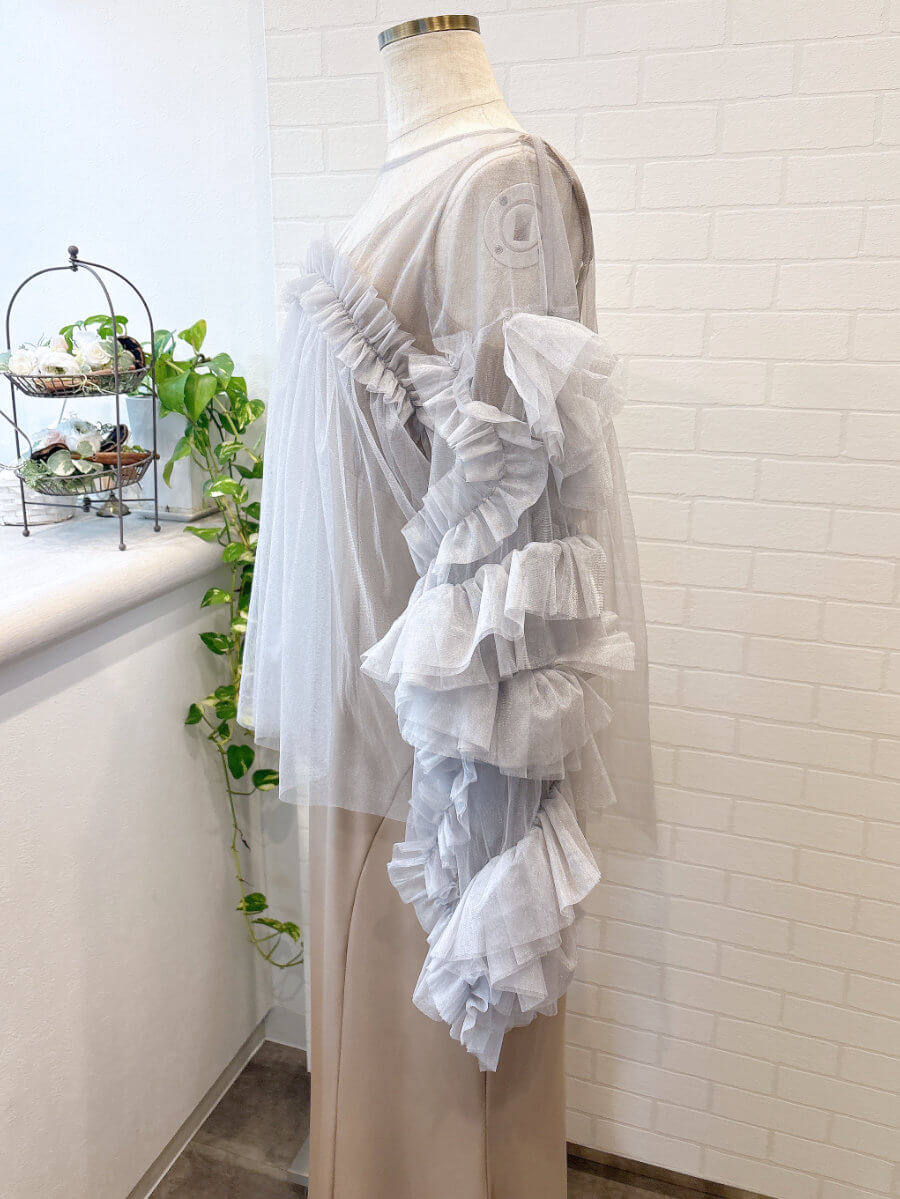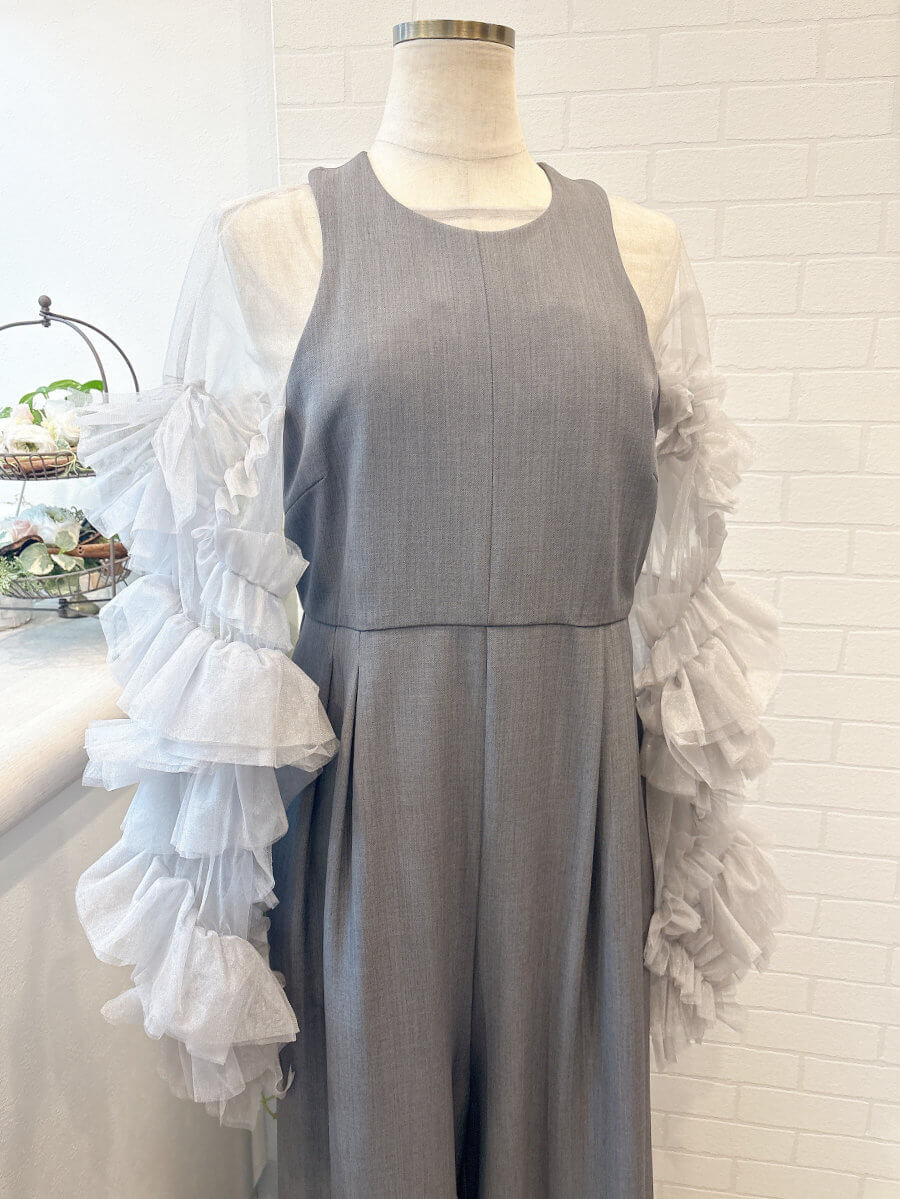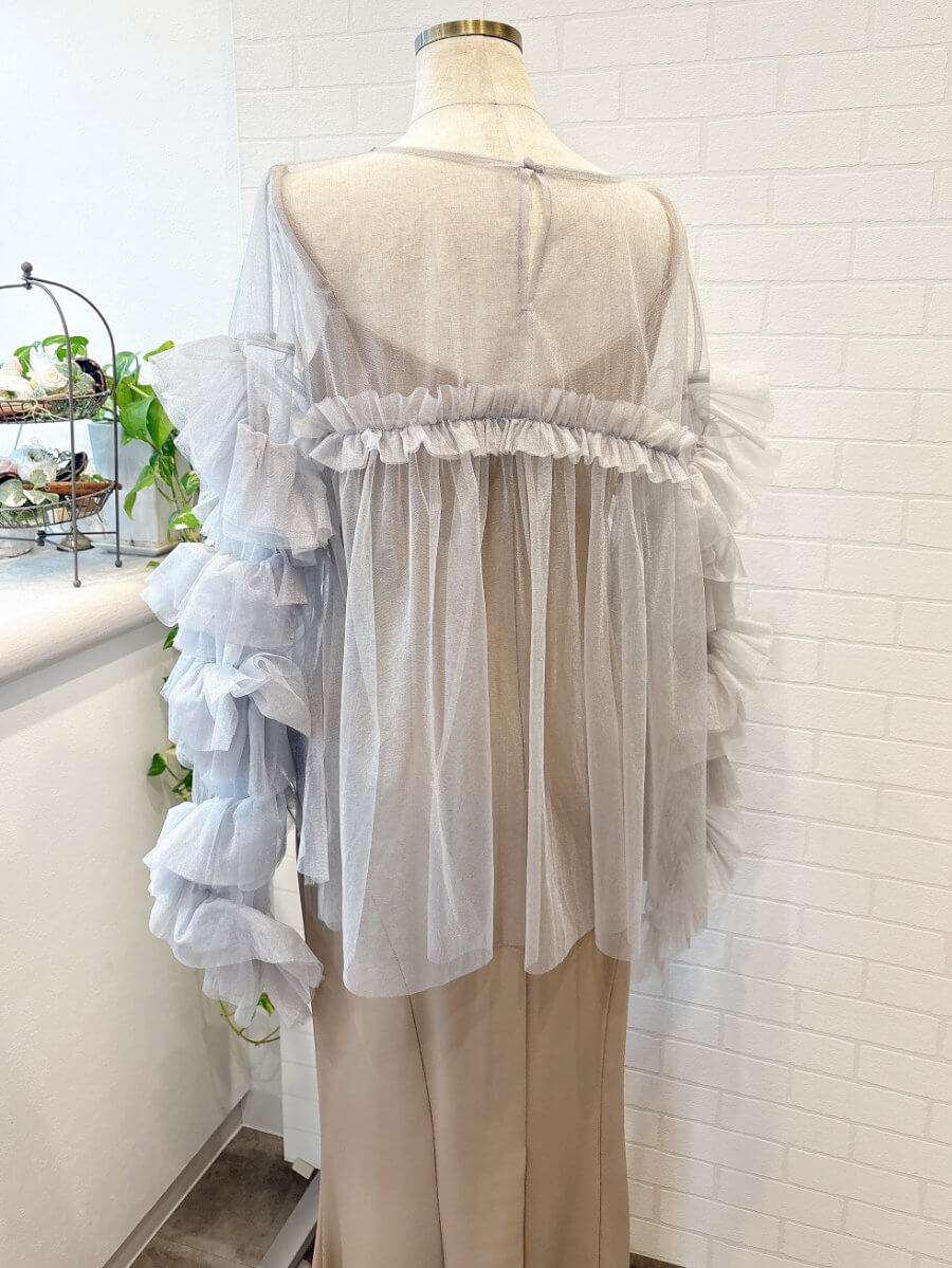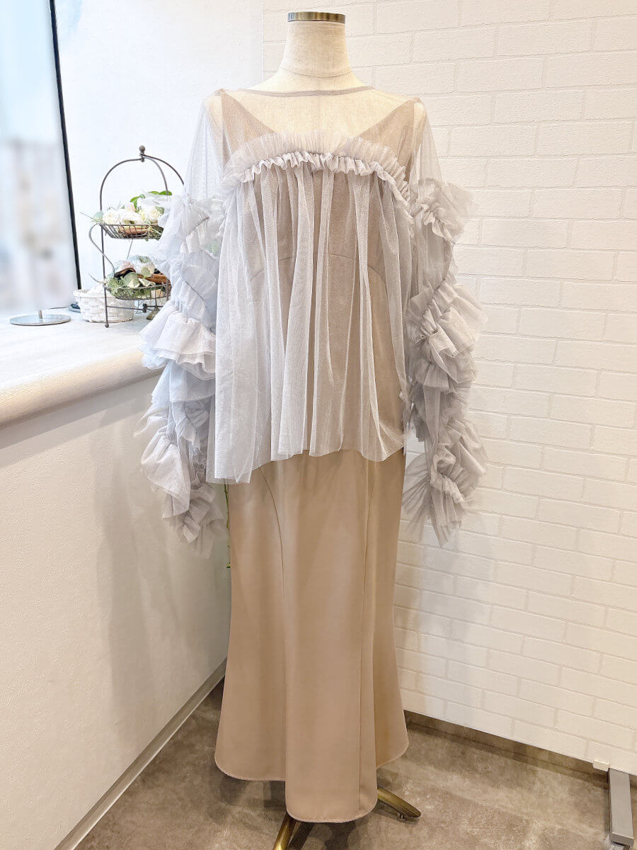 ◇カラー:シルバー ◇商品について:キャミソールドレス、パンツドレスのインナーやアウターにご利用頂けます。付属のトップスの袖が短いのが気になる方やドレスのアレンジにおすすめのチュールトップスです。フリルがランダムに重なりふんわりとしたボリューム感でスタイリッシュに仕上がります。