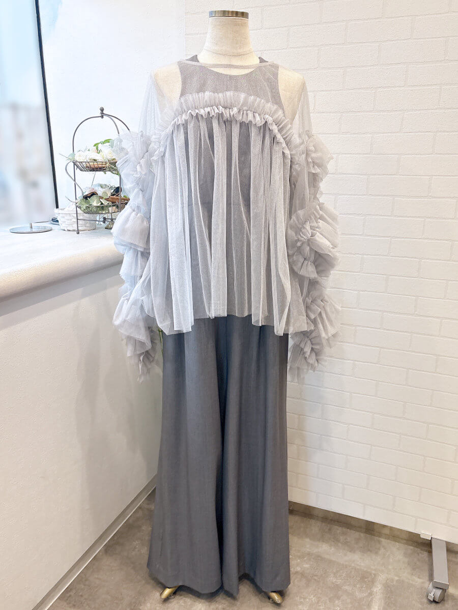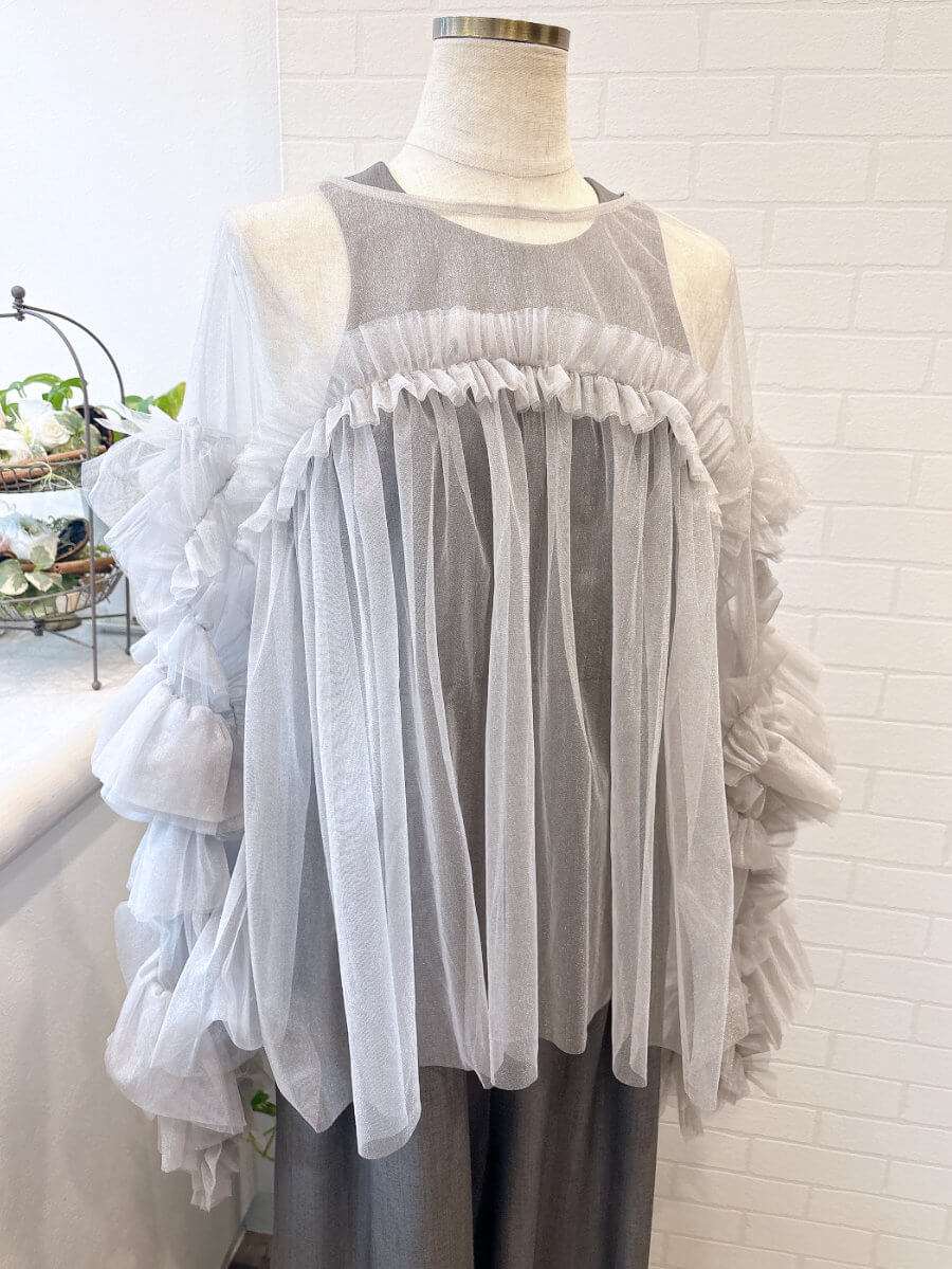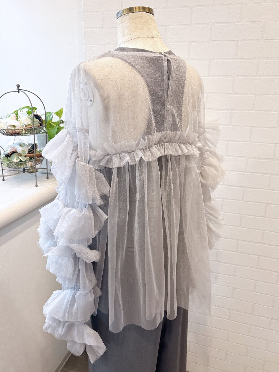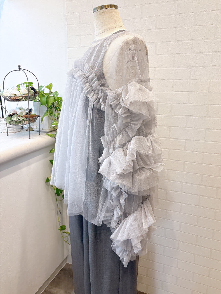 ◇カラー:シルバー ◇商品について:キャミソールドレス、パンツドレスのインナーやアウターにご利用頂けます。付属のトップスの袖が短いのが気になる方やドレスのアレンジにおすすめのチュールトップスです。フリルがランダムに重なりふんわりとしたボリューム感でスタイリッシュに仕上がります。