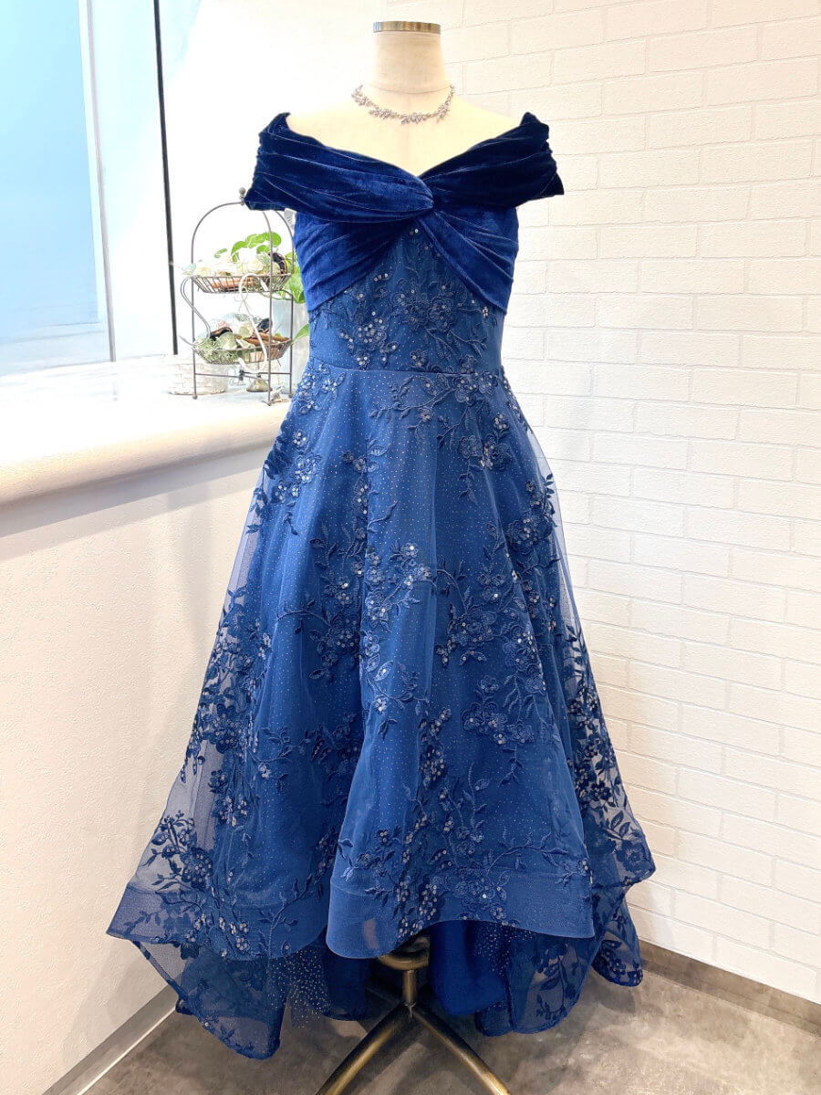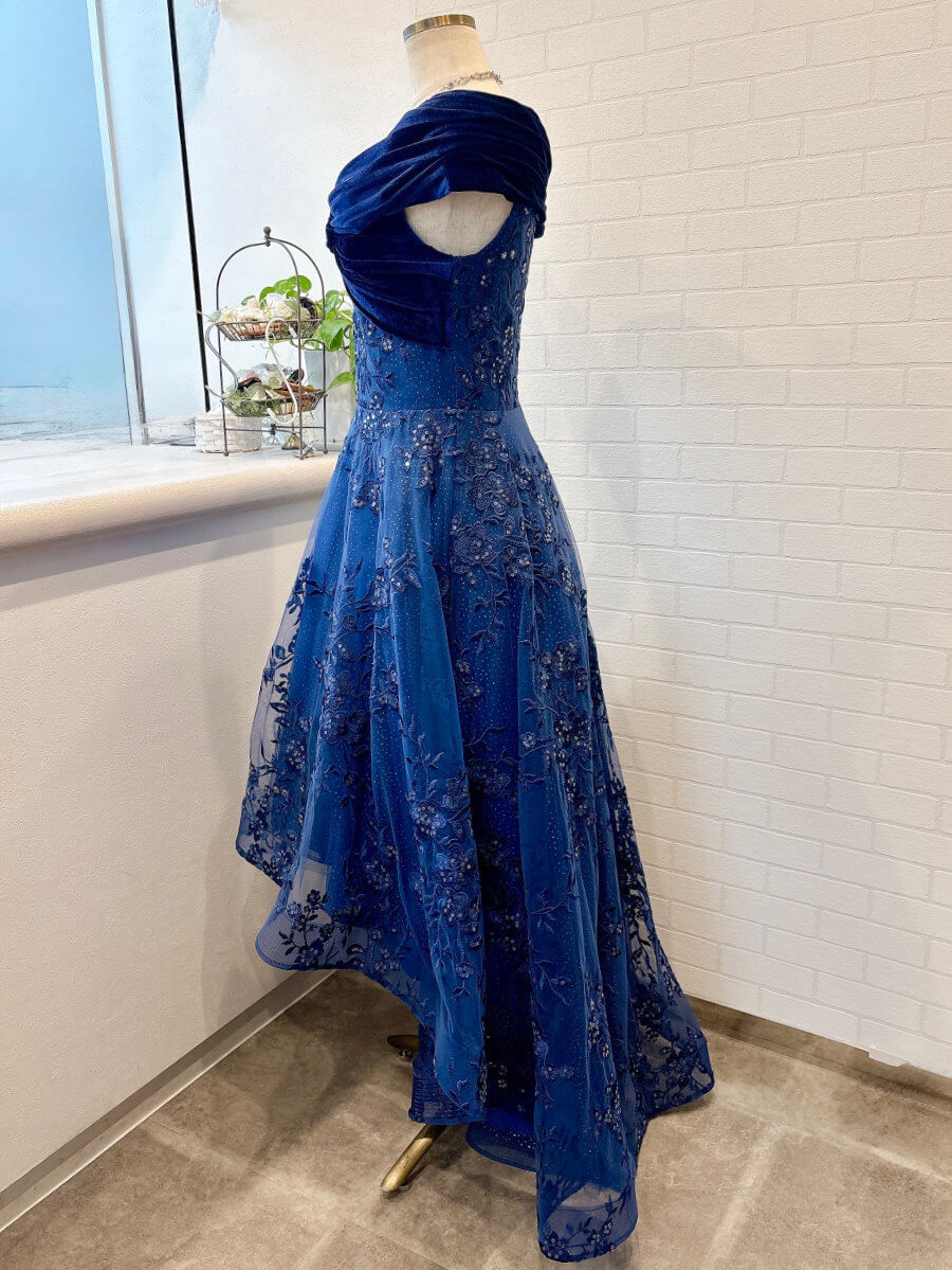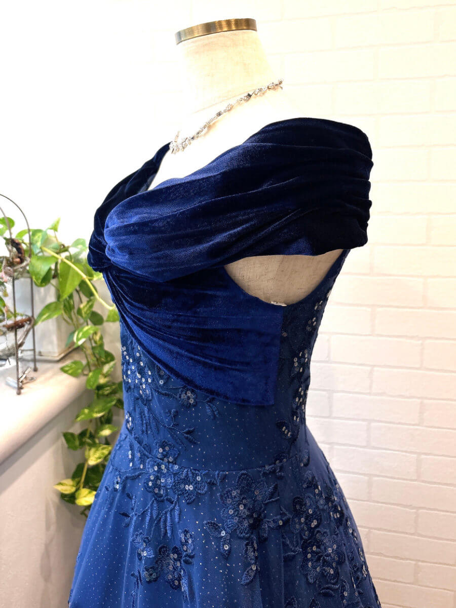 ◇商品について:高級感のあるベルベットのトップスとゴージャスなチュールにスパンコールのデザイン。インナーのチュールにはシルバーのラメが施されており、スパンコールと共に輝きを放ちます。Aラインのフィッシュテールで可愛く上品なデザインでフロントが短くなる為足回りがよくロングドレスに不慣れな方も歩きやすいです。パット付。