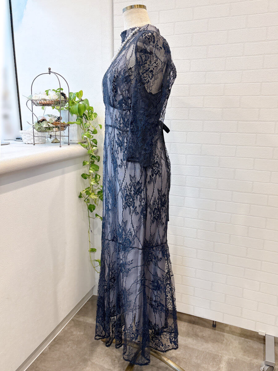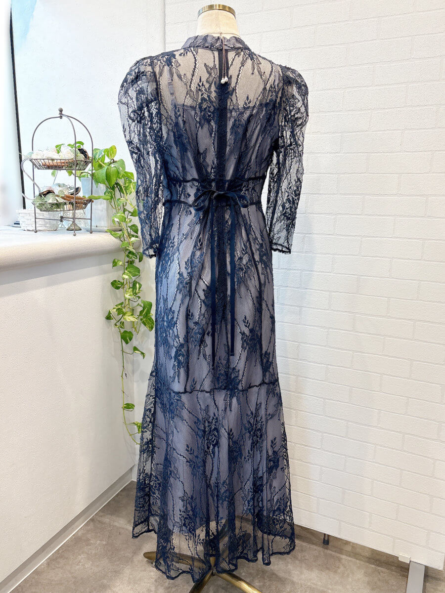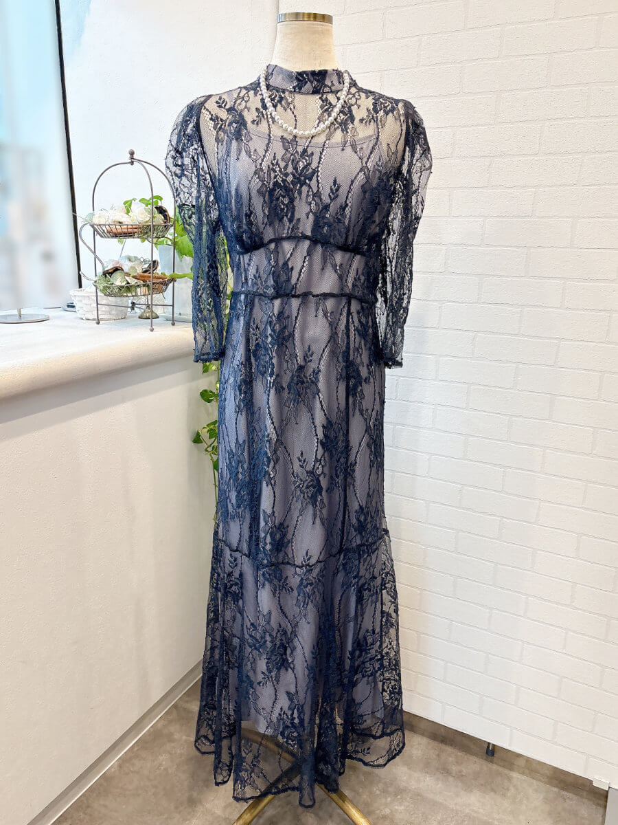 ◇商品について:ラベンダーのインナーにネイビーブルーのレースをレイヤード。ウエスト部分に細い紐ベルトがドッキングしておりサイズ調整が可能。インナーとレースが一体式ではないので体型をひろいずらく程よいシルエットで着れます。ウエスト部分はランダムなラインでハイウエスト感を出し足長効果のあるドレスです。人気のパフスリーブも繊細なレースで控え目なので肩が気になる方も着やすいデザインです。セミフレアのスカートがレディライクなドレスです。