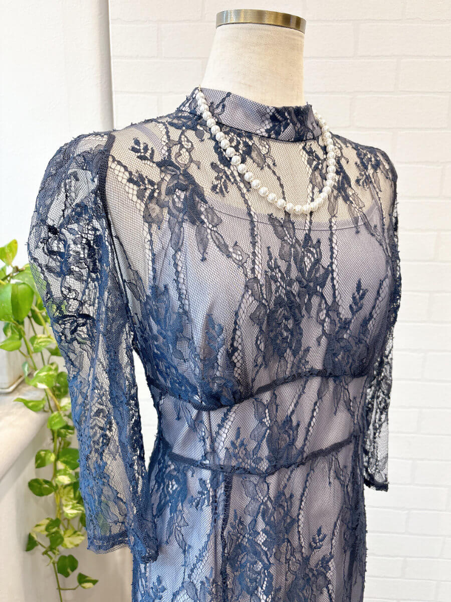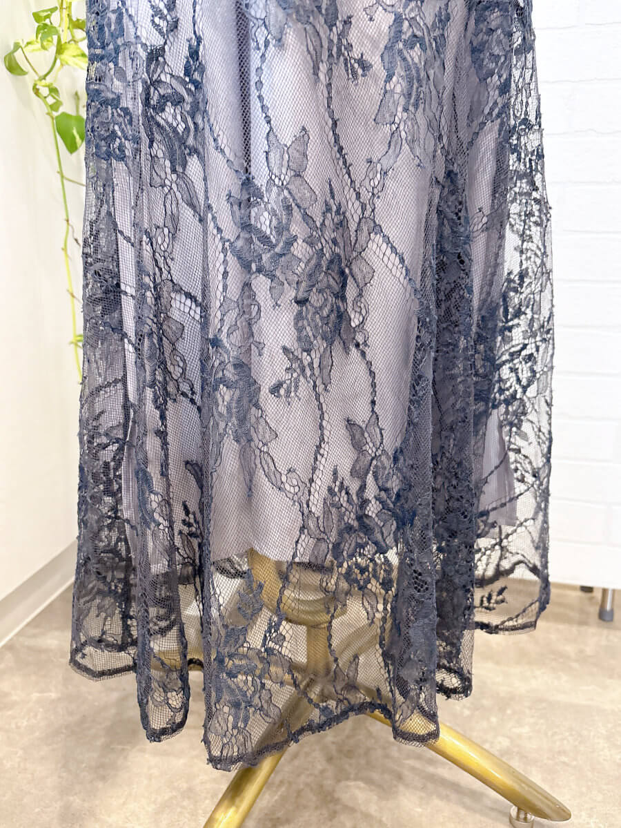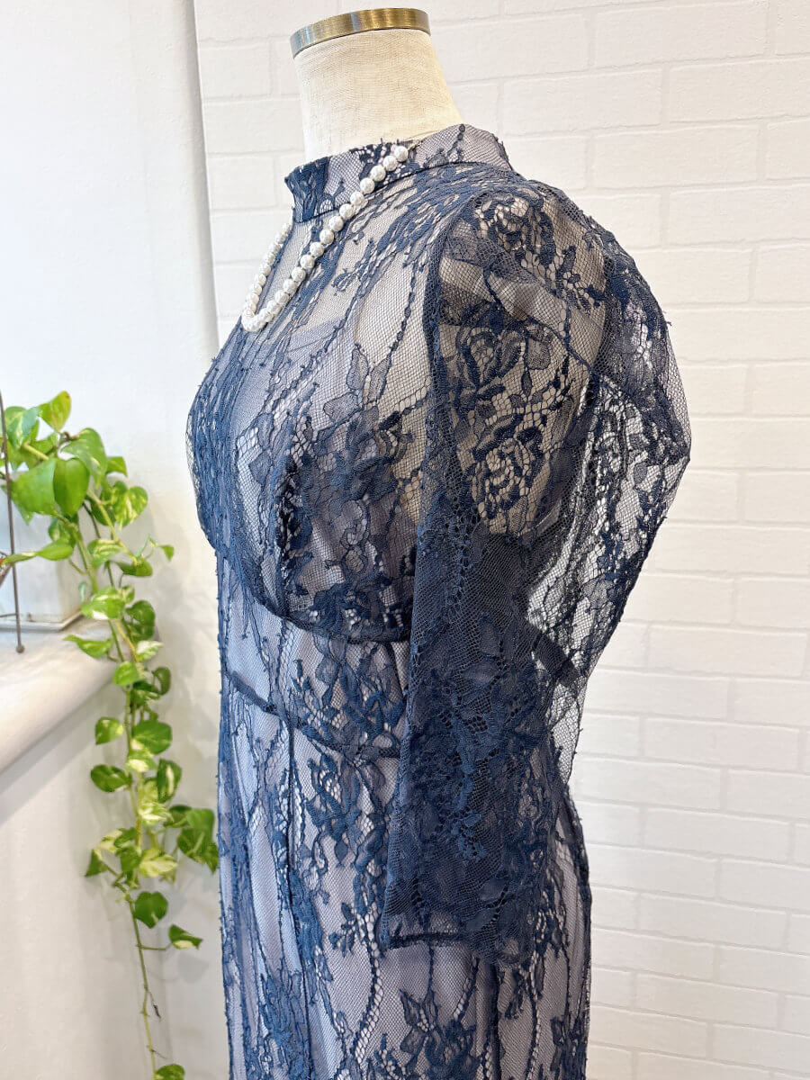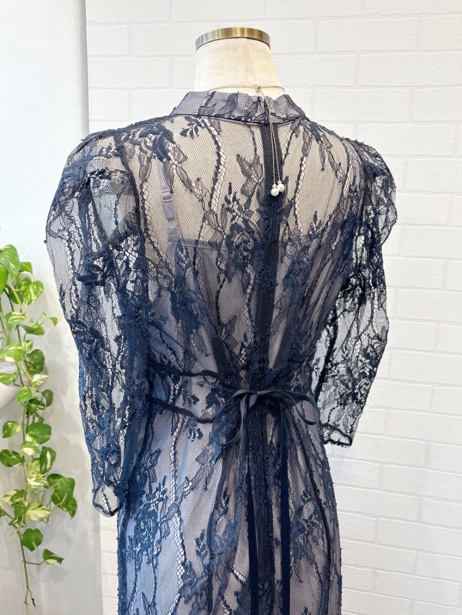 ◇商品について:ラベンダーのインナーにネイビーブルーのレースをレイヤード。ウエスト部分に細い紐ベルトがドッキングしておりサイズ調整が可能。インナーとレースが一体式ではないので体型をひろいずらく程よいシルエットで着れます。ウエスト部分はランダムなラインでハイウエスト感を出し足長効果のあるドレスです。人気のパフスリーブも繊細なレースで控え目なので肩が気になる方も着やすいデザインです。セミフレアのスカートがレディライクなドレスです。