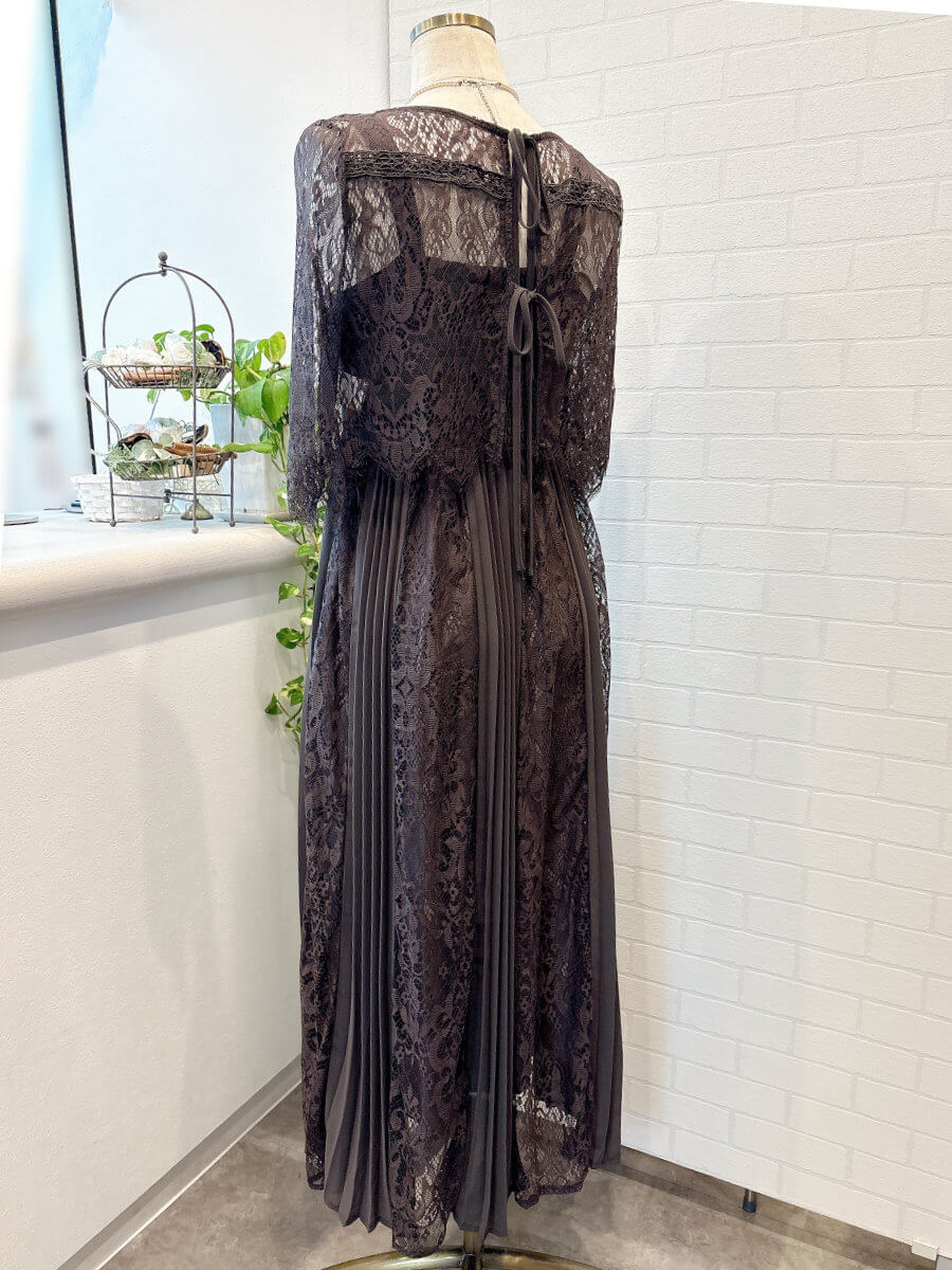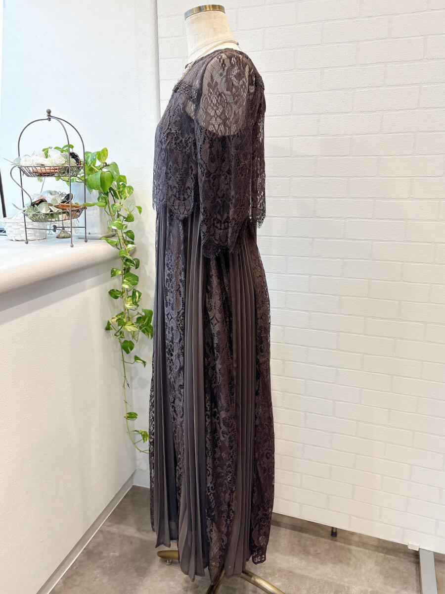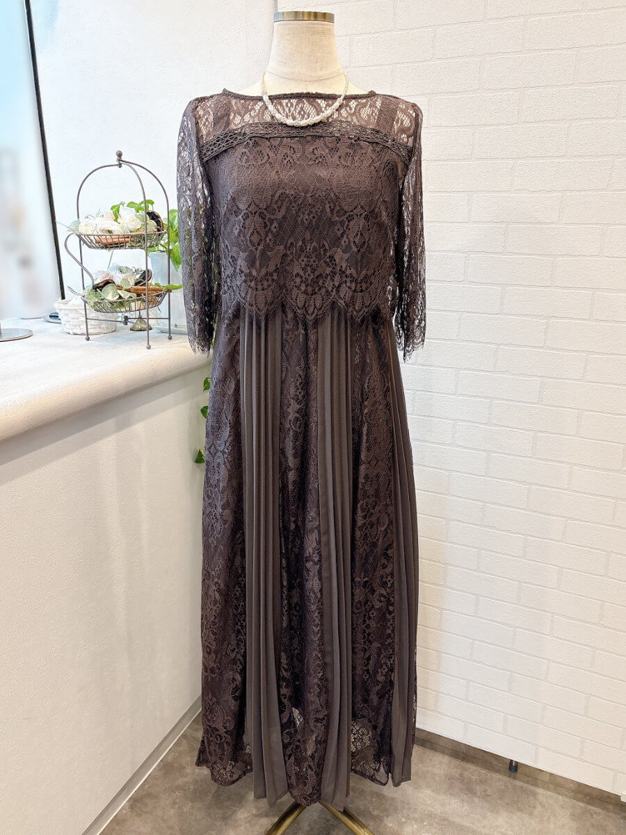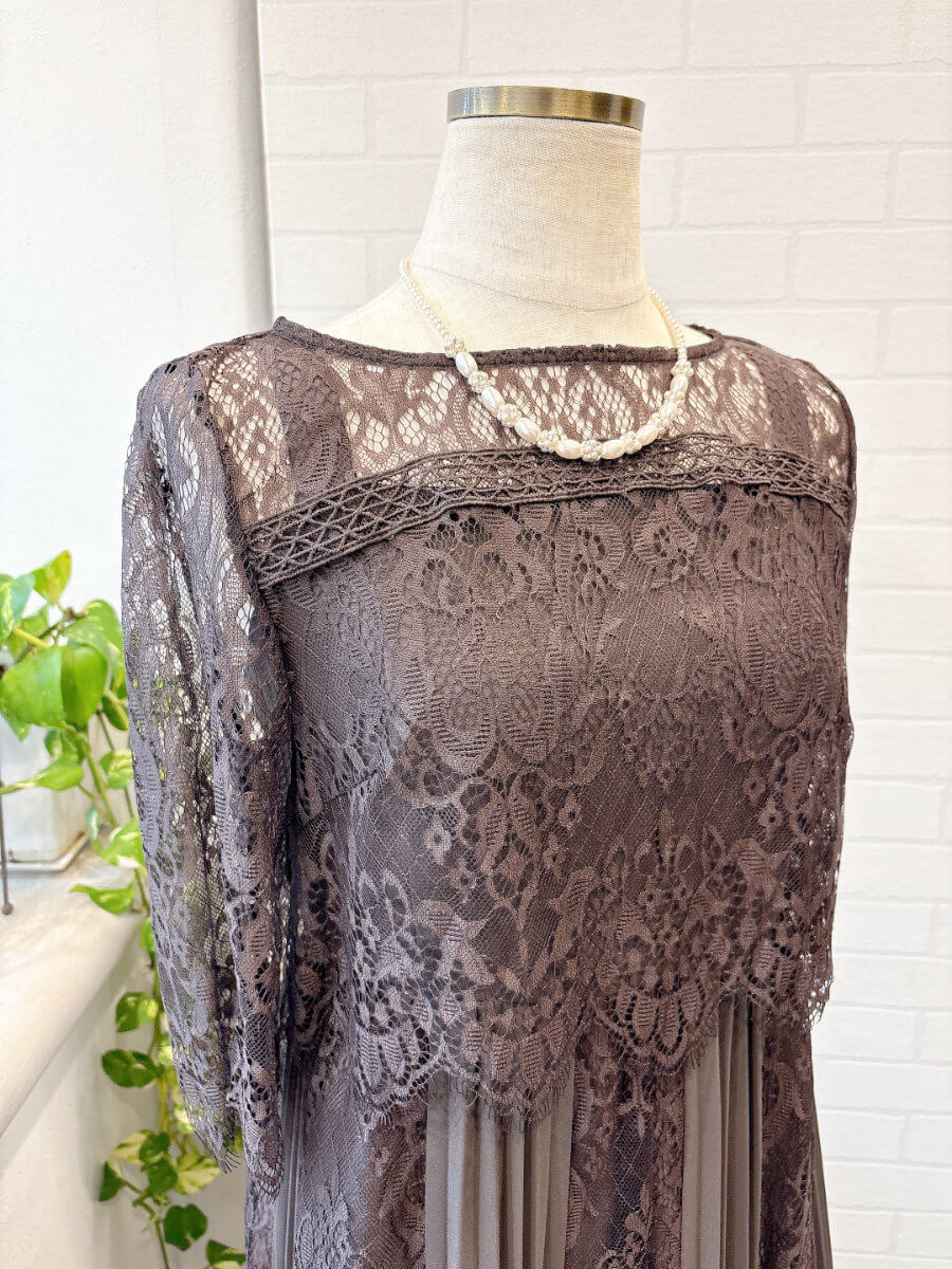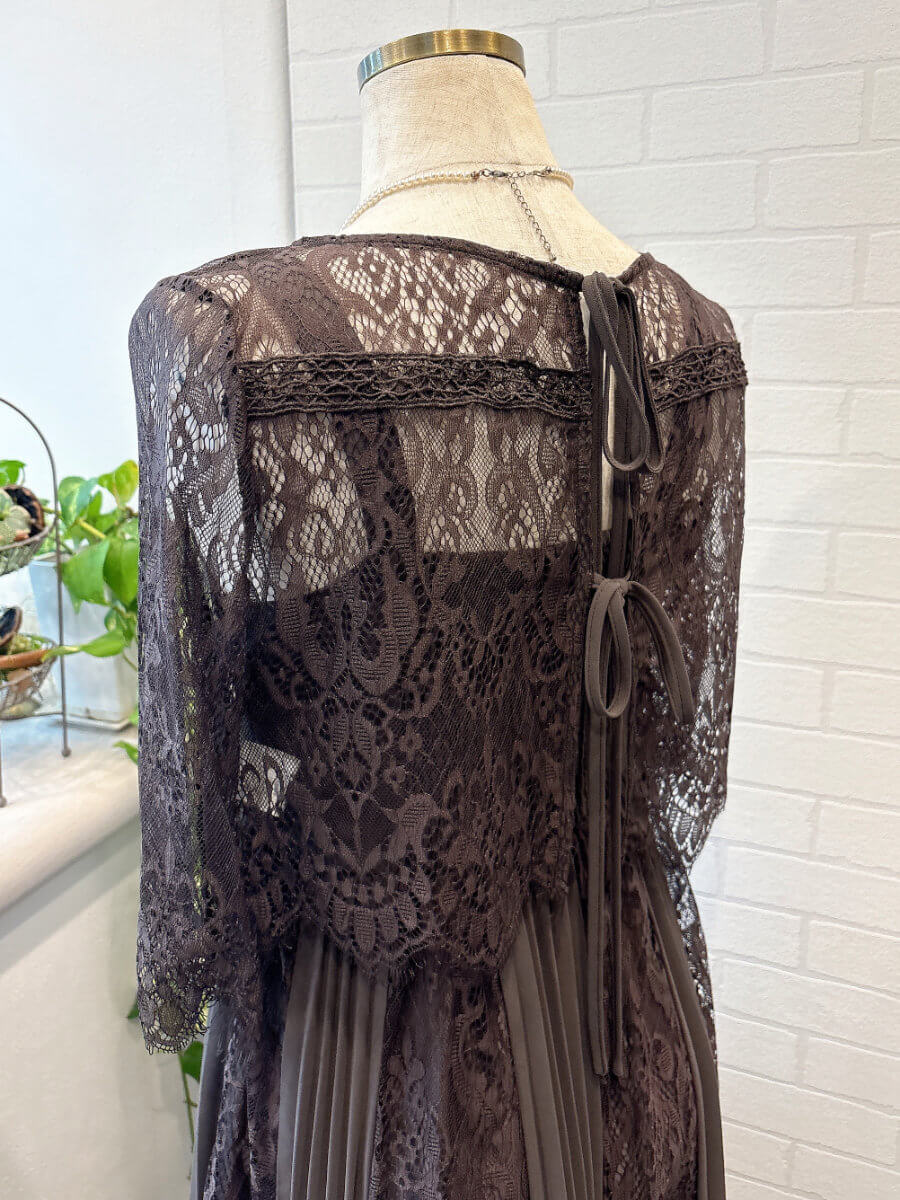 ◇商品について:ブラウンのレースボレロとレースプリーツのワンピースのセットアップドレス。背中部分はゴムになっていて伸縮性があります。ウエストがカバーされたデザインで且つ軽やかな素材感で一日楽に過ごせます。落ち着いたブラウンなのでご友人だけでなくご親族の結婚式などでもご着用頂けます。