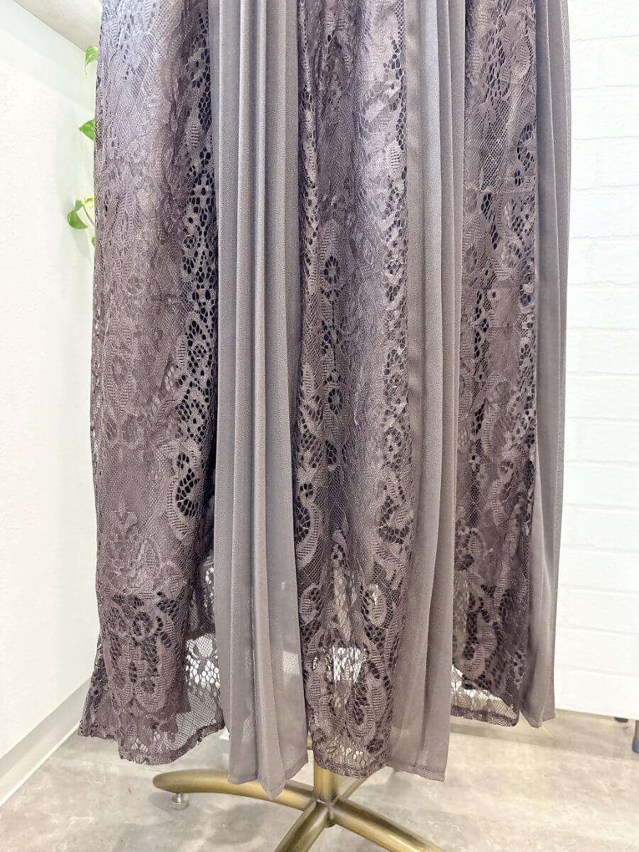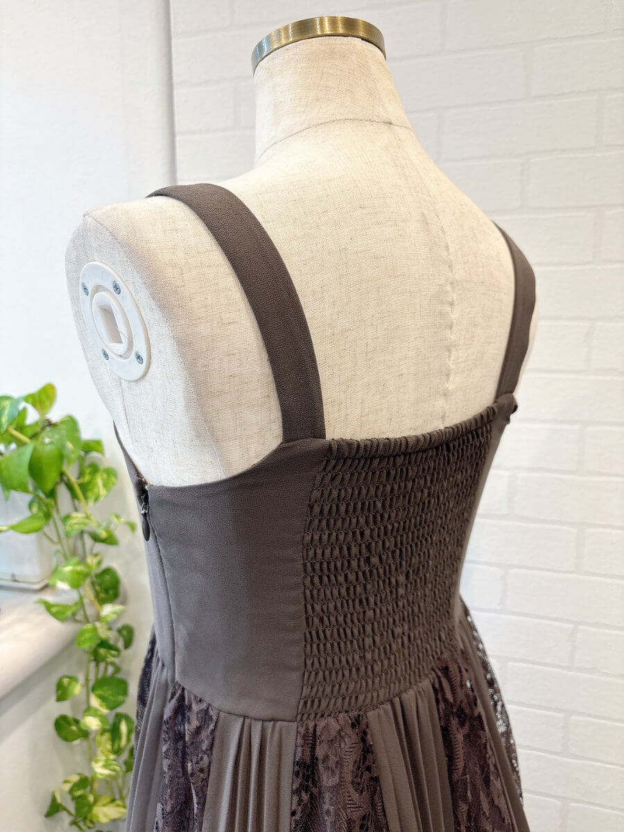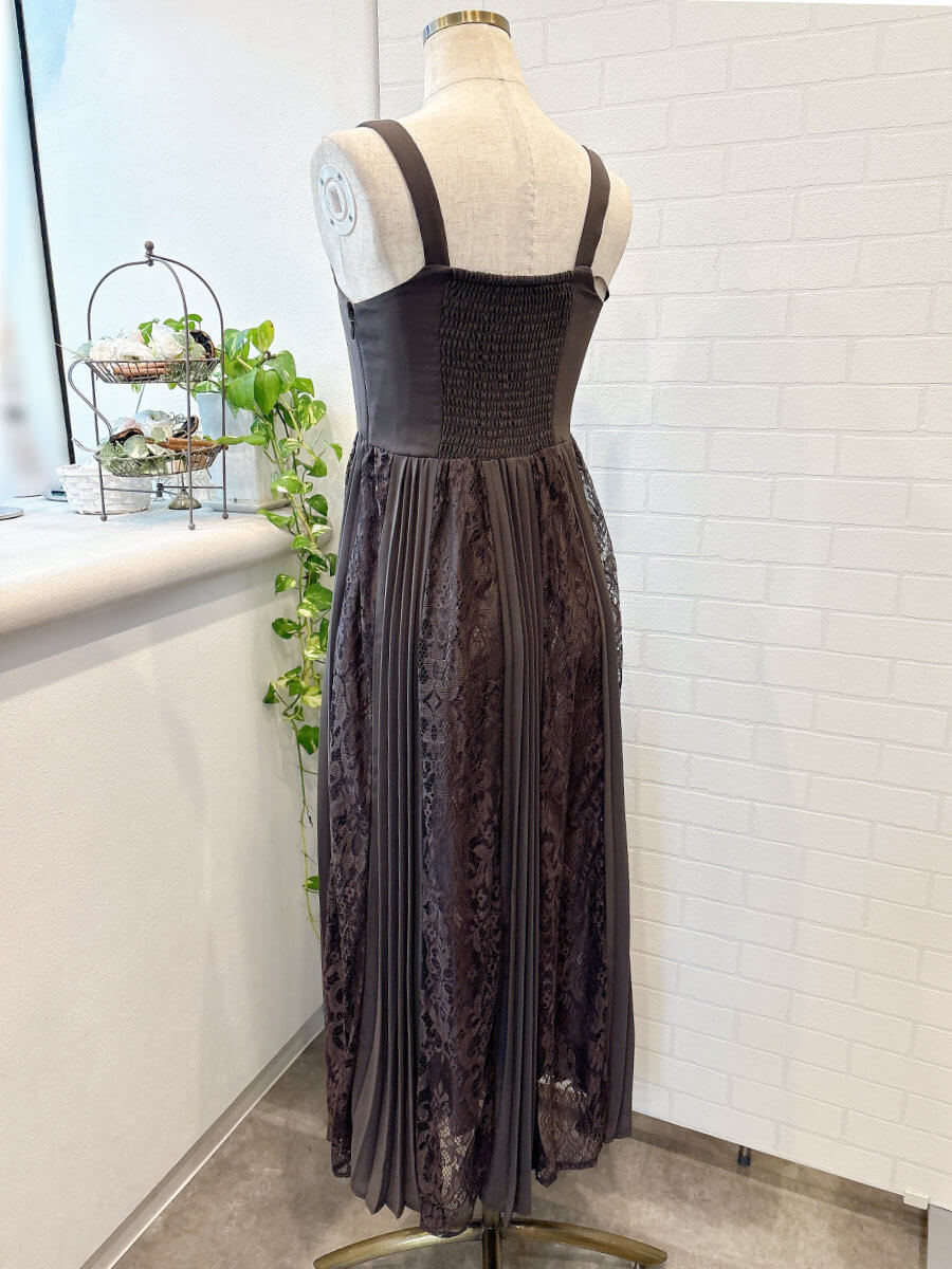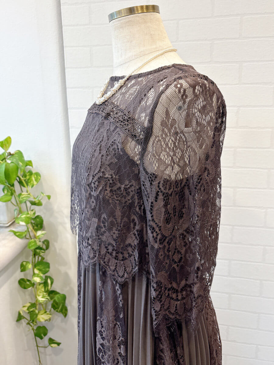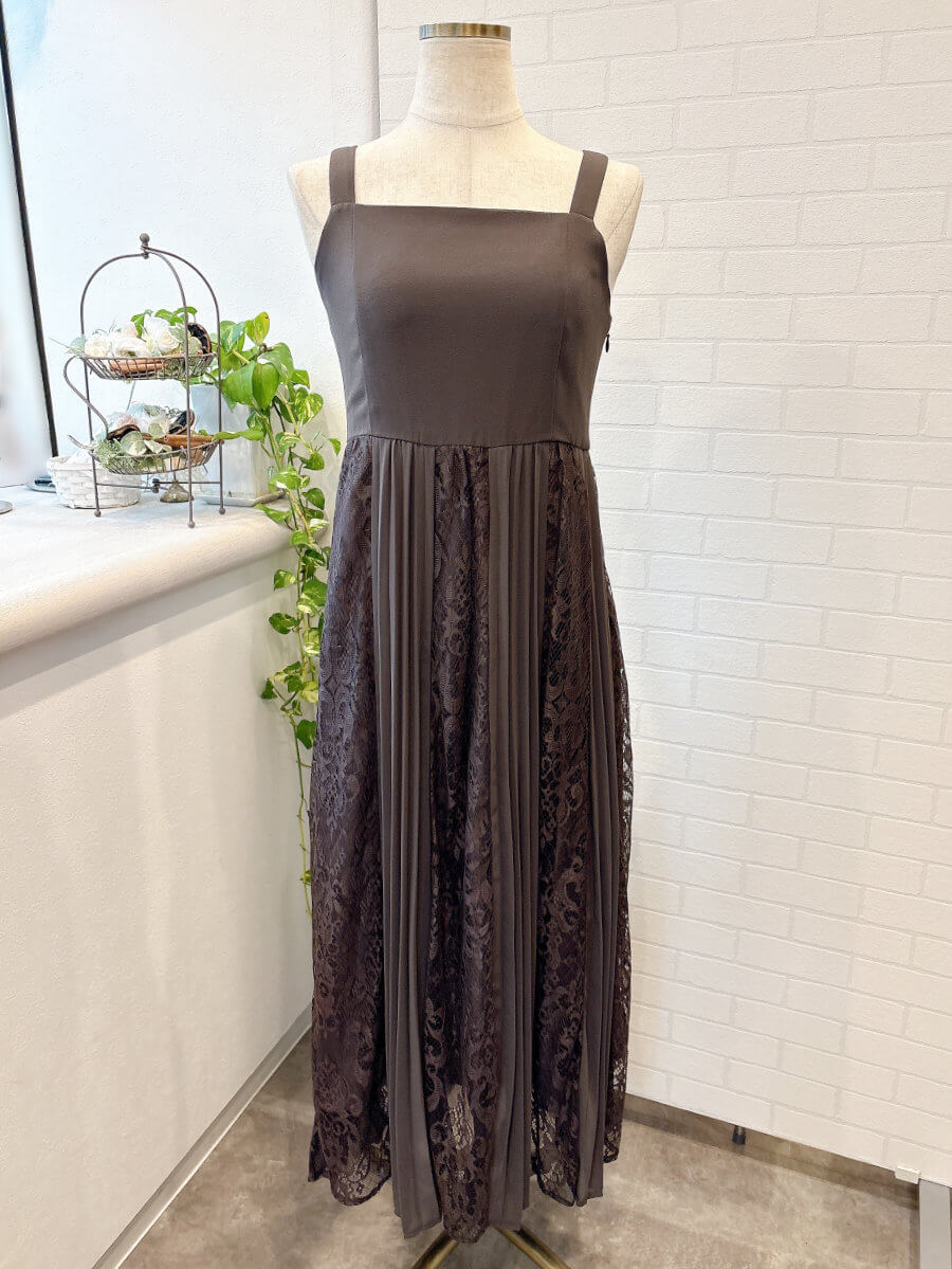 ◇商品について:ブラウンのレースボレロとレースプリーツのワンピースのセットアップドレス。背中部分はゴムになっていて伸縮性があります。ウエストがカバーされたデザインで且つ軽やかな素材感で一日楽に過ごせます。落ち着いたブラウンなのでご友人だけでなくご親族の結婚式などでもご着用頂けます。