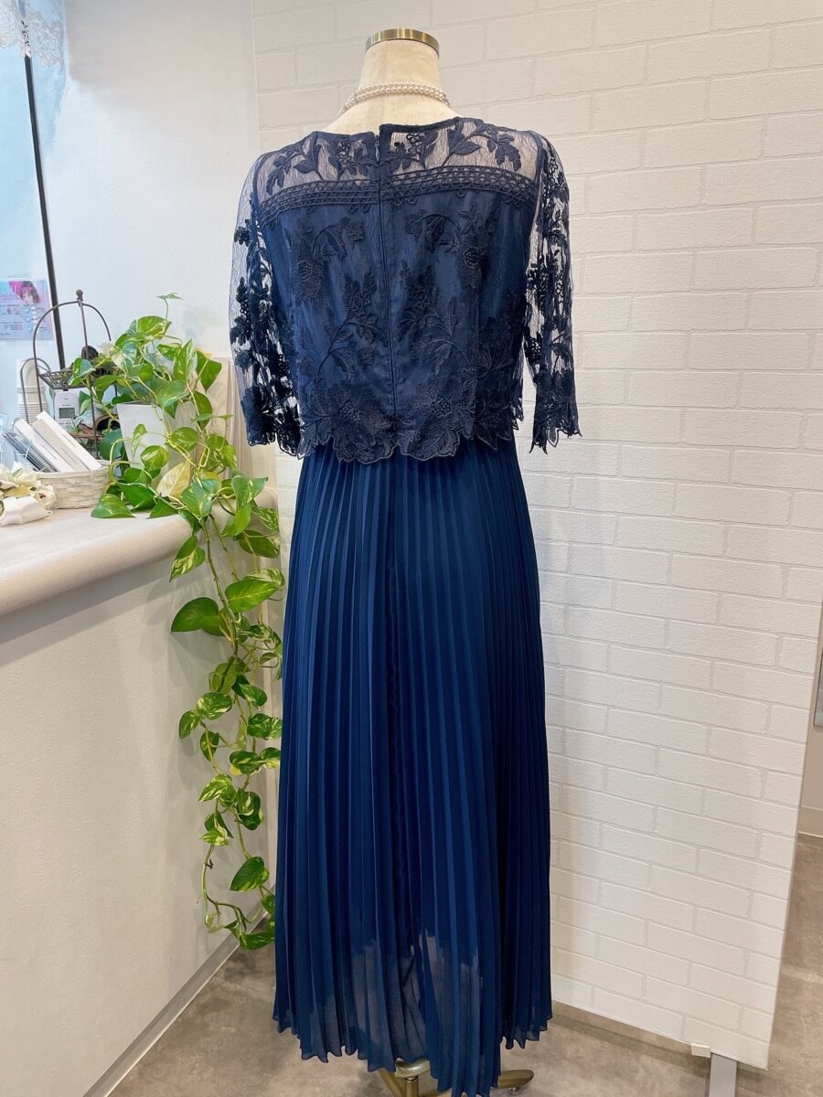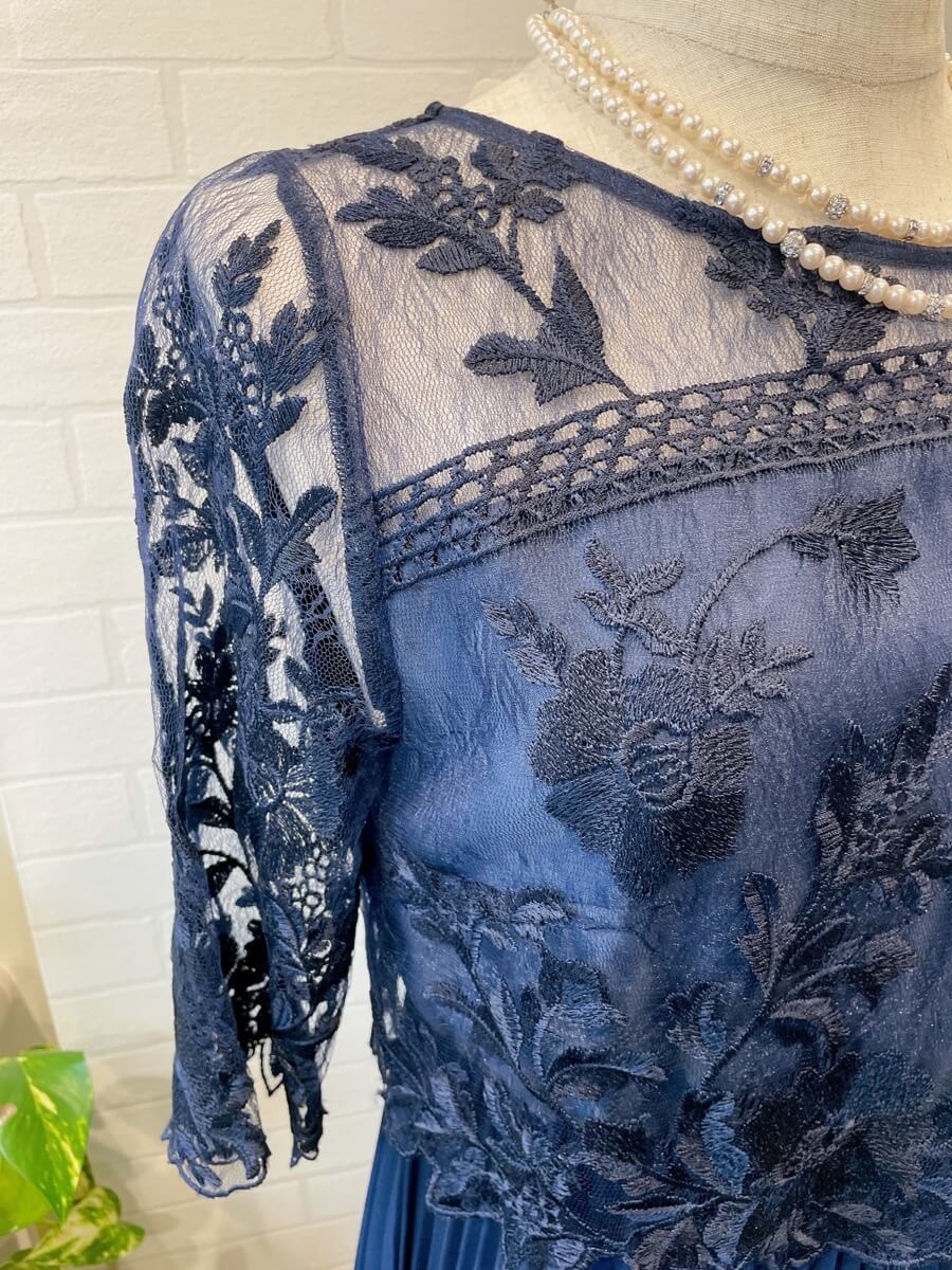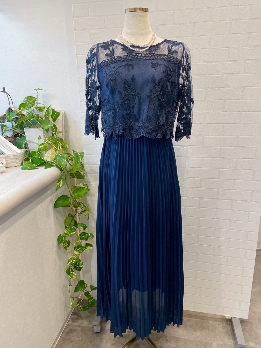 ◇カラー:ネイビー◇ブランドサイズ:M◇商品について:スカート部分はネイビーのプリーツ。トップス部分は光沢のあるお素材にレースと刺繍がレイヤード。袖口まで刺繍が入っており上品で華やか。ウエスト周りは刺繍のトップスでうまくカバーされておりお腹周りが気になる方も安心してご着用頂けます。ロング丈なのでミセスドレスとしても着用可能。ウエストはゴムで伸縮性があります。