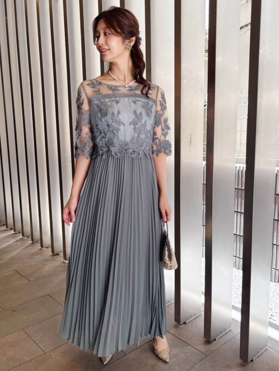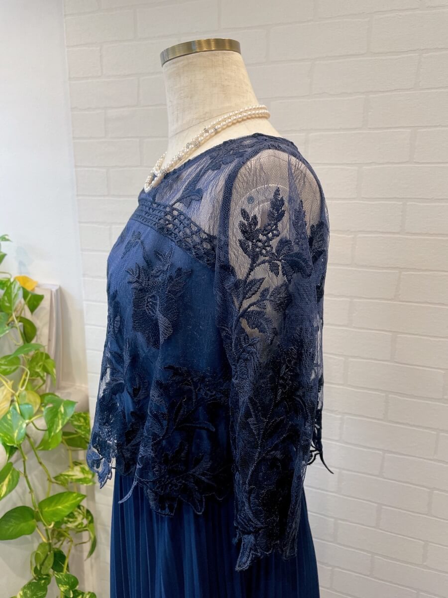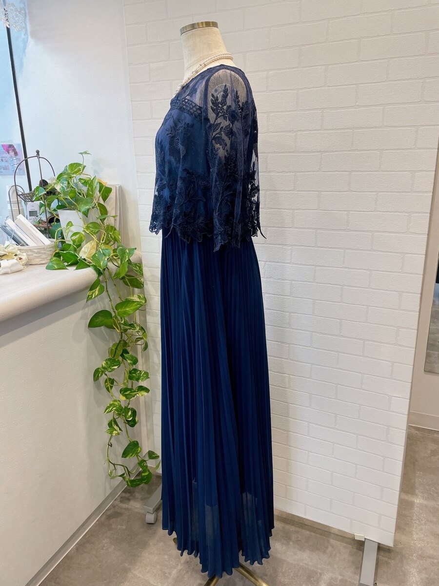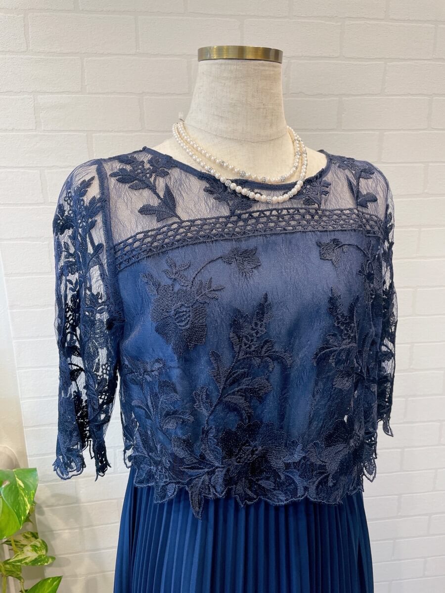 ◇カラー:ネイビー◇ブランドサイズ:M◇商品について:スカート部分はネイビーのプリーツ。トップス部分は光沢のあるお素材にレースと刺繍がレイヤード。袖口まで刺繍が入っており上品で華やか。ウエスト周りは刺繍のトップスでうまくカバーされておりお腹周りが気になる方も安心してご着用頂けます。ロング丈なのでミセスドレスとしても着用可能。ウエストはゴムで伸縮性があります。