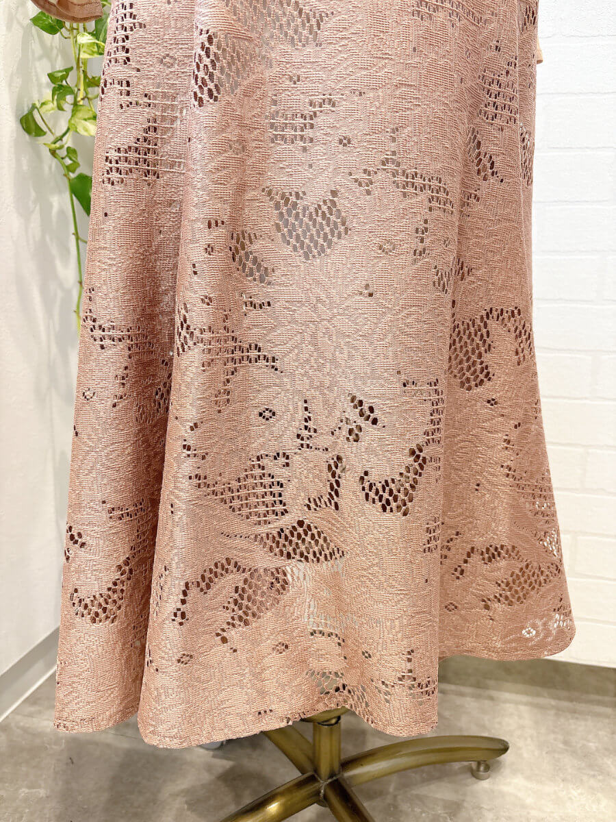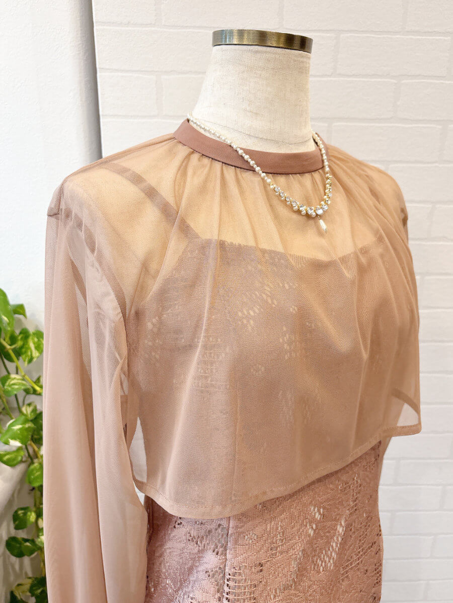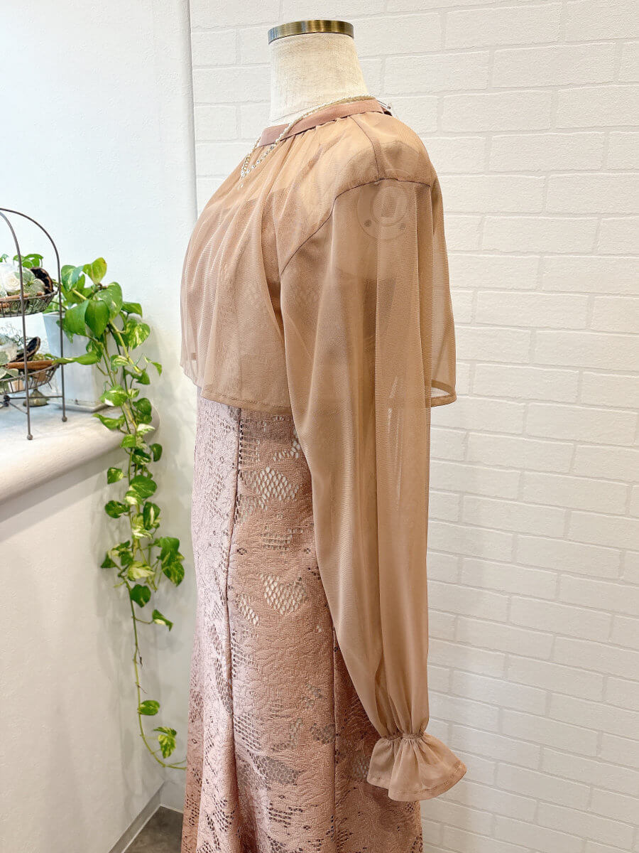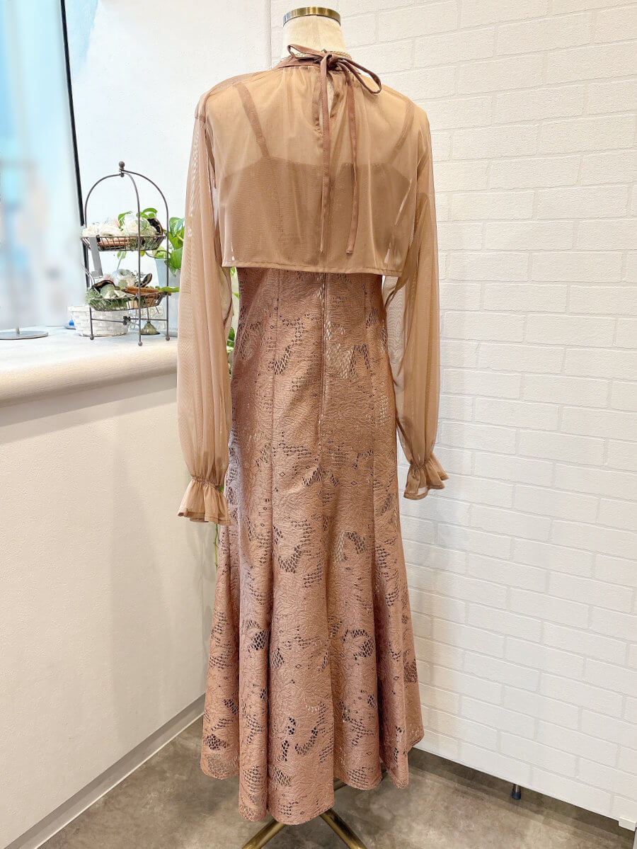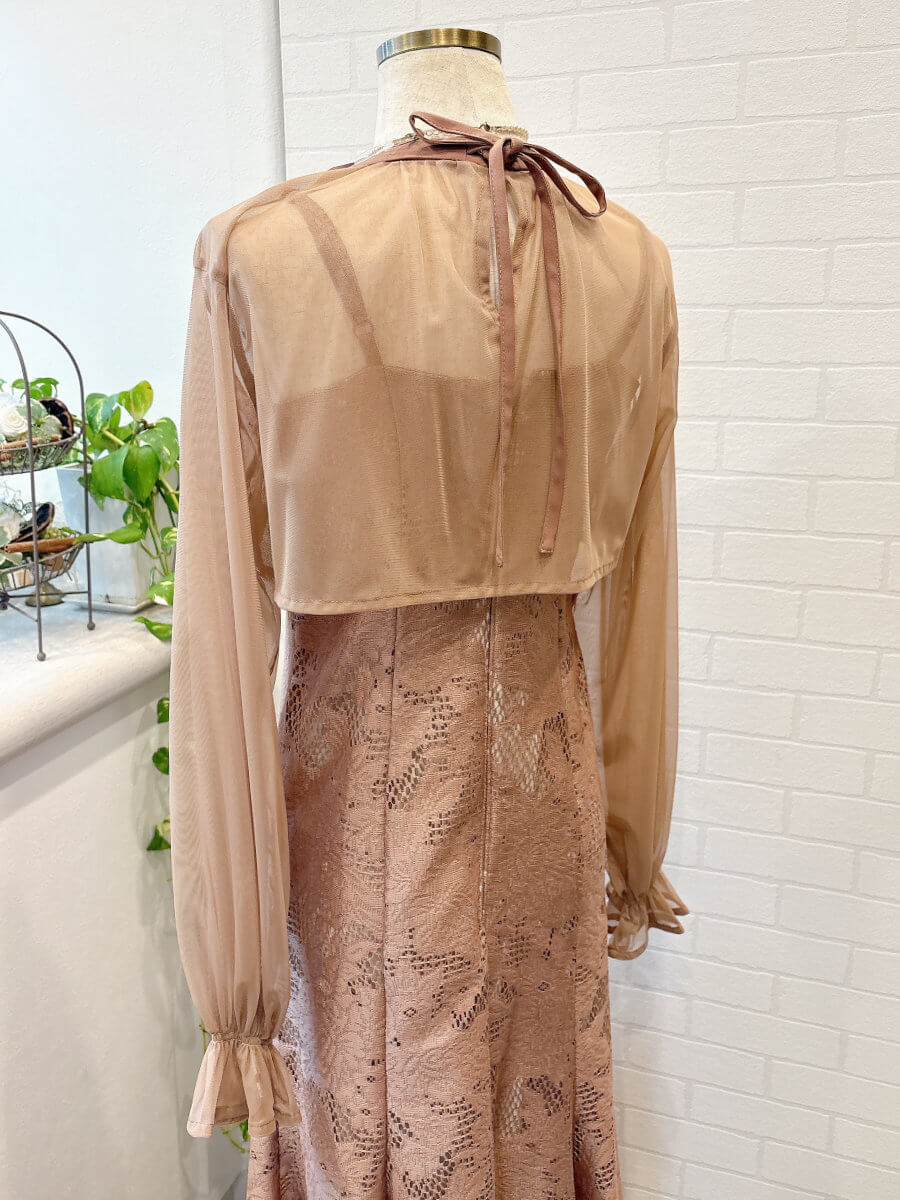 ◇商品について:ピンクのシアーボレロとピンクのレースワンピースドレスのアンサンブルドレス。レースの素材はしっかりしていて透け感も気になりにくいです。マーメイドシルエットでショート丈のボレロは前もしくは後ろどちらでも着用できる2WAYタイプ。手首部分はゴムになっている為伸縮性ああります。マーメイドなので体型によってはラインを拾いますので骨格によっては注意が必要。