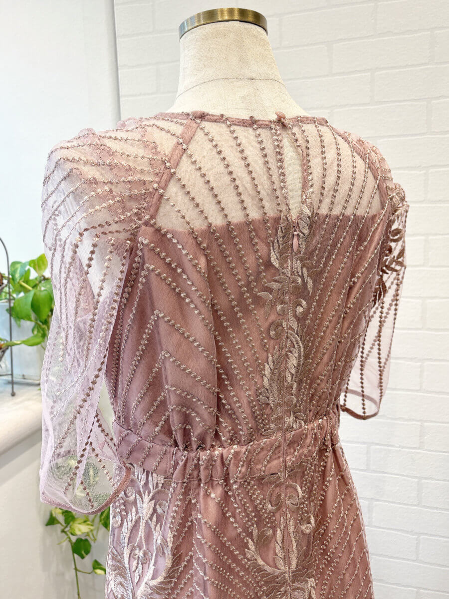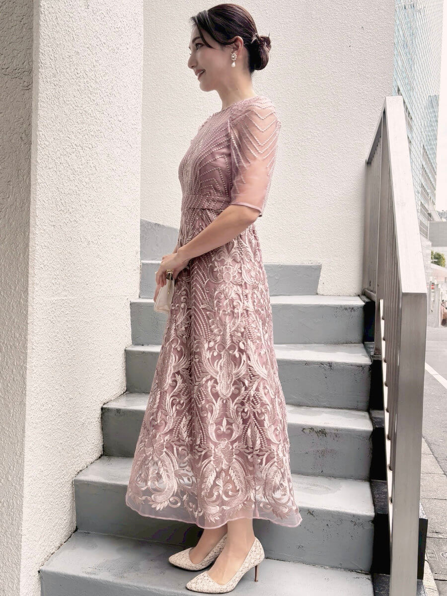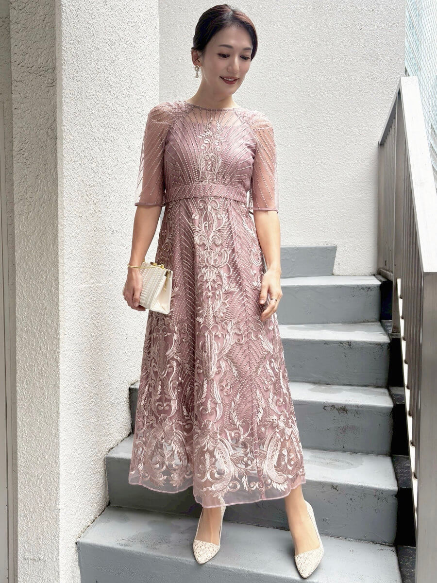 ◇カラー:ピンク◇ブランドサイズ:38(9号)◇商品について:華やかな刺繍ドレス。セミフレアなシルエットが大人の女性にぴったり。長めの丈感で安心上品に着こなせます。ドルマンスリーブの袖がドレッシーでそこに入る刺繍がとても華やか。ハイウエストでシルエット美人なドレスです。ミセスドレスとしてもおすすめです。