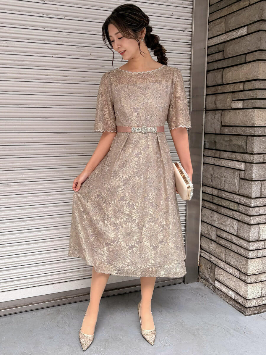 ◇商品について:チュールのインナーにピンクゴールドのレースがレイヤード。上品な華やかさのあるデザインのドレスです。