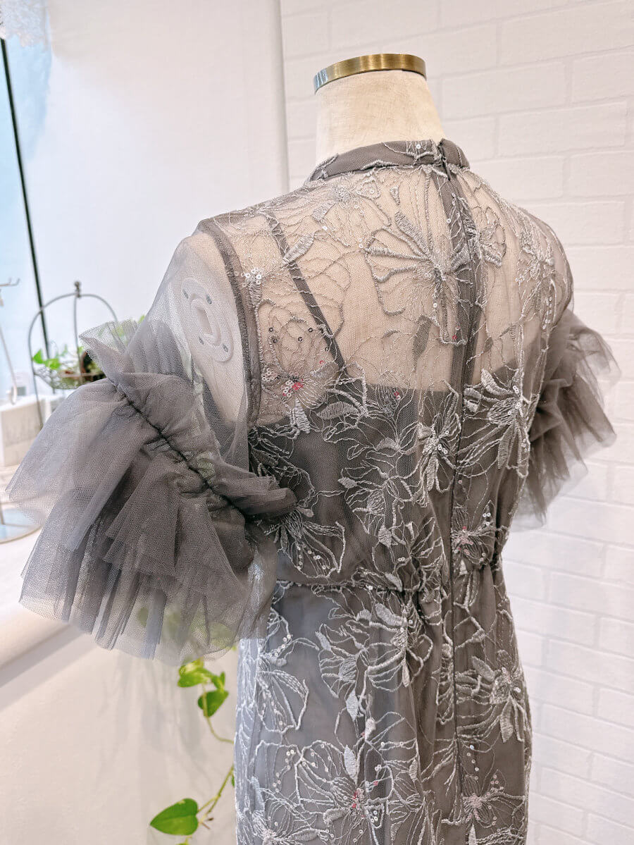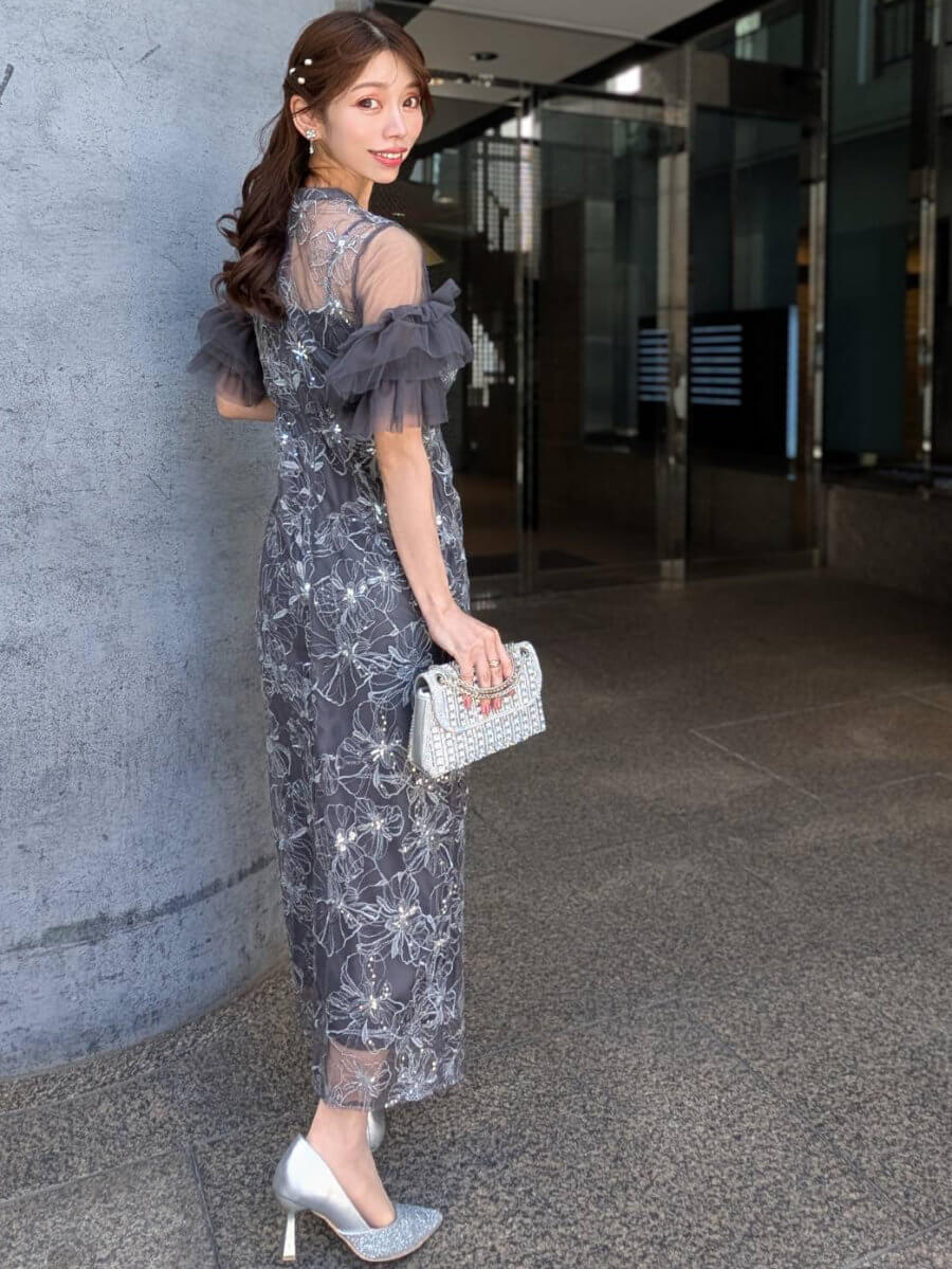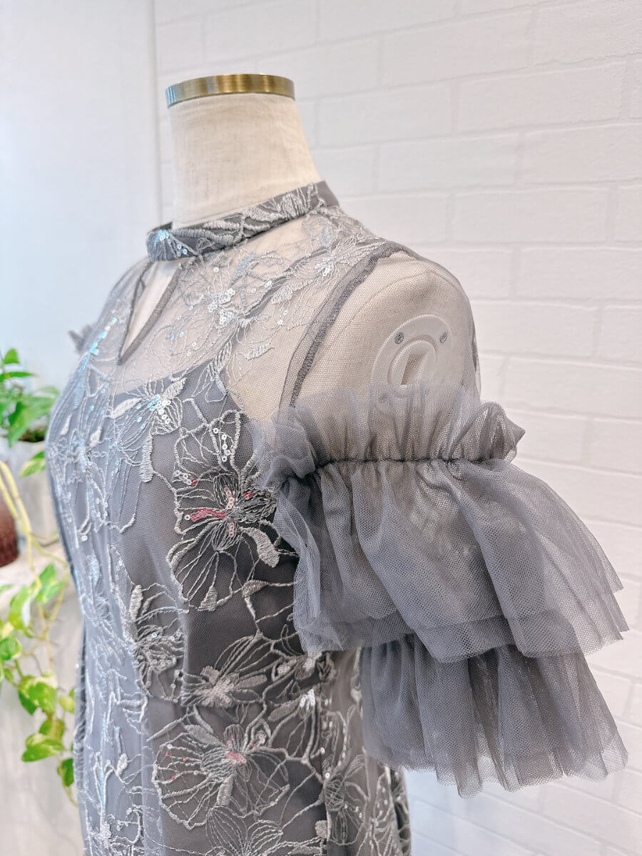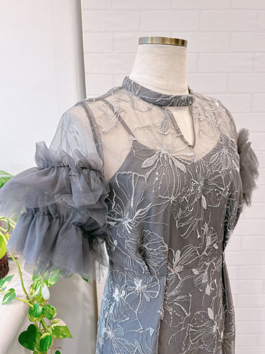 ◇商品について:大人シルエットのレースドレス。レース部分にはシルバーのスパンコールがデザインされていてさりげなく輝きます。袖のチュールも程よいボリューム感で着心地がよく、デコルテ部分の抜け感で首のつまり具合が苦手な方も着やすいドレスです。大人っぽいタイトシルエットもクールのおかげで体型を拾いにくいのが嬉しいドレスです。