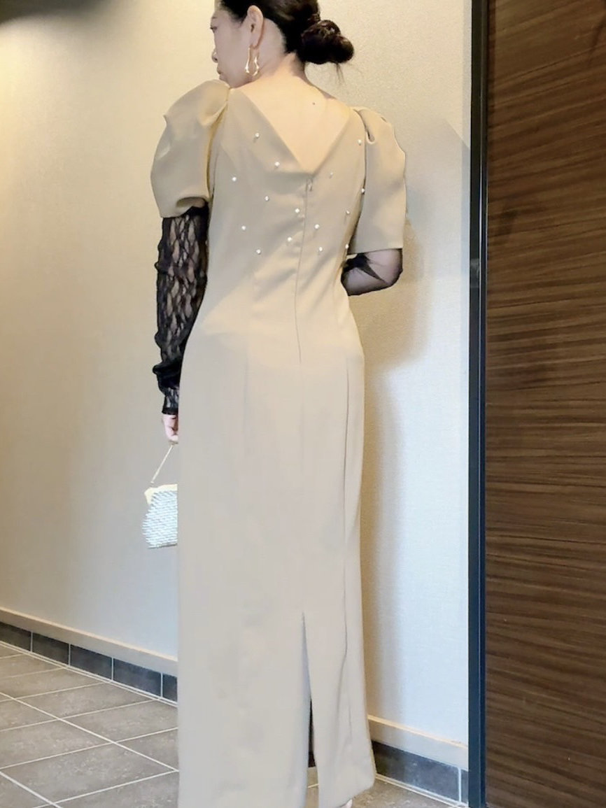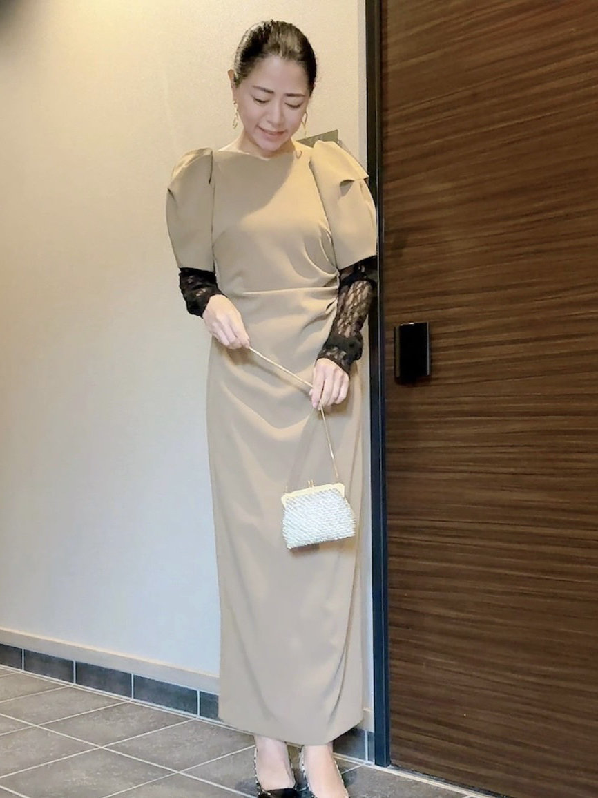 ◇商品について:落ち感のある素材でドレープの立体感とパフスリーブの上品なドレスです。レースとチュールのアームカバーがセットになっており、お好みで着用して雰囲気を楽しんで頂けます。Iラインシルエット、流れるようなドレープで体のラインを美しく見せながらも気になるお腹周りなどはカバーされます。浅めのネックラインなのでチョーカーなどもよく合います。