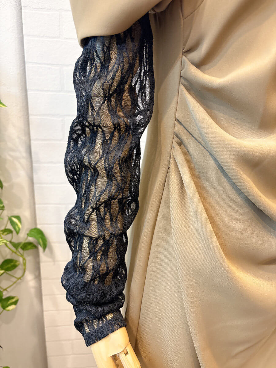 ◇商品について:落ち感のある素材でドレープの立体感とパフスリーブの上品なドレスです。レースとチュールのアームカバーがセットになっており、お好みで着用して雰囲気を楽しんで頂けます。Iラインシルエット、流れるようなドレープで体のラインを美しく見せながらも気になるお腹周りなどはカバーされます。浅めのネックラインなのでチョーカーなどもよく合います。
