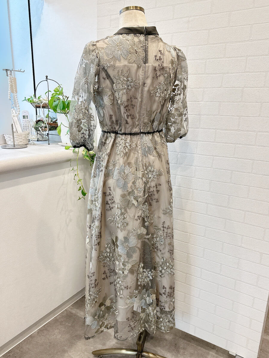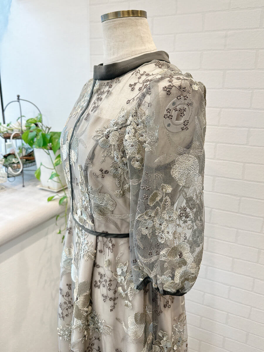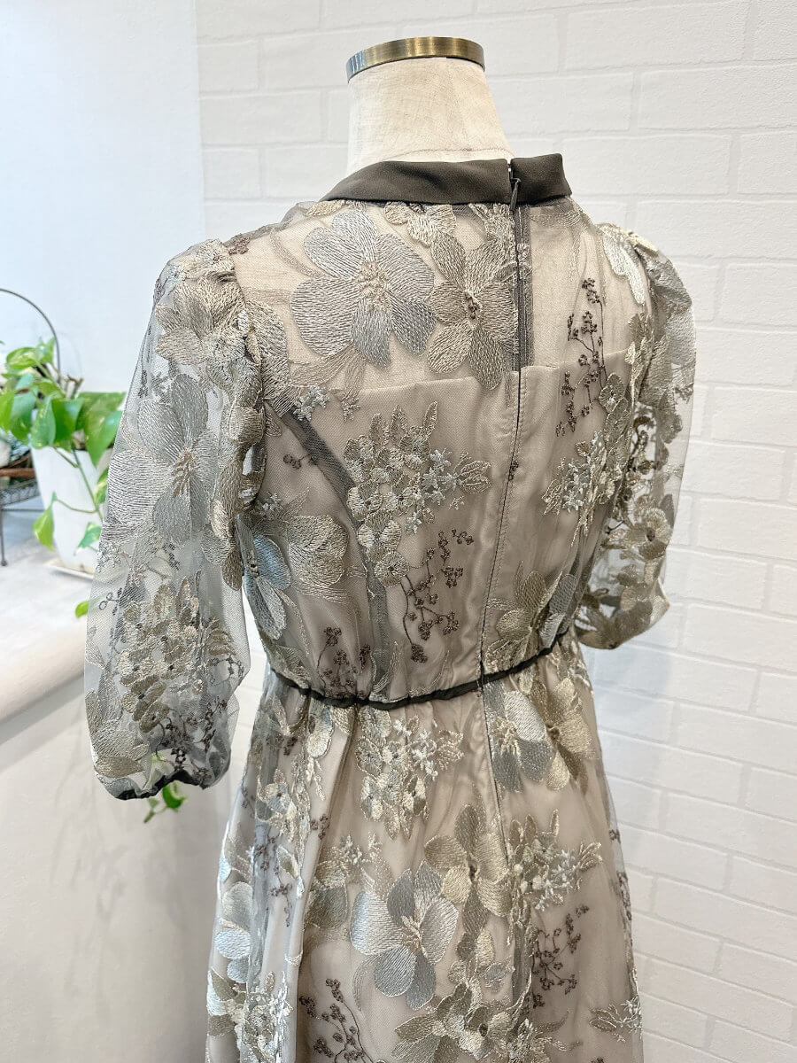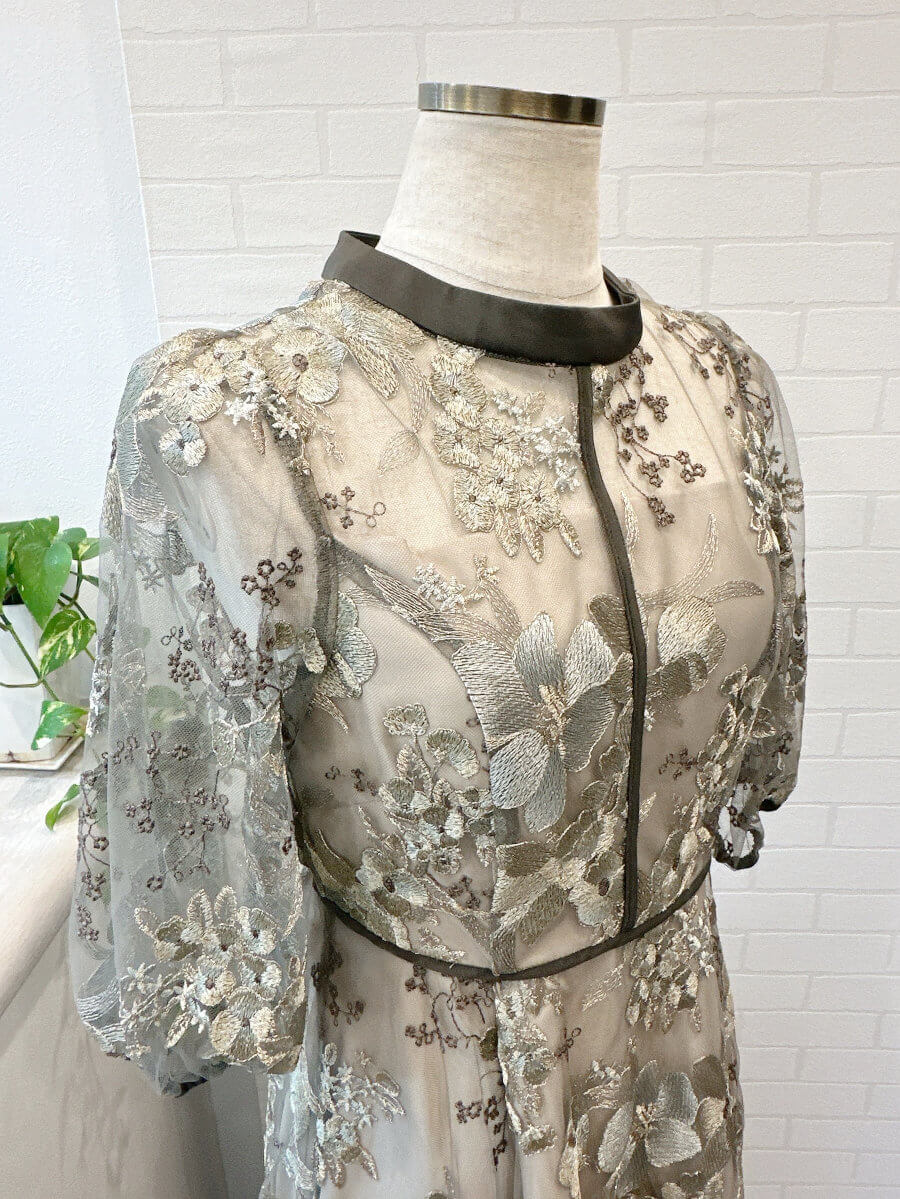 ◇商品について:光沢のある刺繍糸でデザインされた華やかなドレスです。ウエストと袖口にはゴムが採用されており伸縮性があります。切り返し部分に色味のあるステッチを入れることでメリハリがあります。人気のくすみ系のお色で華やかさの中に上品さがあります。レース部分は透け感がありますので下着にはお気を付けください。