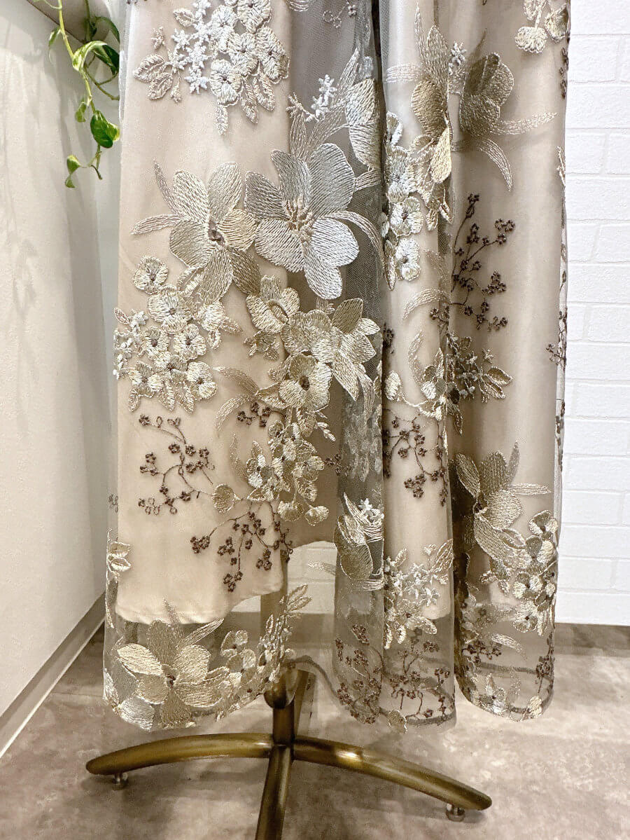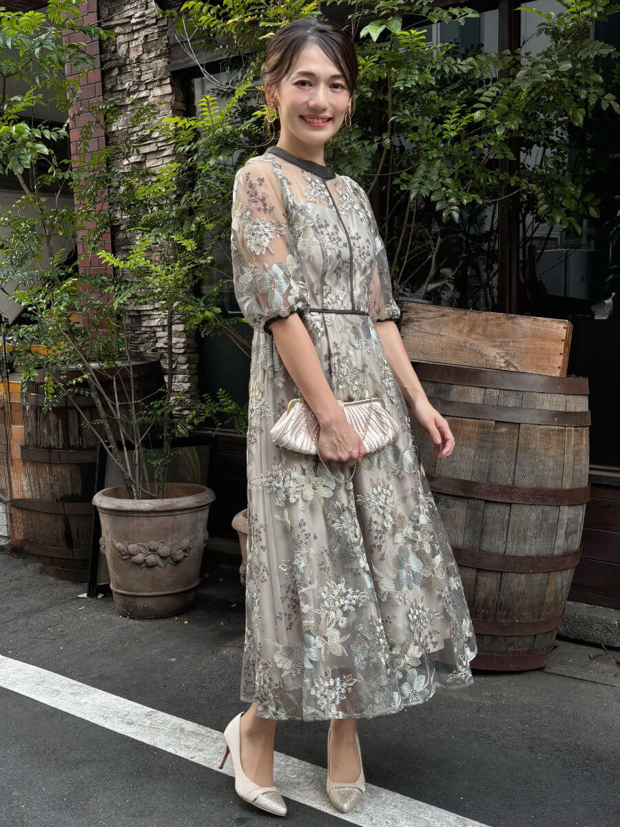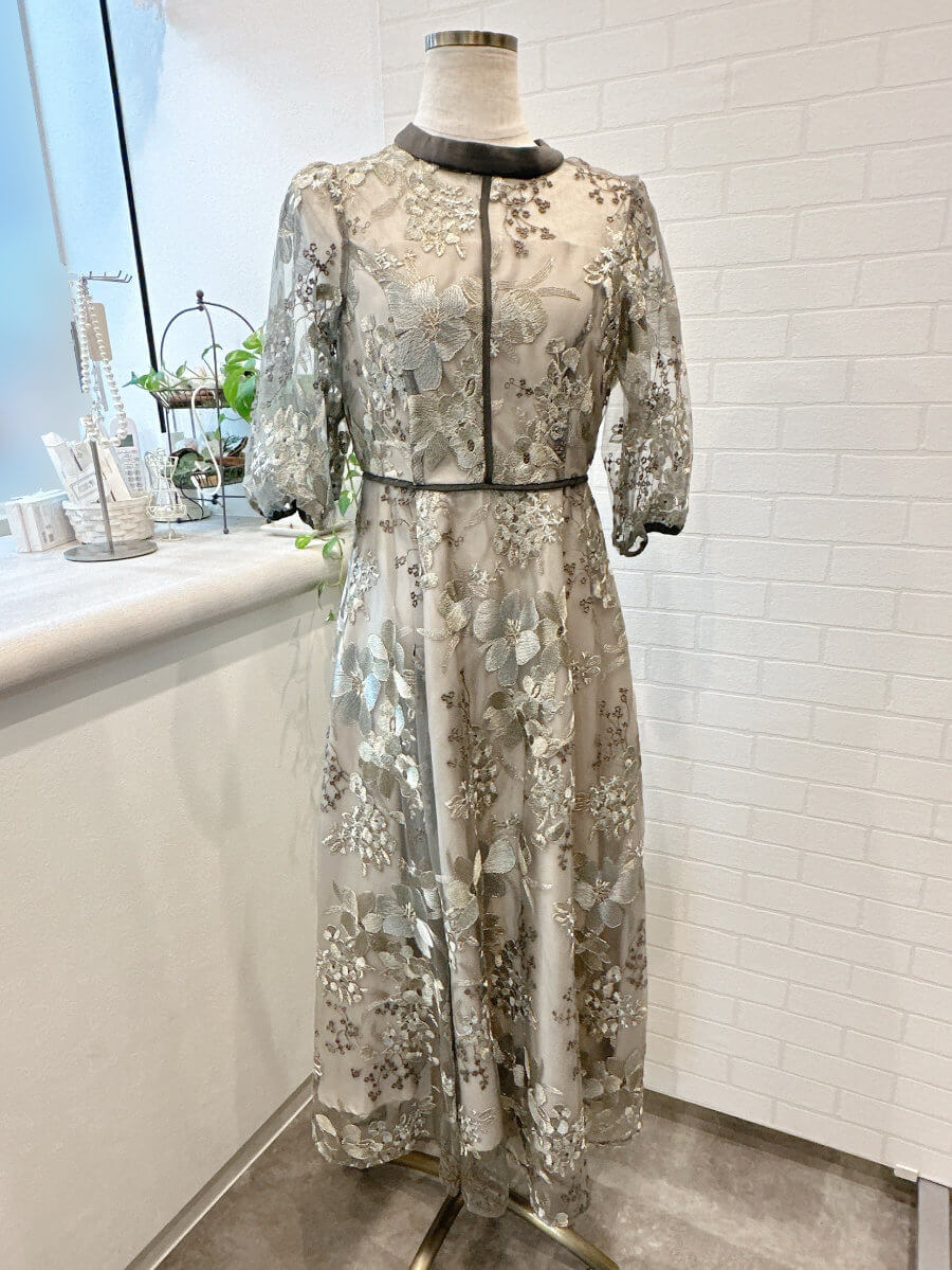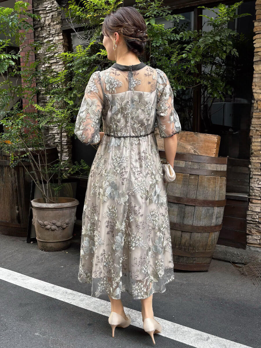 ◇商品について:光沢のある刺繍糸でデザインされた華やかなドレスです。ウエストと袖口にはゴムが採用されており伸縮性があります。切り返し部分に色味のあるステッチを入れることでメリハリがあります。人気のくすみ系のお色で華やかさの中に上品さがあります。レース部分は透け感がありますので下着にはお気を付けください。