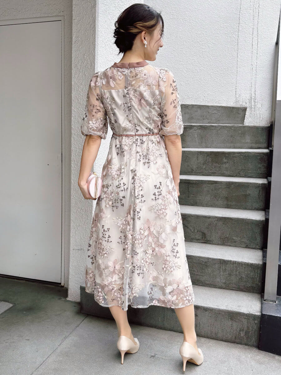 ◇商品について:光沢のある刺繍糸でデザインされた華やかなドレスです。ウエストと袖口にはゴムが採用されており伸縮性があります。切り返し部分に色味のあるステッチを入れることでメリハリがあります。人気のくすみ系のお色で華やかさの中に上品さがあります。レース部分は透け感がありますので下着にはお気を付けください。