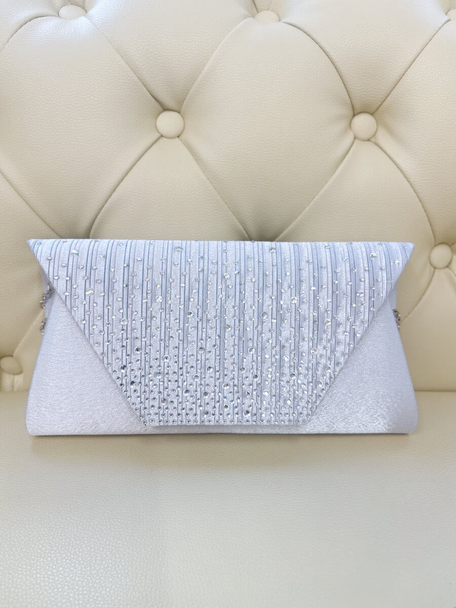 ◇カラー:シルバー ◇大きさ:横26cm/縦13cm ◇商品について:光沢のあるシルバーの生地にシルバーのラインストーンのデザインです。ご祝儀袋など必要最低限が収納可能なパーティバッグです。 シルバーのチェーンが付属します。