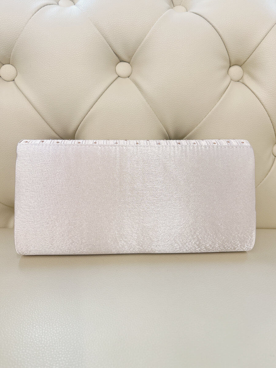 ◇カラー:アプリコットベージュ ◇大きさ:横26cm/縦13cm ◇商品について:光沢のあるシャンパンベージュの生地にアプリコットのラインストーンのデザインです。ご祝儀袋など必要最低限が収納可能なパーティバッグです。ゴールドのチェーンが付属します。