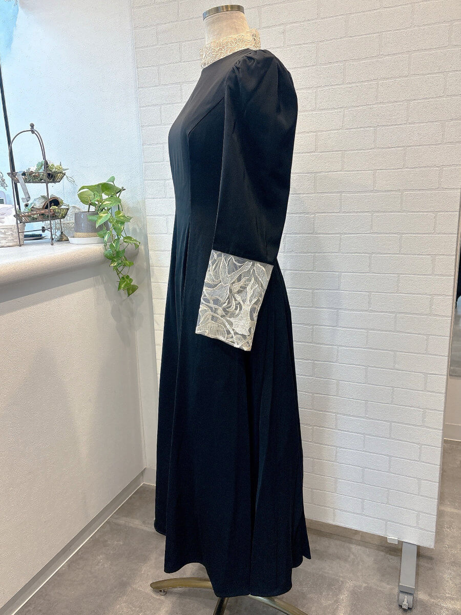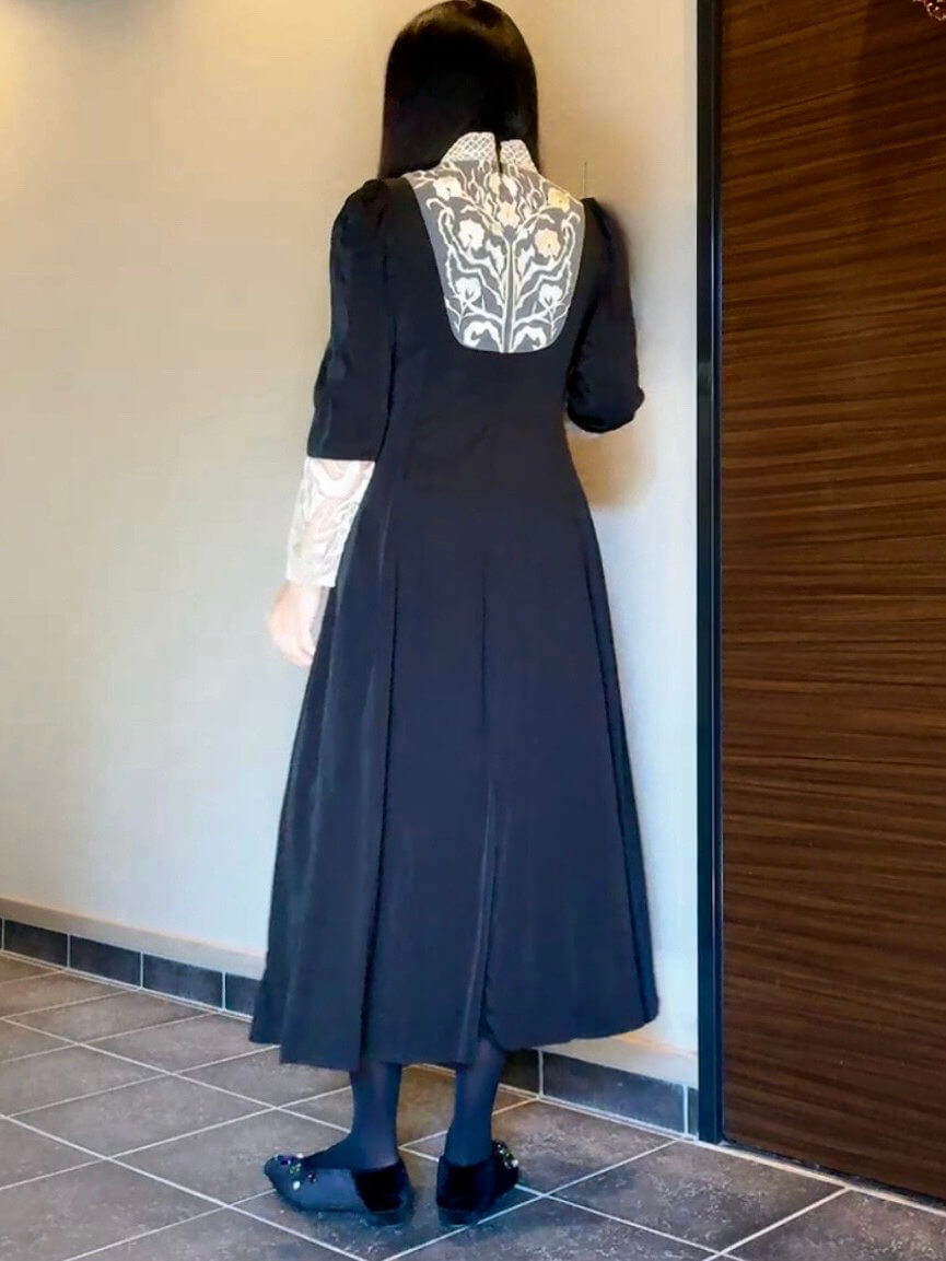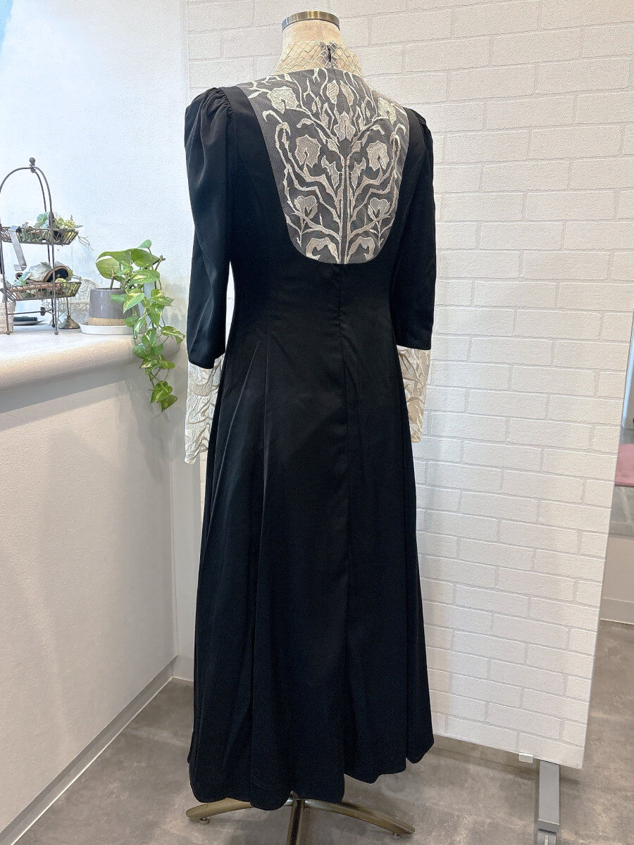 ◇商品について:マットなサテン生地とレトロな刺繍がポイントのフレアドレスです。モードとクラシカルをミックスさせたようなデザインが上品で目をひきます。チュールをインナーに重ねることでメリハリのあるシルエットになっています。