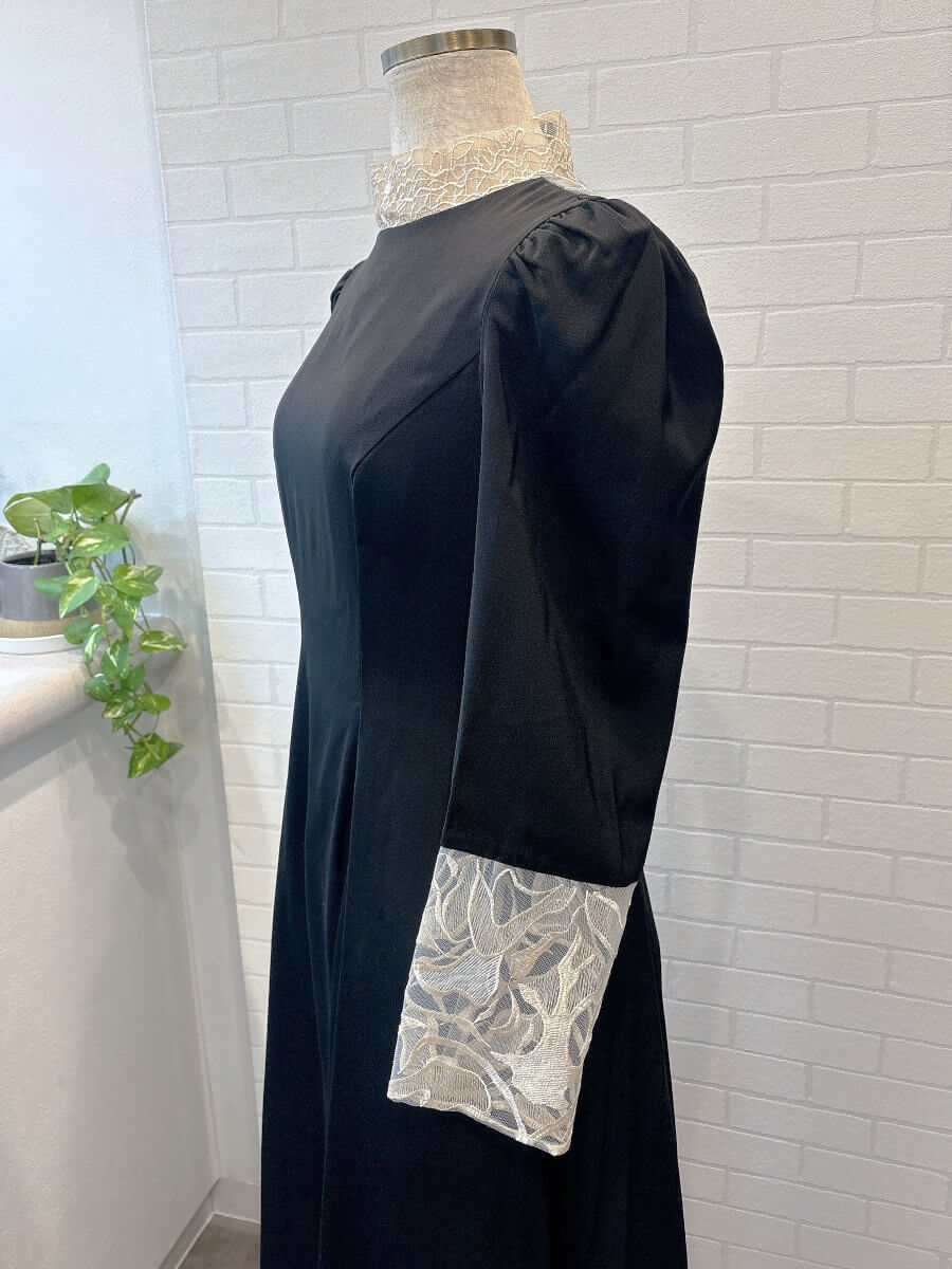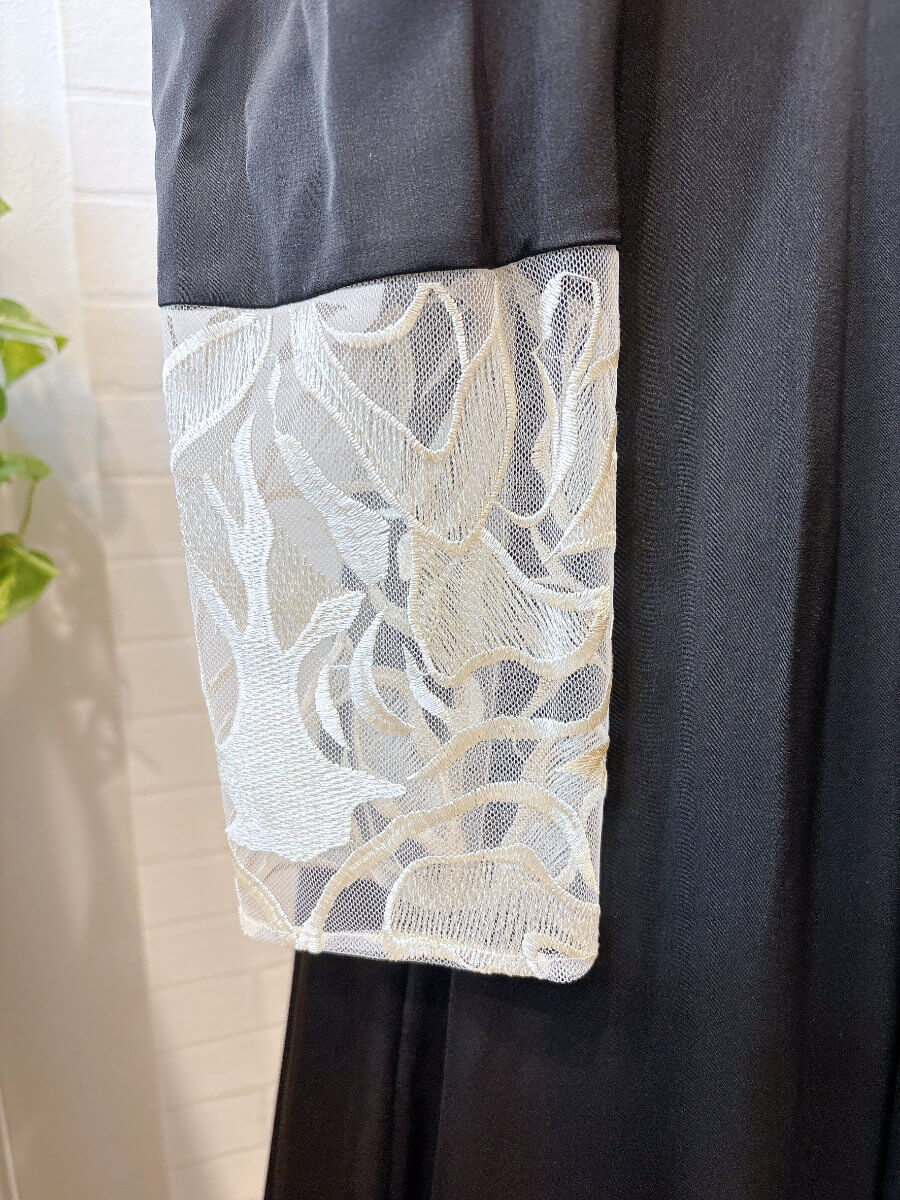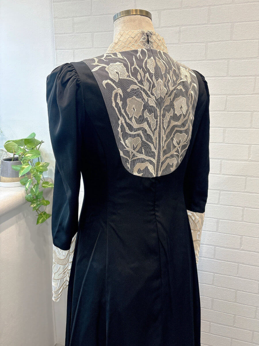 ◇商品について:マットなサテン生地とレトロな刺繍がポイントのフレアドレスです。モードとクラシカルをミックスさせたようなデザインが上品で目をひきます。チュールをインナーに重ねることでメリハリのあるシルエットになっています。