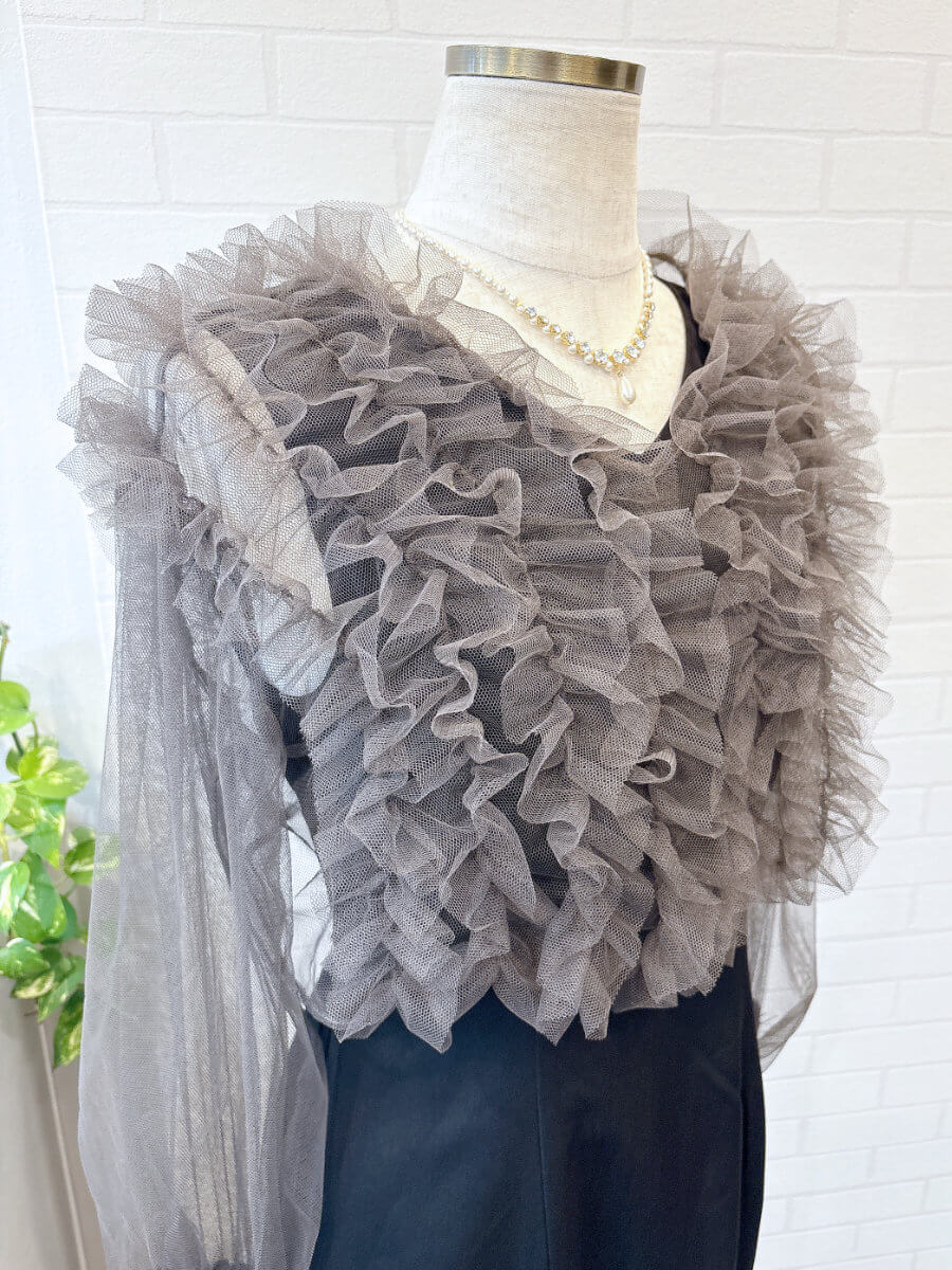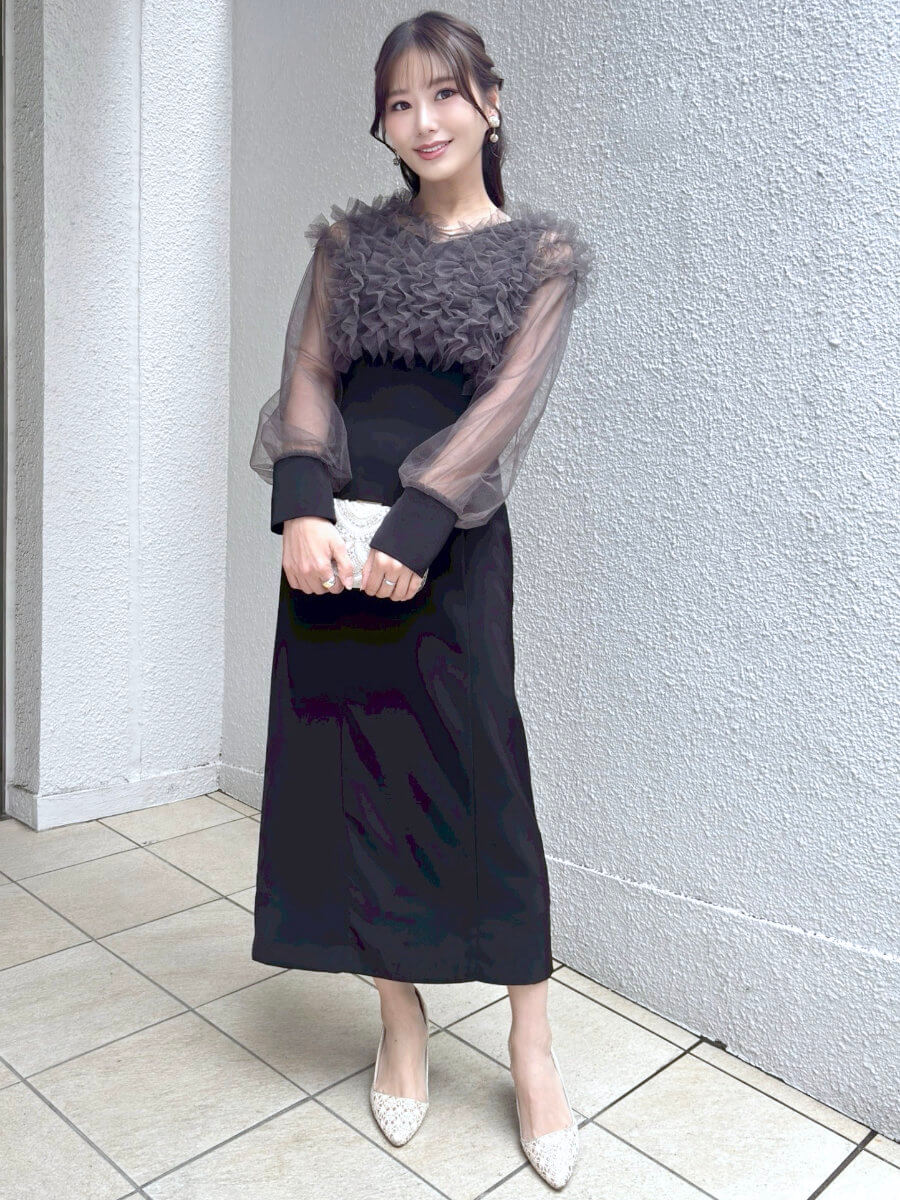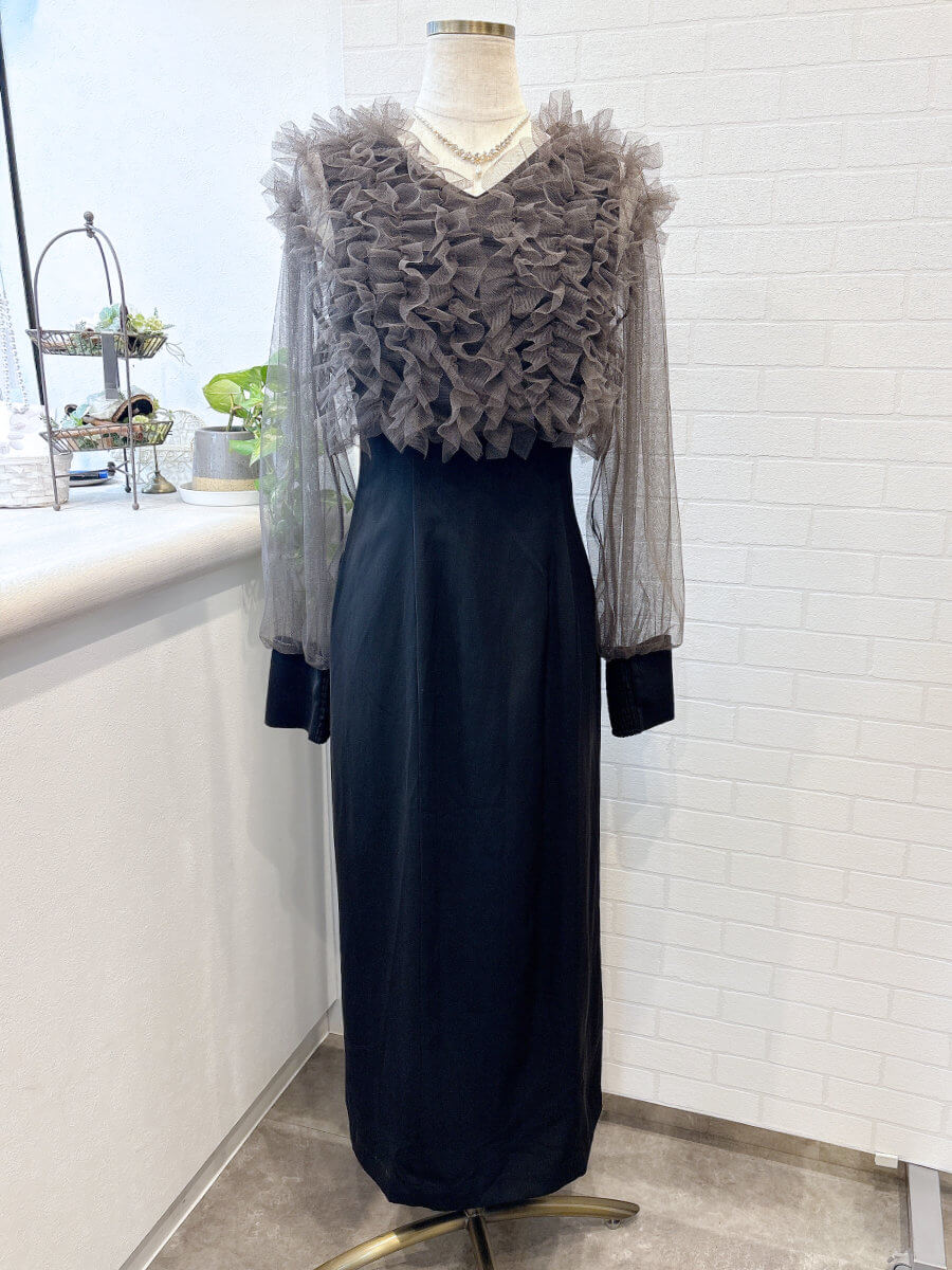 ◇商品について:ワンピースとフリルブラウスのセットアップドレスです。縦フリルのチュールで縦ラインを強調しチュールにありがちなボリュームをダウン。ロングスリーブなので腕回りもうまくカバーされます。ワンピースは肩部分もしっかり生地があるので下着を気にせずに着用できるのが嬉しい。レースアップになっており着用される方に合わせてサイズ調整が可能で綺麗なシルエットをだすことができます。露出が控え目なので幅広いシーンで活躍するドレスです。
